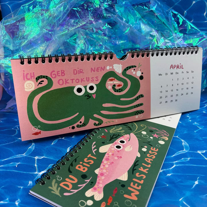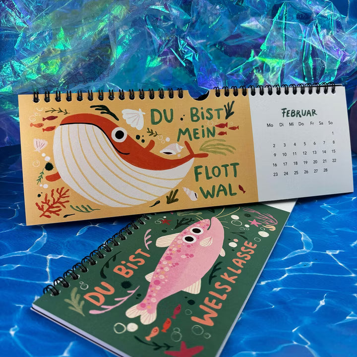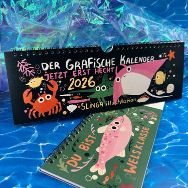 Der graFische Kalender 2026 von Slinga begleitet dich Monat für Monat mit 12 charmanten Unterwasserfreunden, die dir liebevolle Komplimente machen und dich mit Wortspielen zum Schmunzeln bringen.