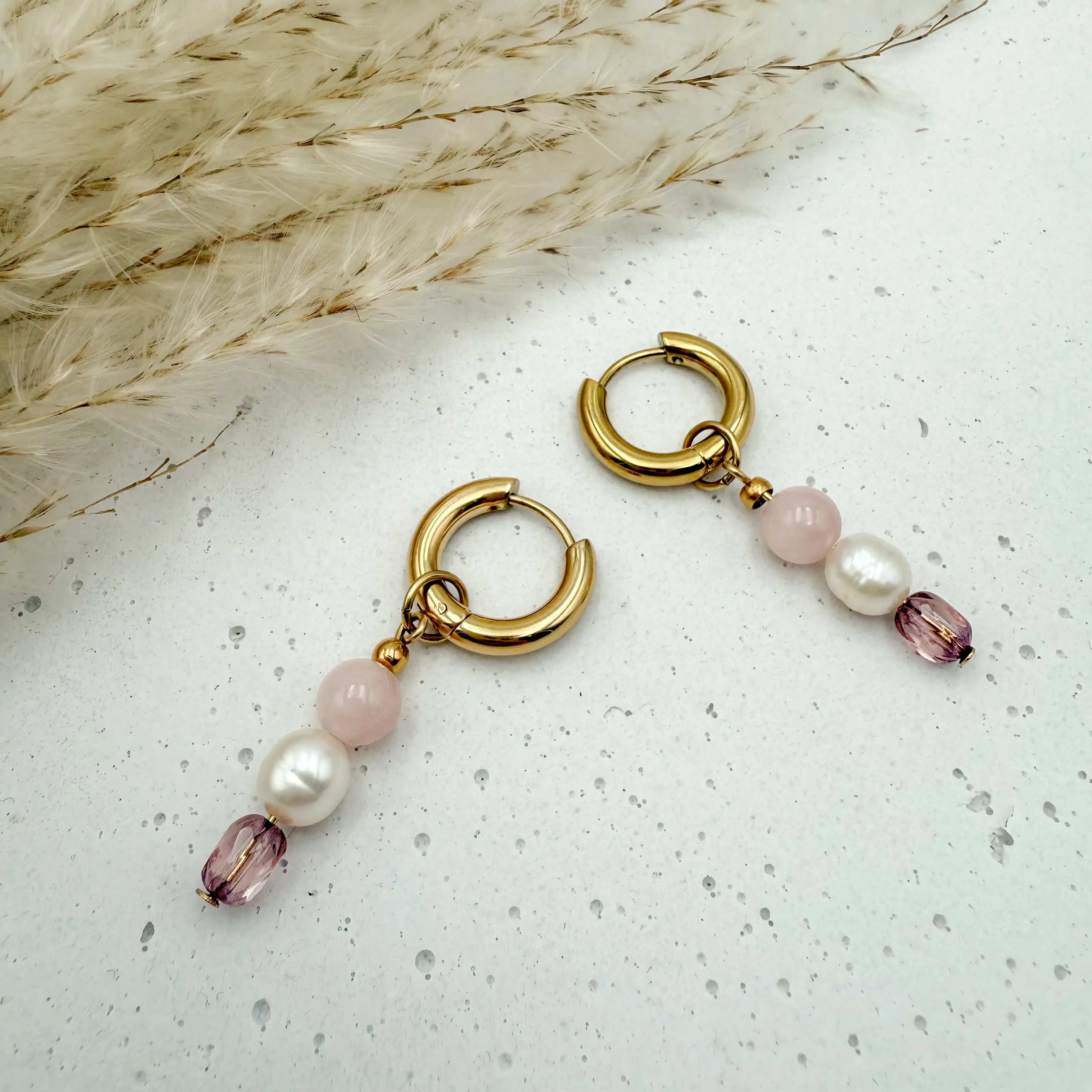 Die Aelora Gold Ohrringe von Vagabundobjects vereinen moderne Leichtigkeit mit sanften, femininen Farben. Zart schimmernde Süßwasserperlen treffen auf Natursteine in rosa und altrosa, kombiniert mit hochwertigem vergoldetem Edelstahl. Das Design ist dezent, edel und zugleich voller Persönlichkeit – ideal für alle, die hängende Perlenohrringe mit einem soften Farbspiel lieben. ✨🤍🌸