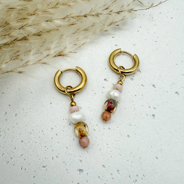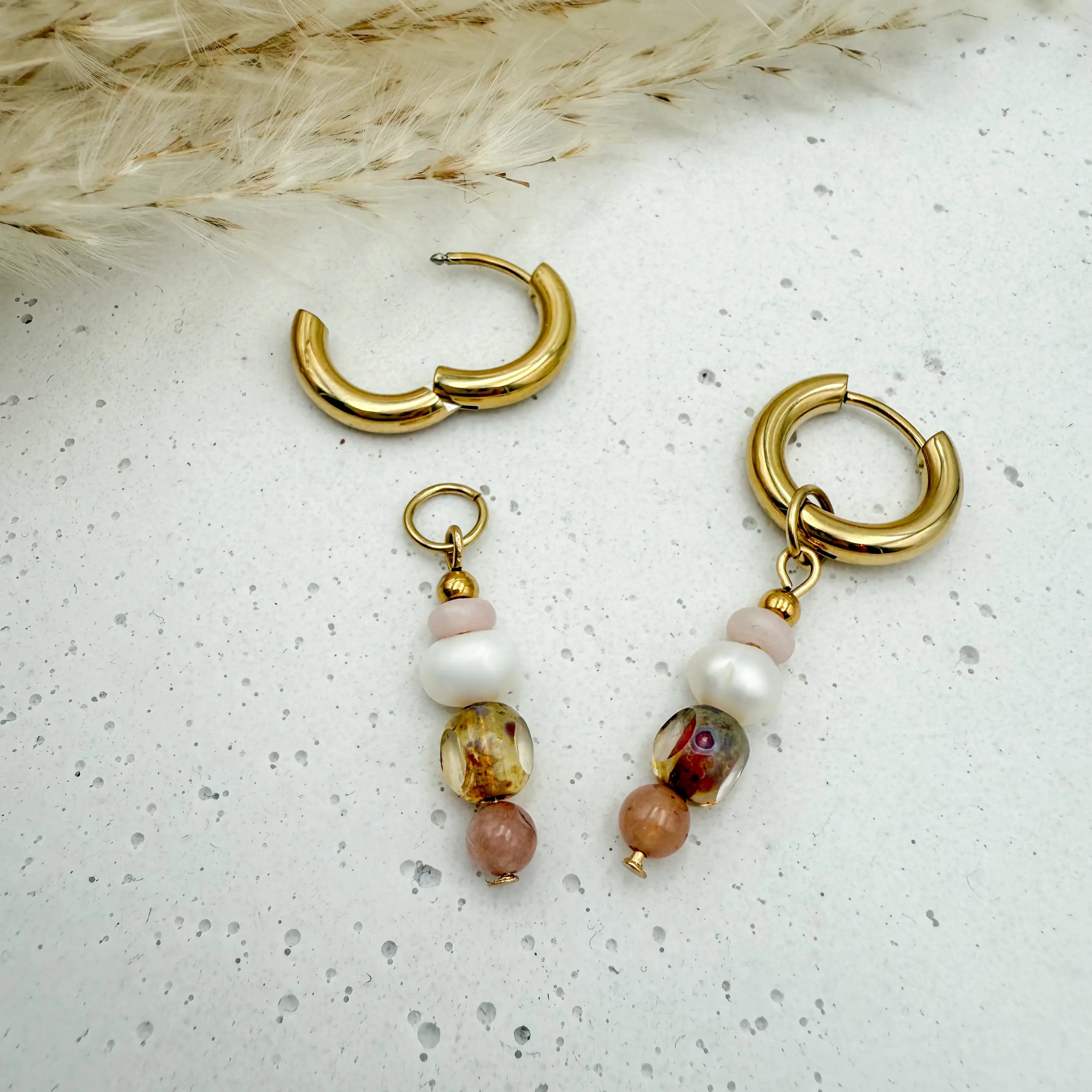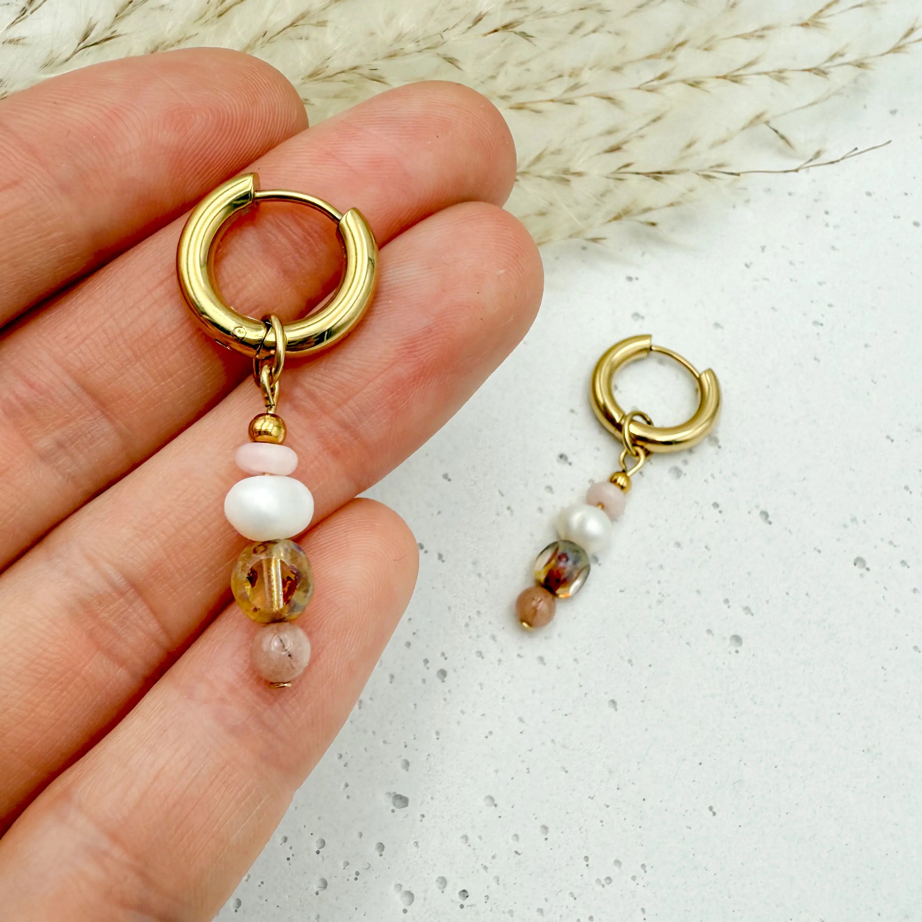Die Ohrringe Elire Gold verbinden moderne Eleganz mit der natürlichen Schönheit. In dieser besonderen Kombination treffen zarte Süßwasserperlen, feine Natursteine und 18K vergoldeter Edelstahl aufeinander – ein Design, das gleichzeitig zeitlos, feminin und selbstbewusst wirkt.