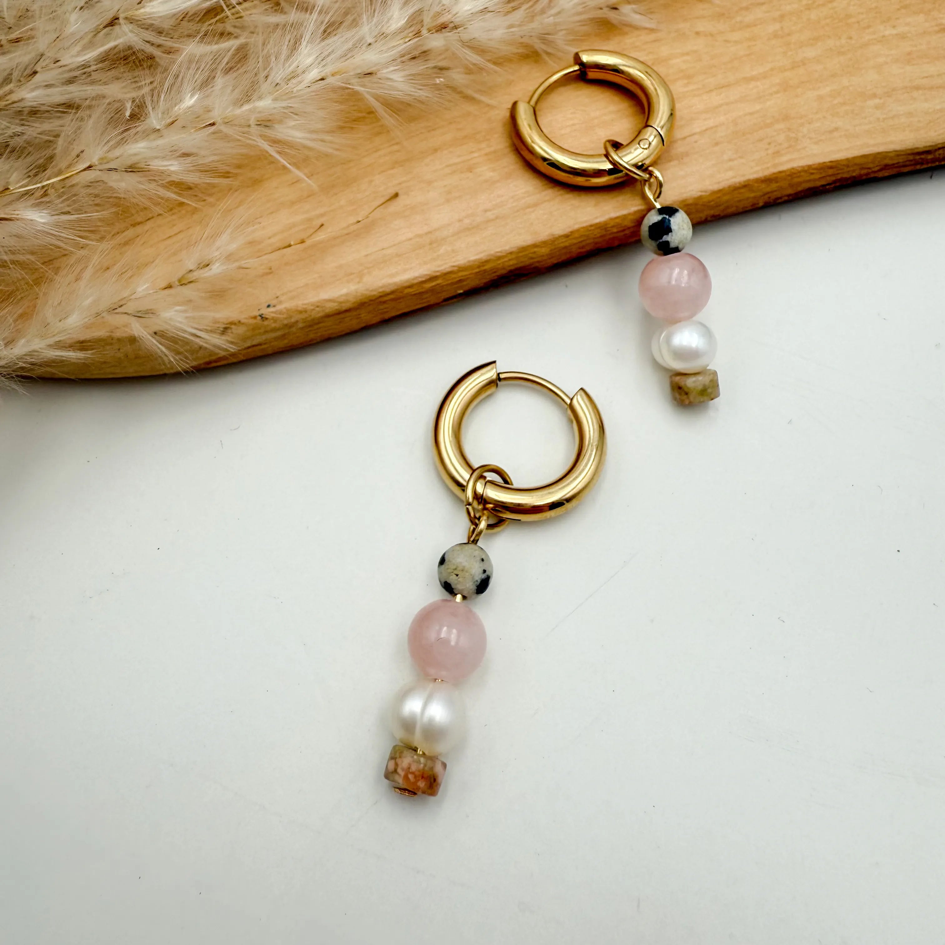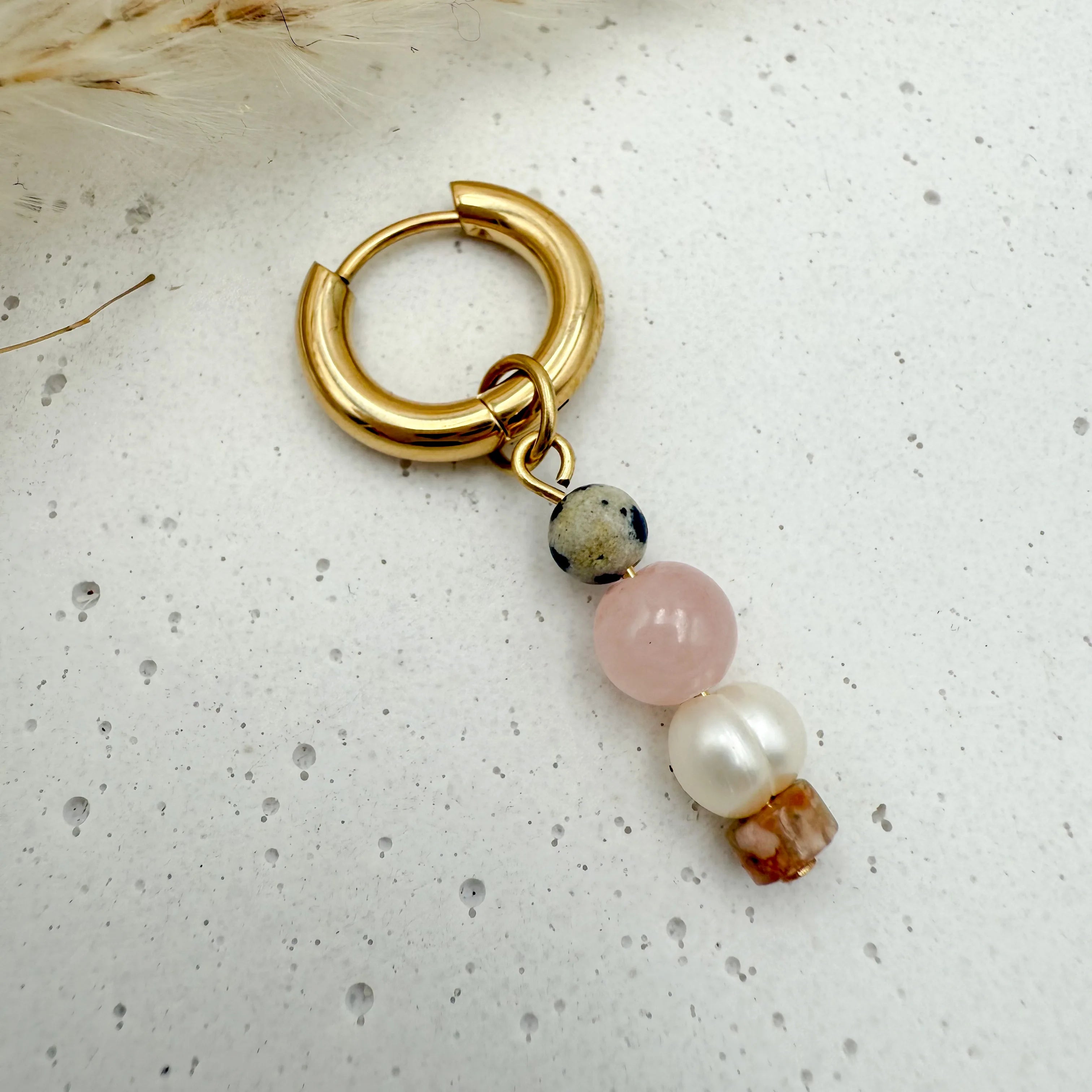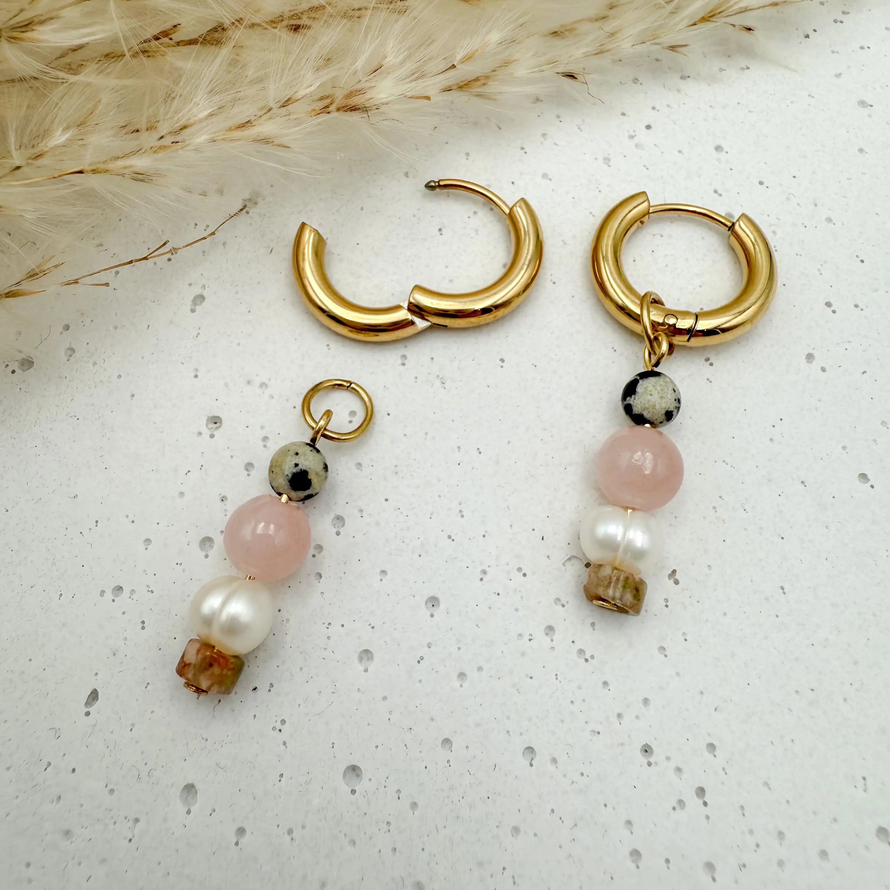 Die Selune Gold Ohrringe von Vagabundobjects verbinden vergoldeten Edelstahl, facettenreiche Natursteine und zarte Süßwasserperlen zu einem femininen und modernen Design. Unterhalb des Hauptelements schwingt eine kleine Dalmatinerjaspis-Perle, ergänzt durch rosa Naturstein und eine echte Süßwasserperle – ein stilvolles Zusammenspiel von Struktur, Farbe und Leichtigkeit. ✨🤍🌸🖤
