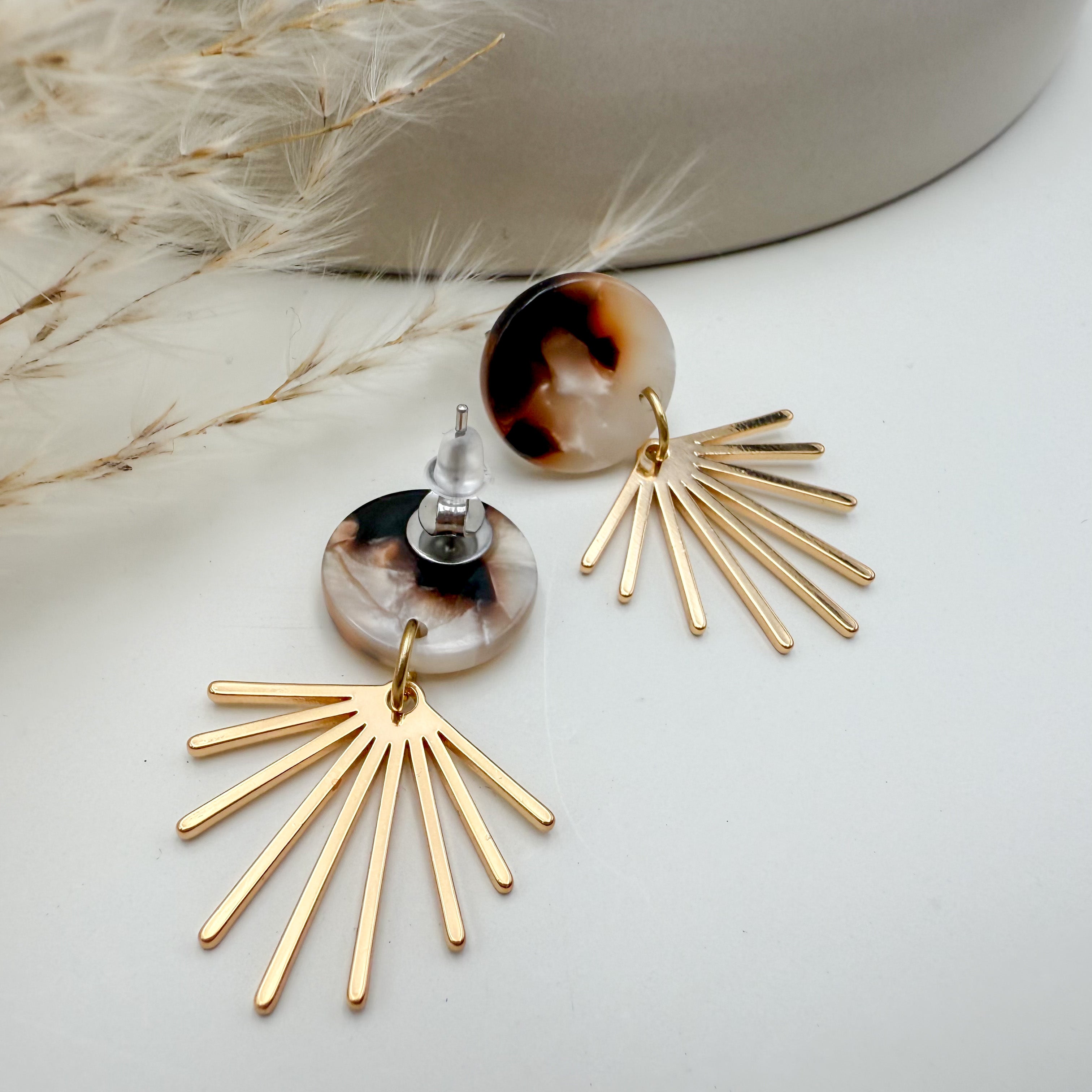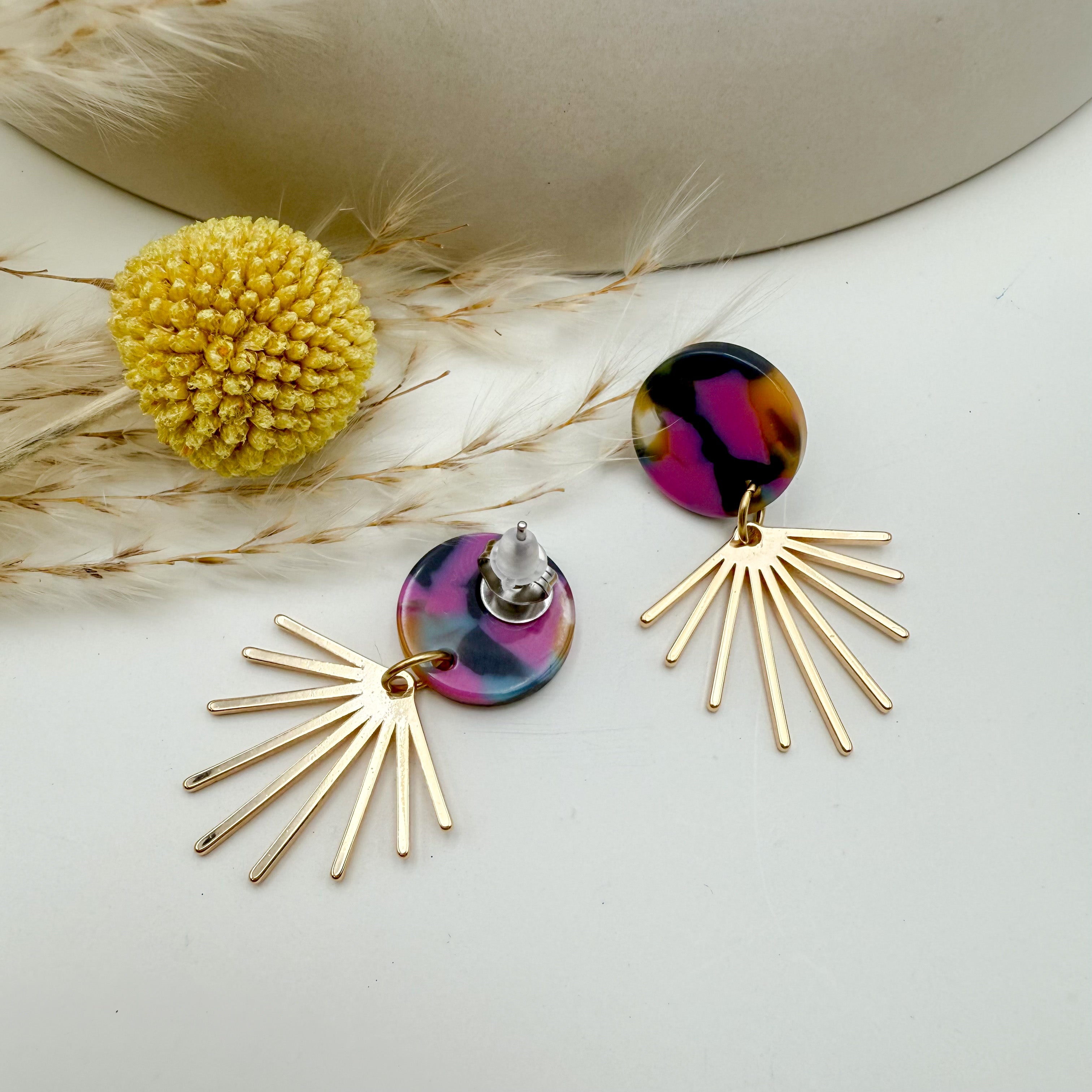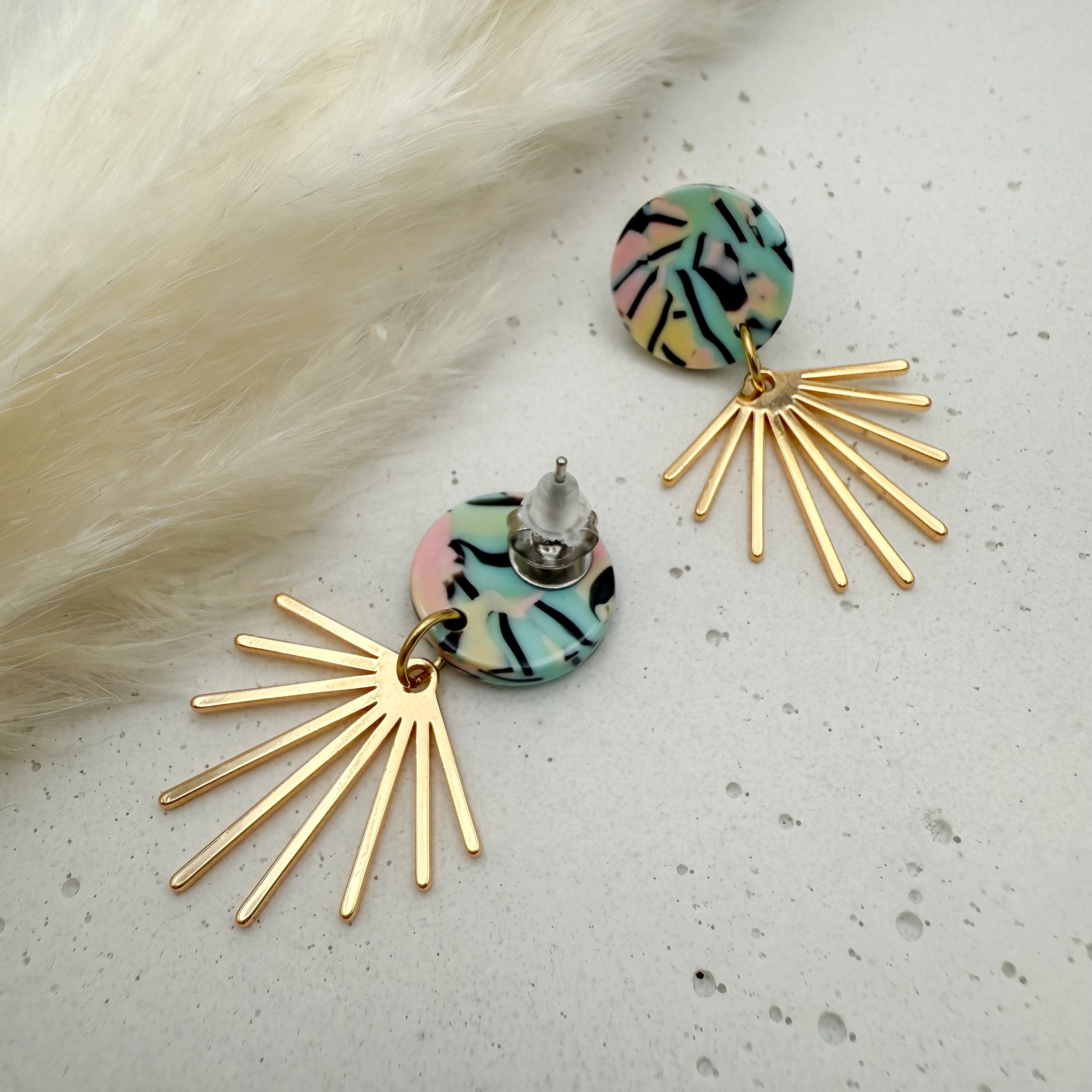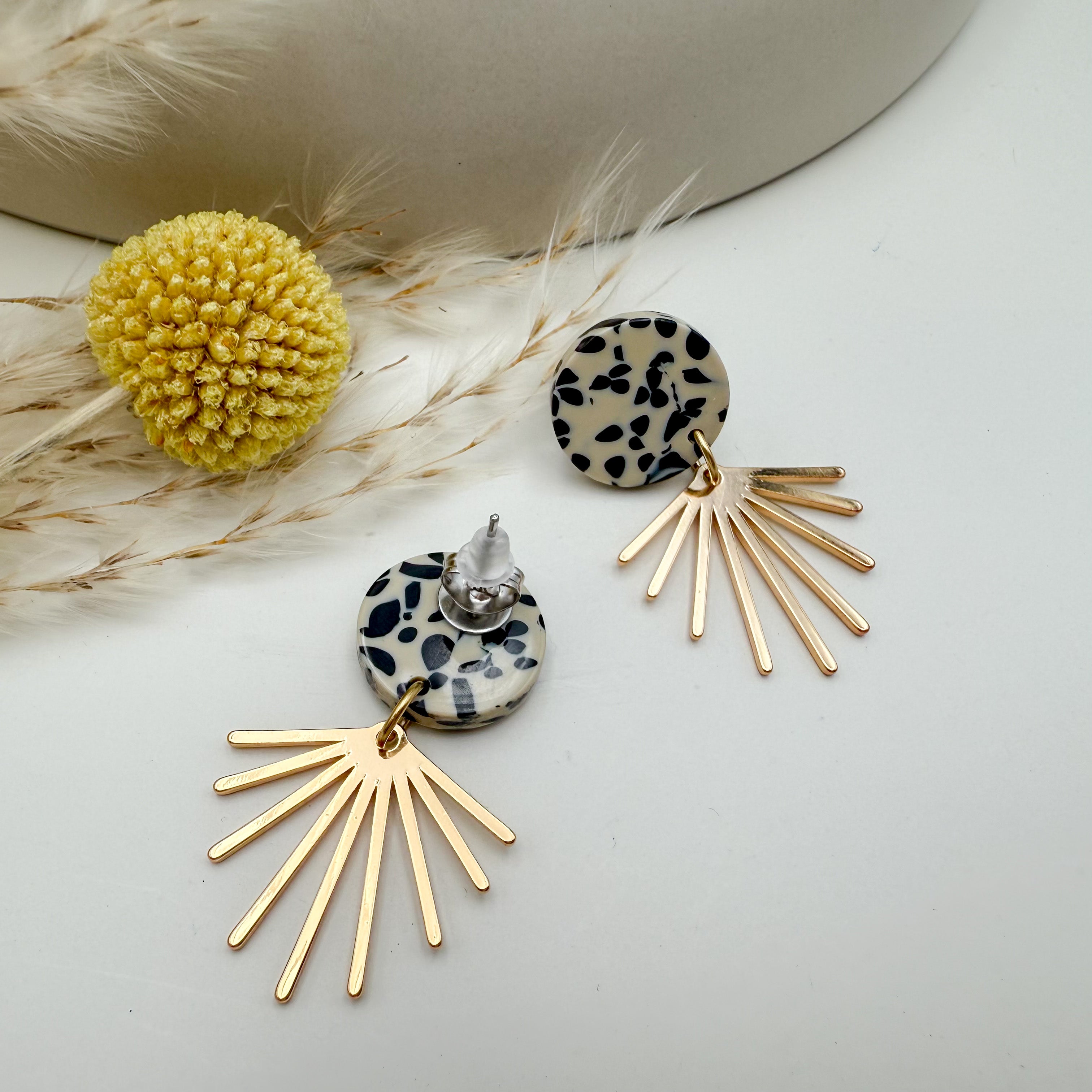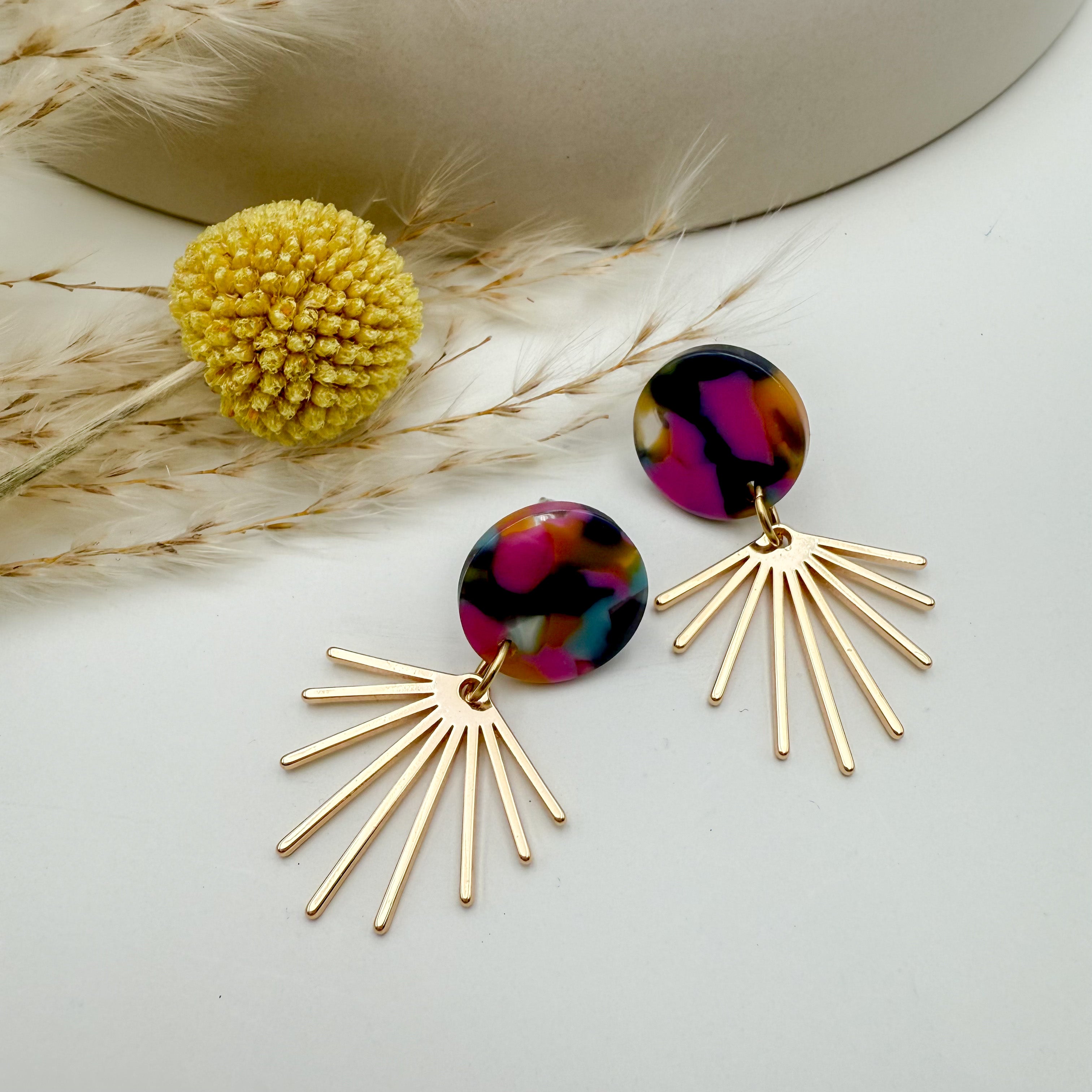 Stilvolle Ohrstecker Indi mit Kopfteil aus Acetat oder Polymer Clay & Anhänger aus vergoldetem Messing von Vagabundobjects.