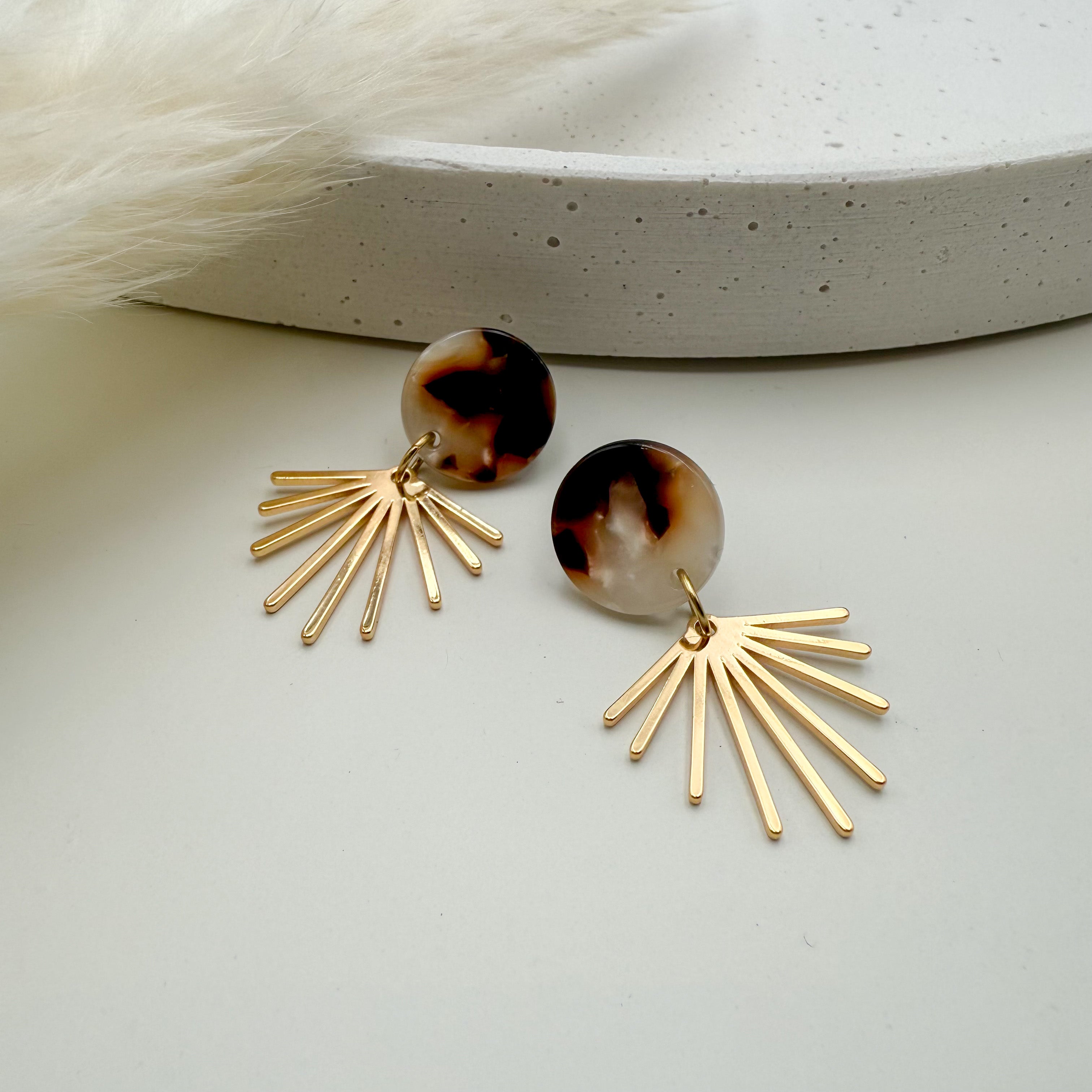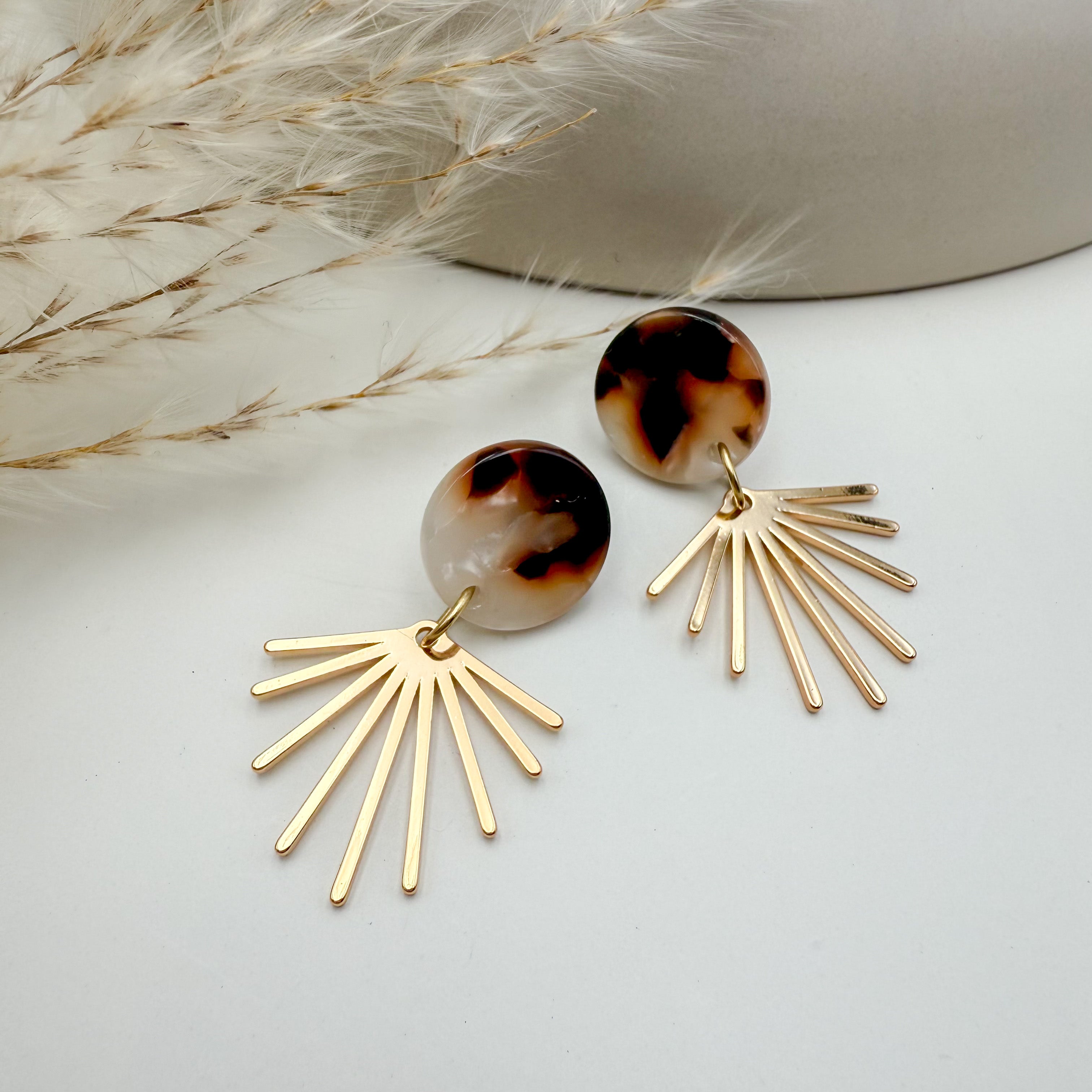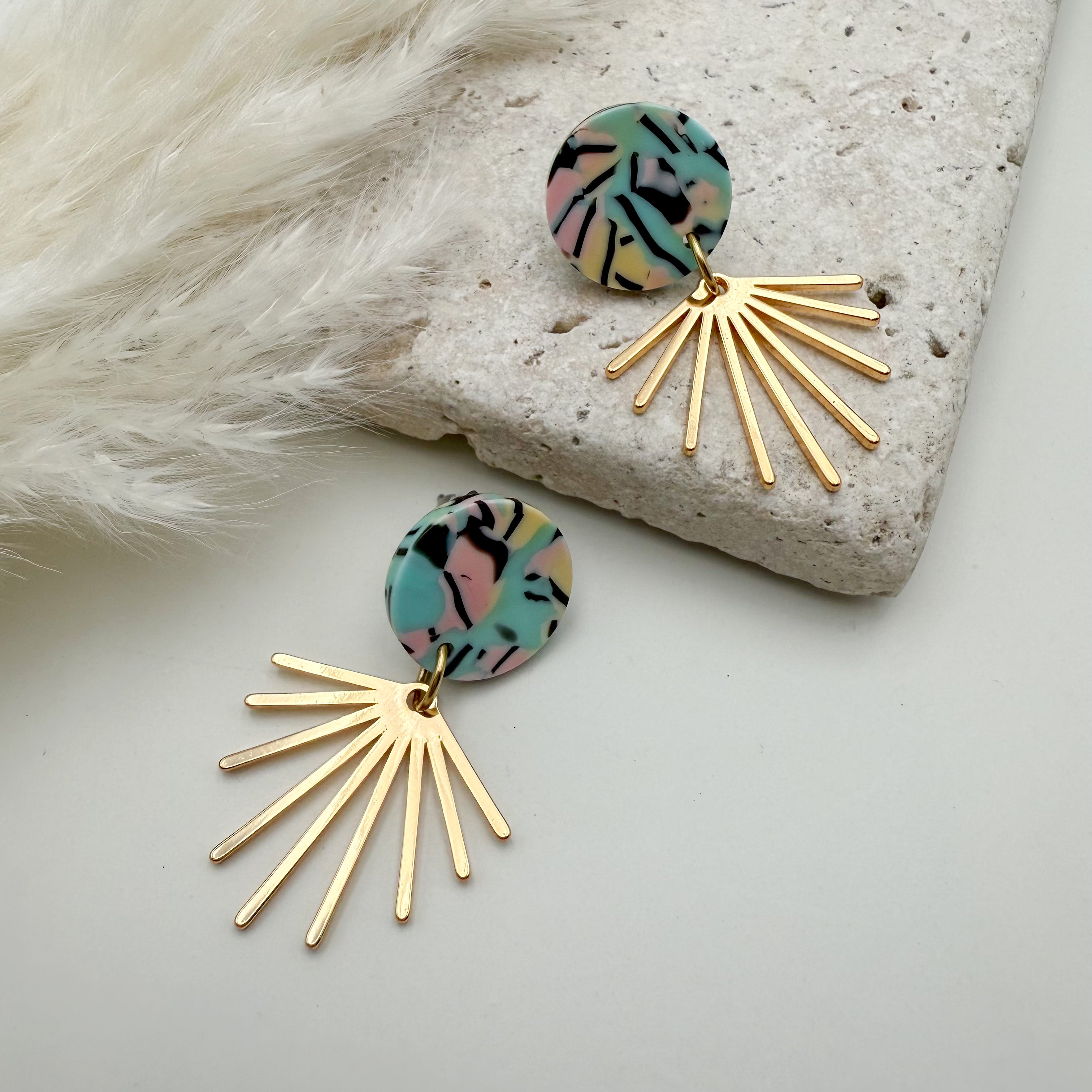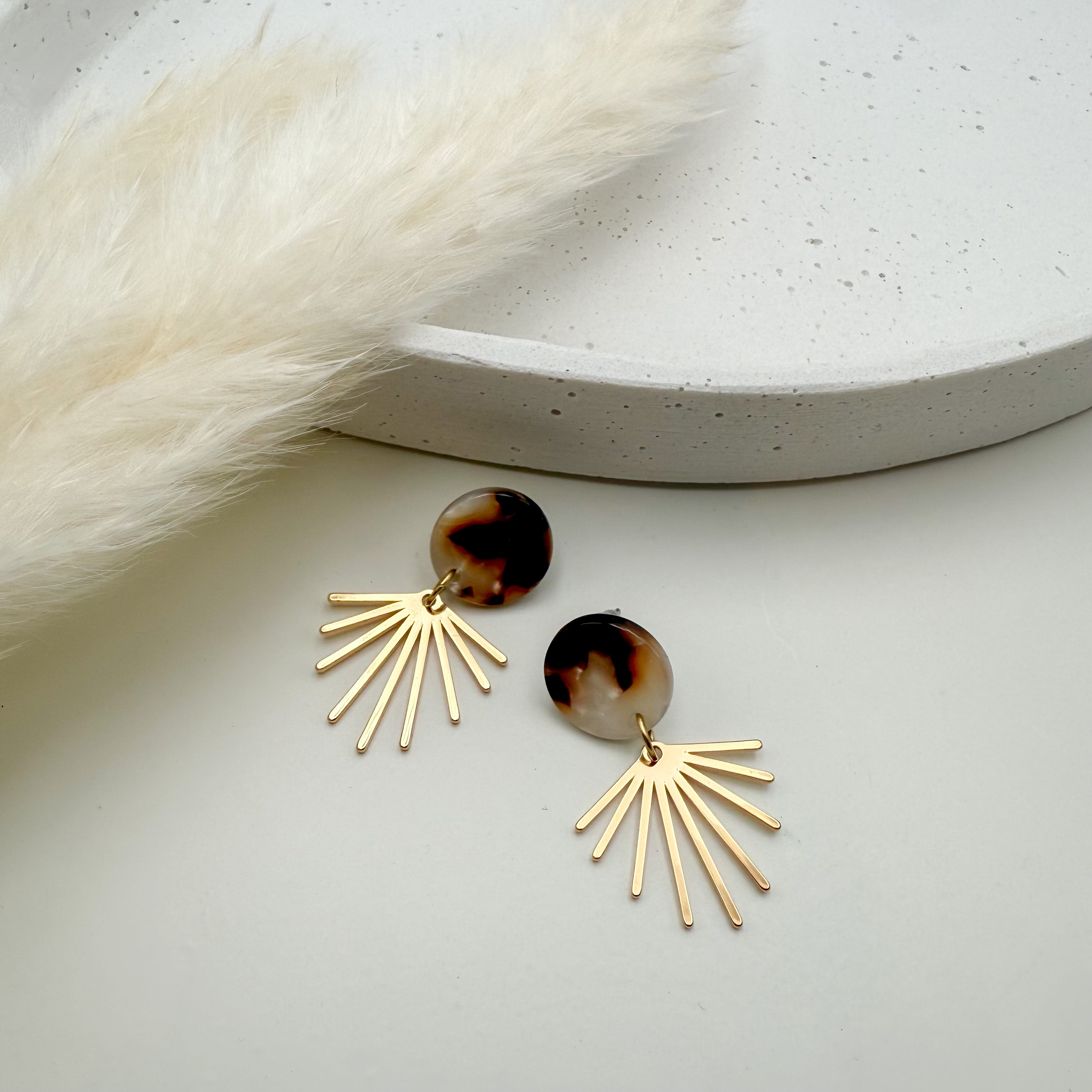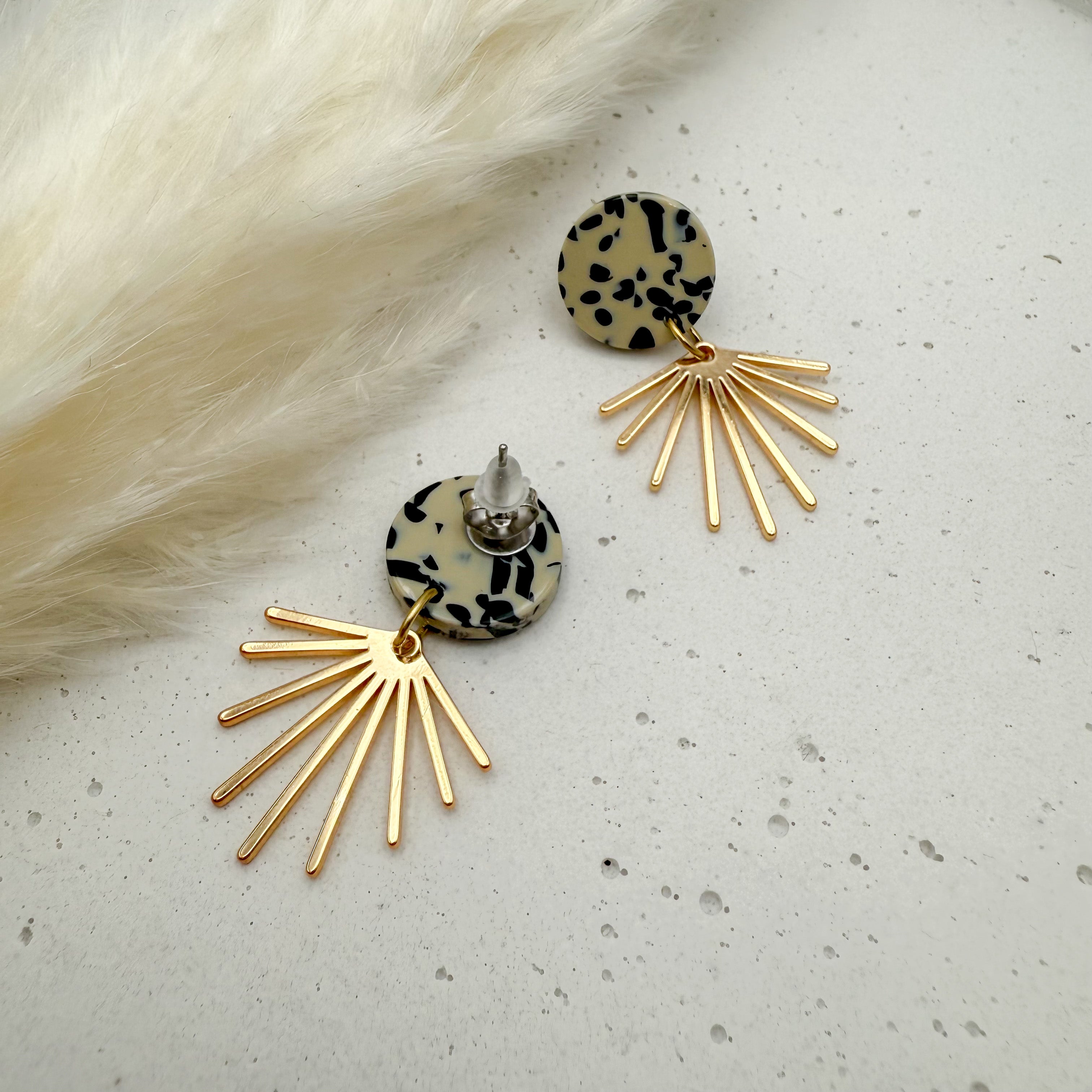 Stilvolle Ohrstecker Indi mit Kopfteil aus Acetat oder Polymer Clay & Anhänger aus vergoldetem Messing von Vagabundobjects.