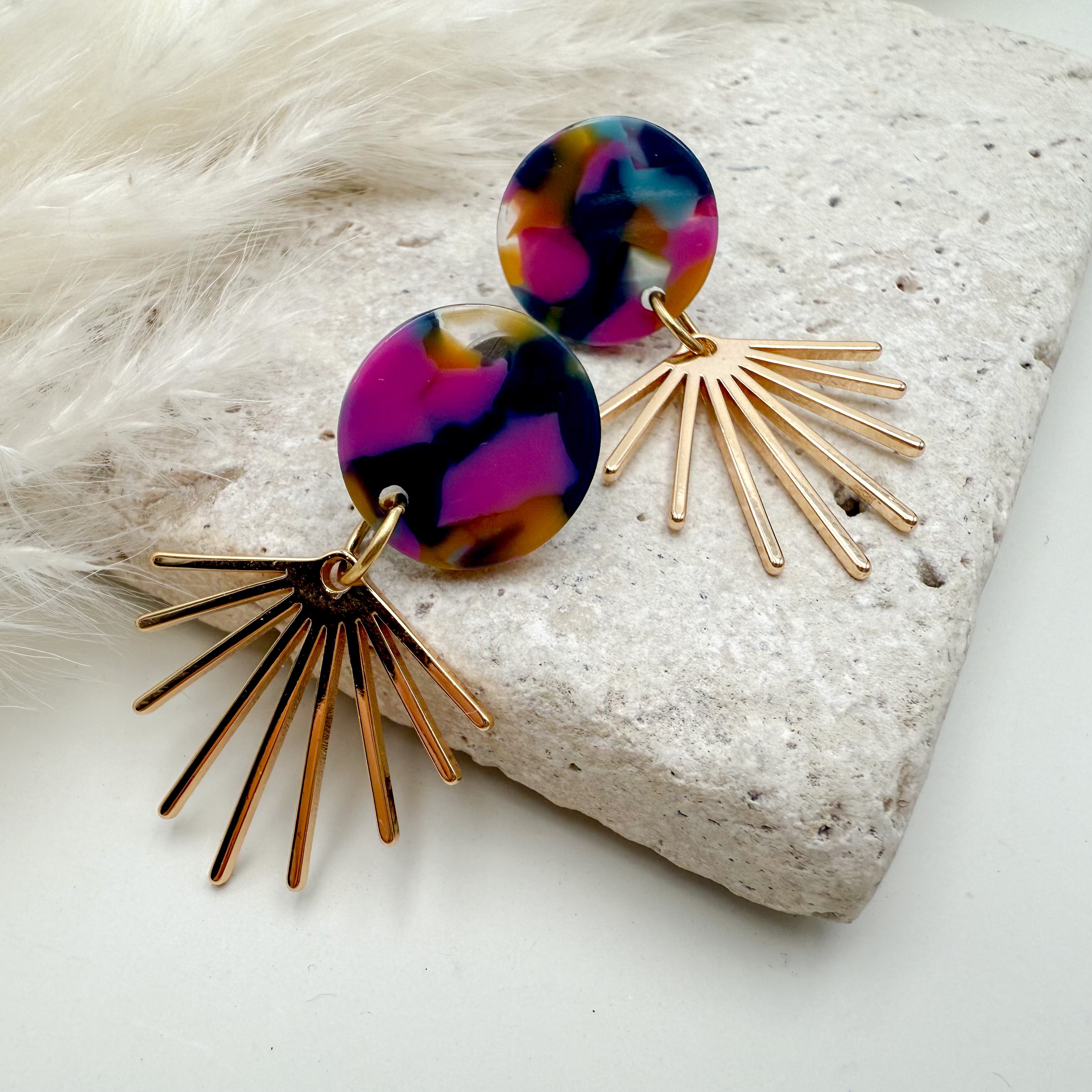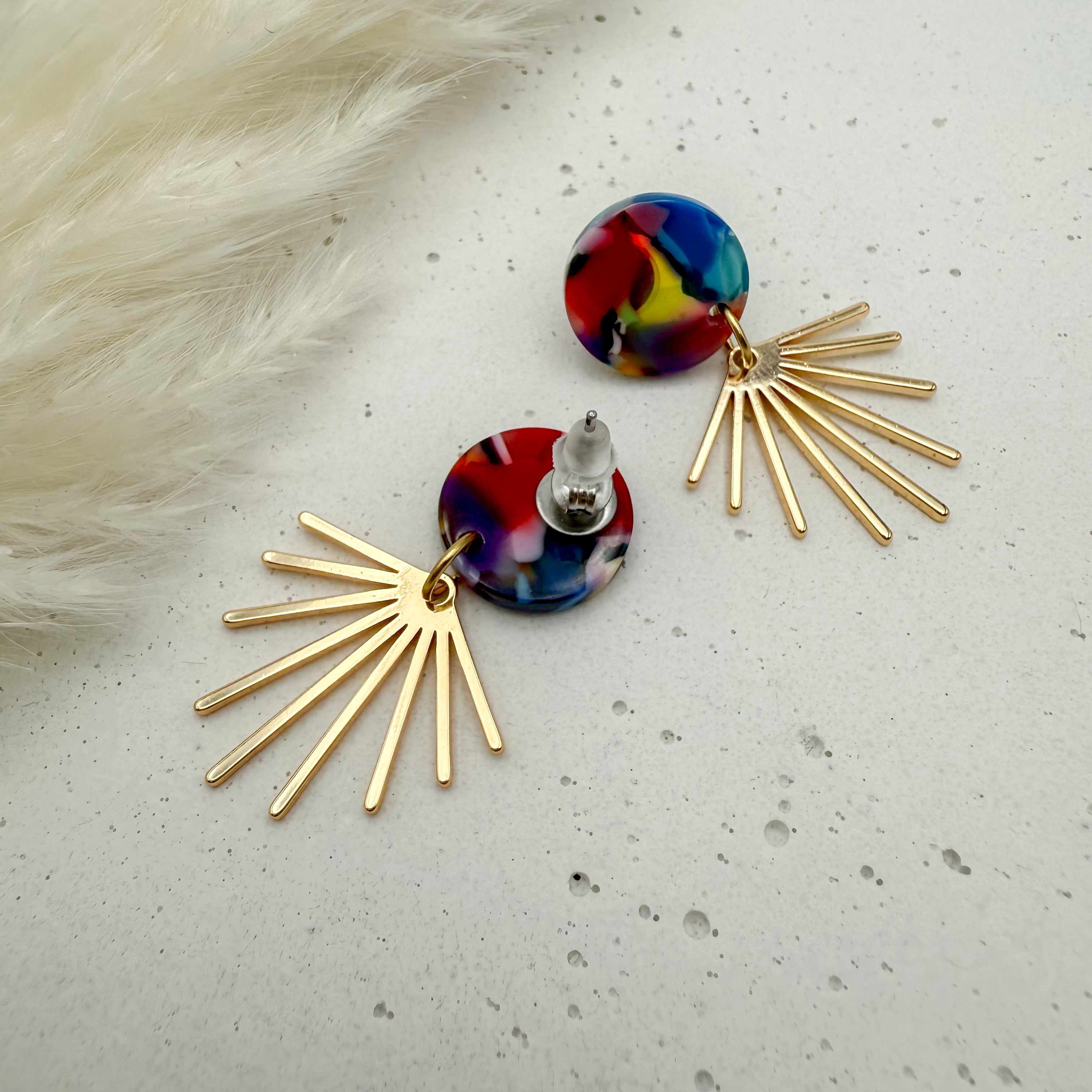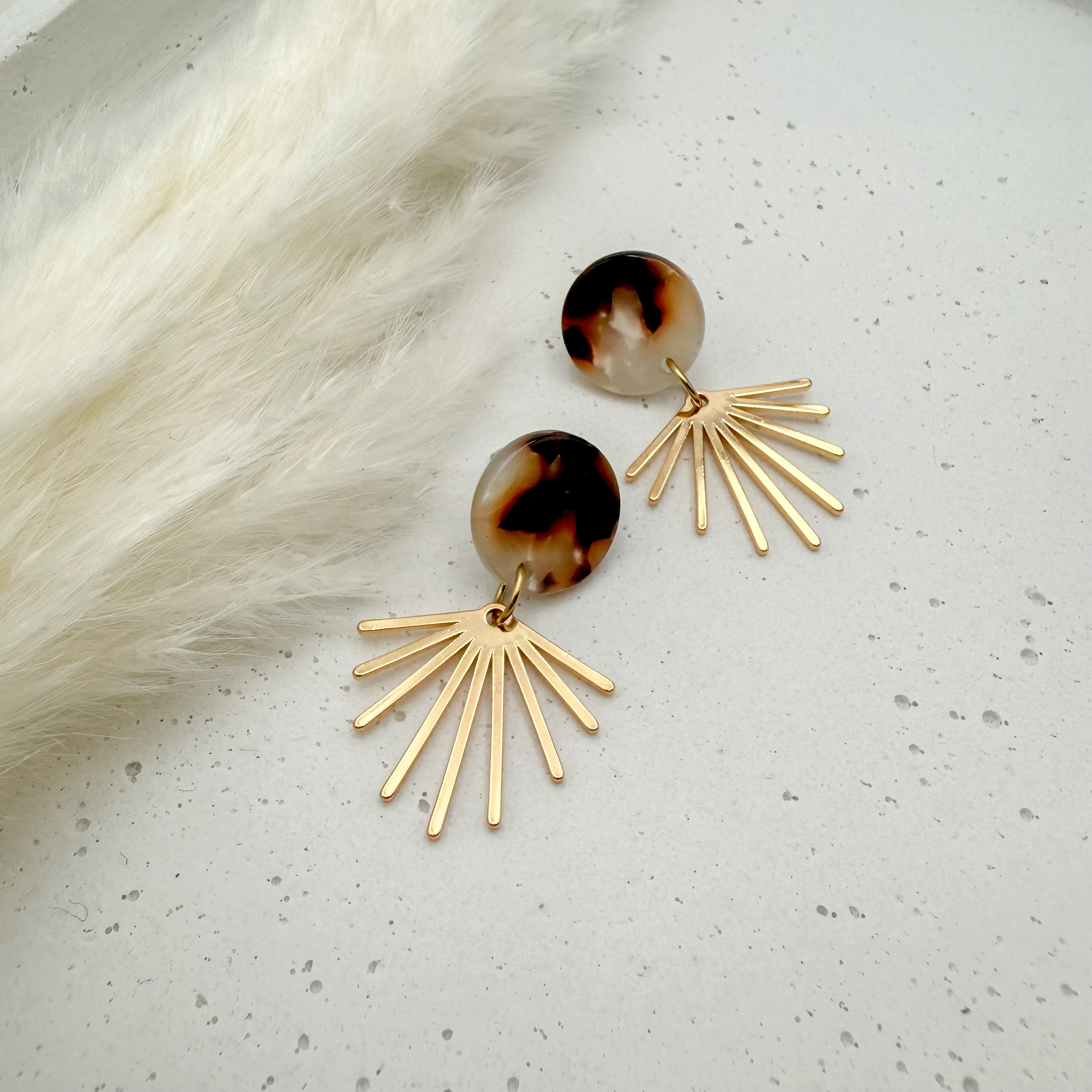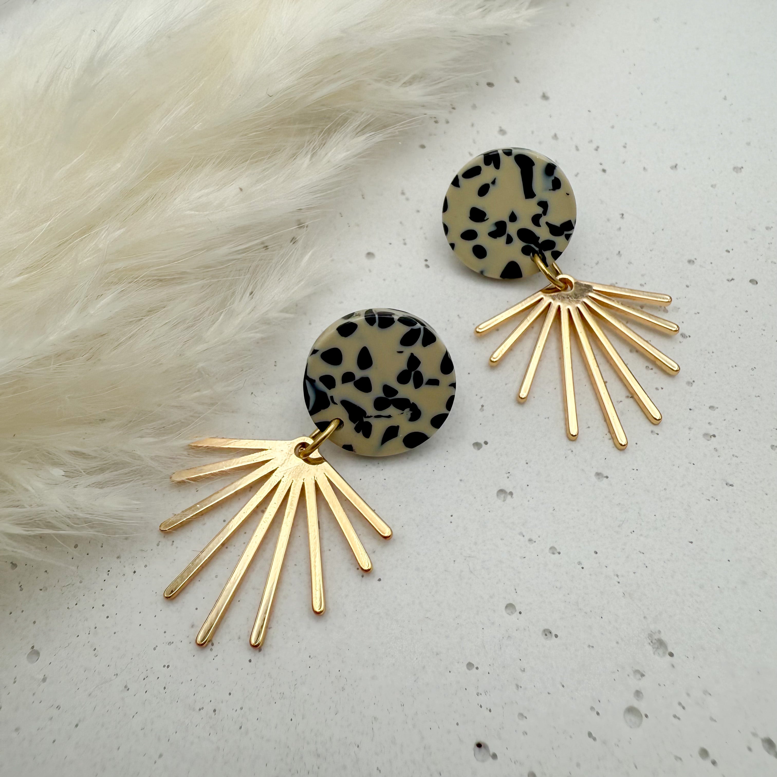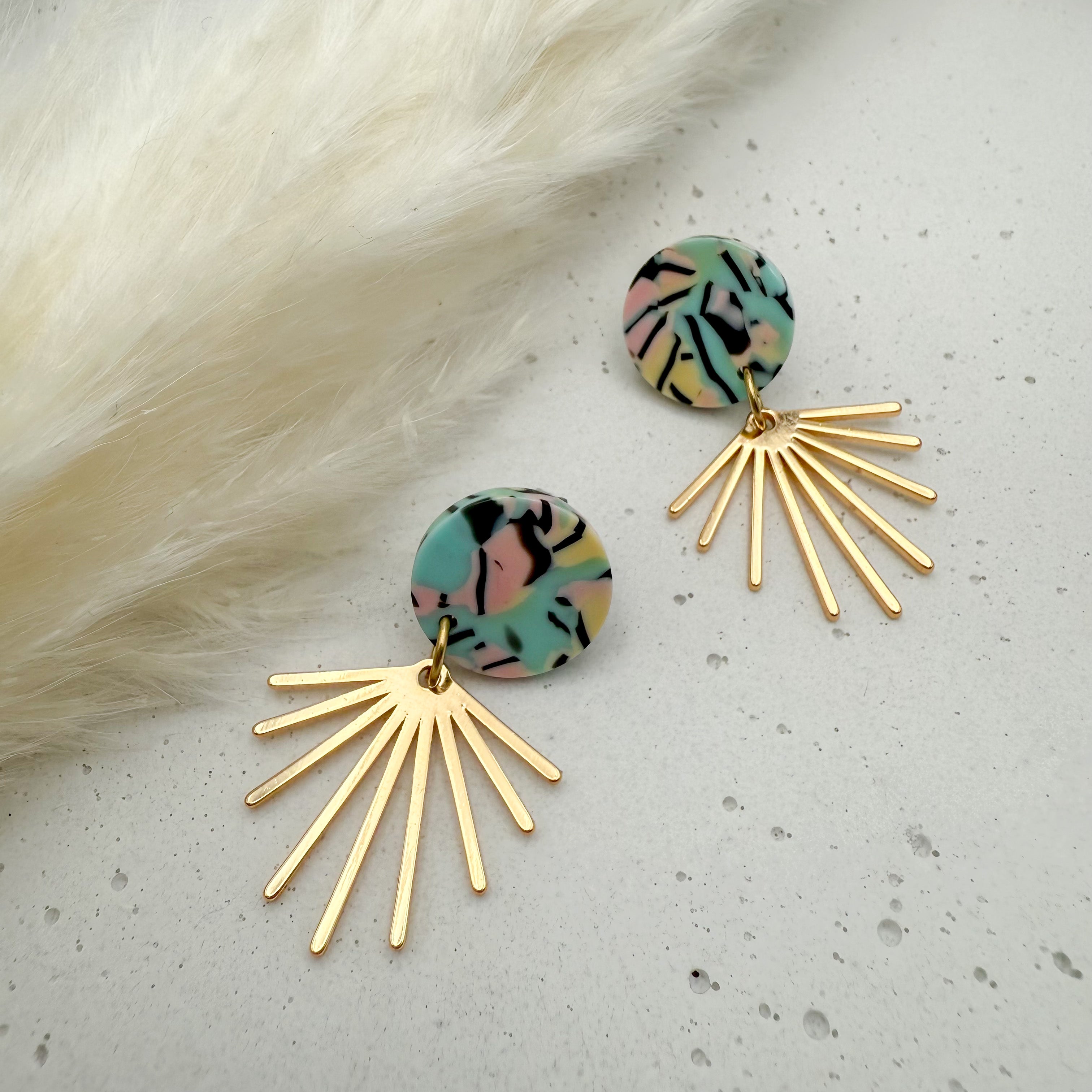 Stilvolle Ohrstecker Indi mit Kopfteil aus Acetat oder Polymer Clay & Anhänger aus vergoldetem Messing von Vagabundobjects.