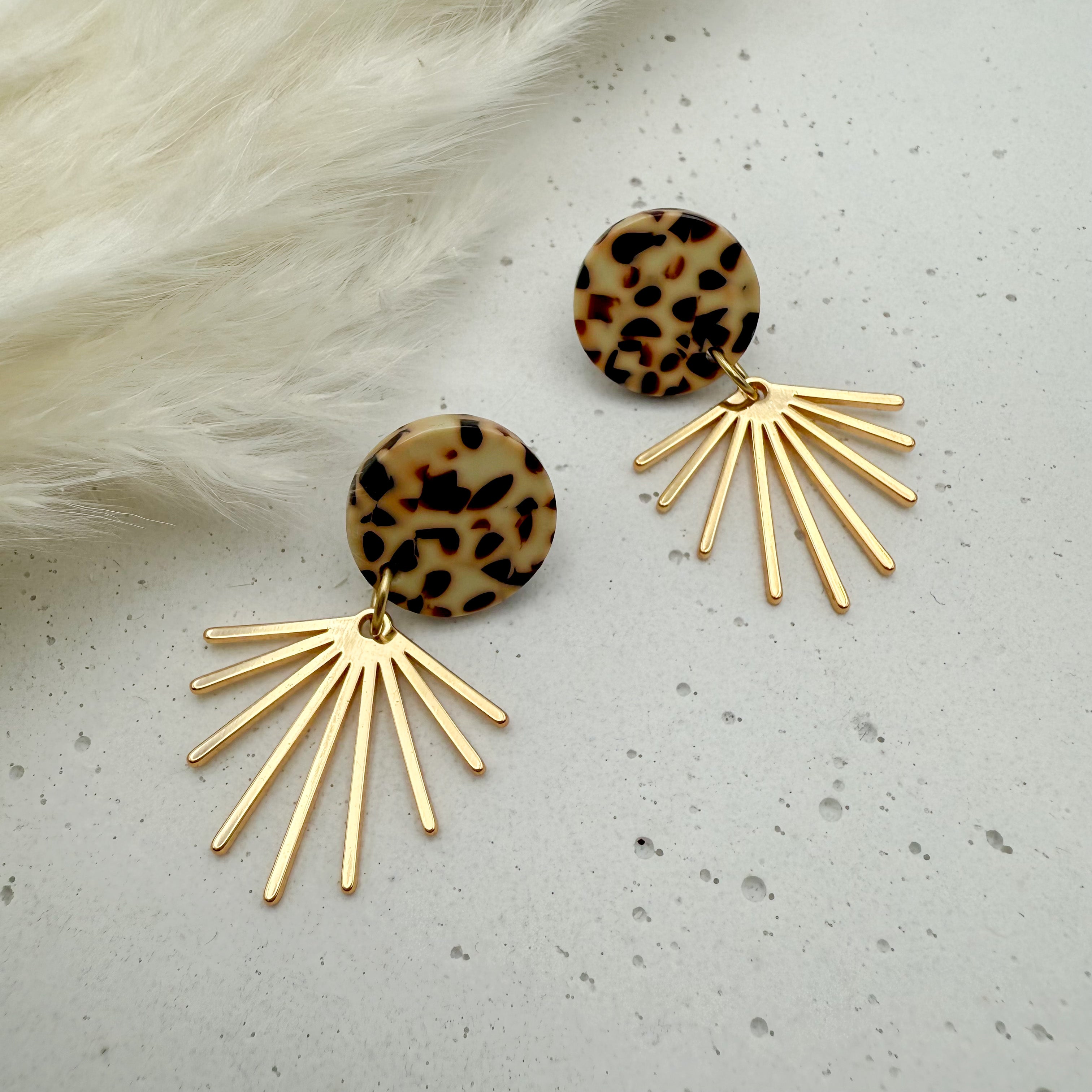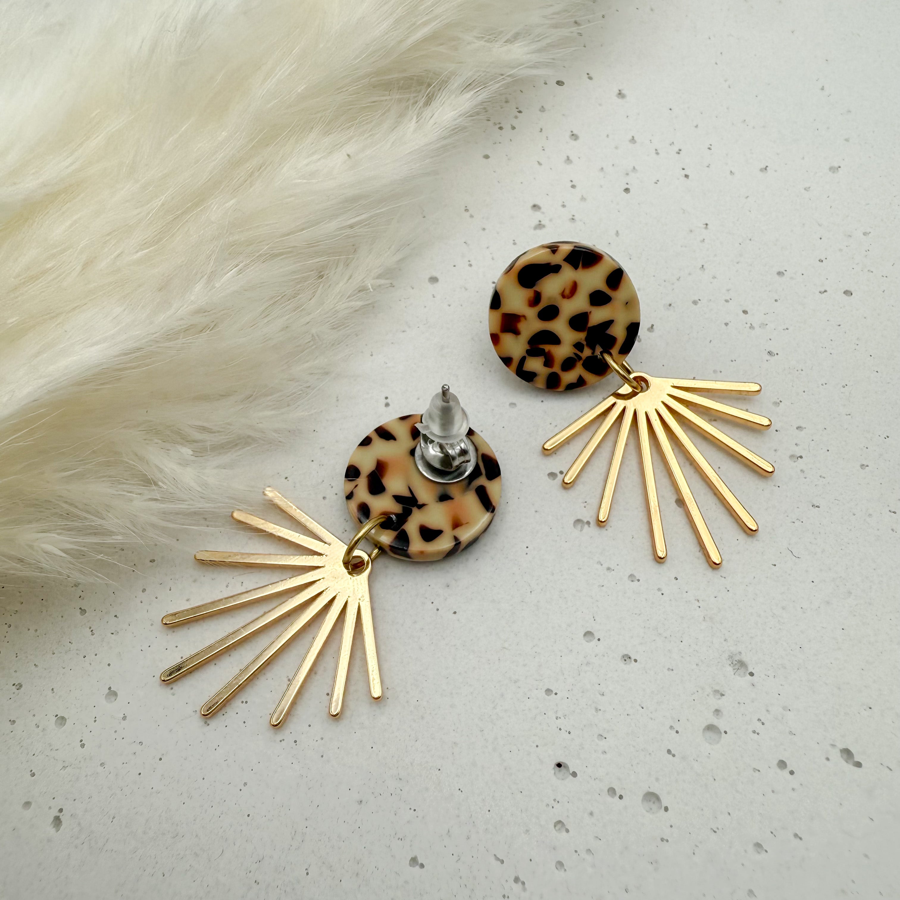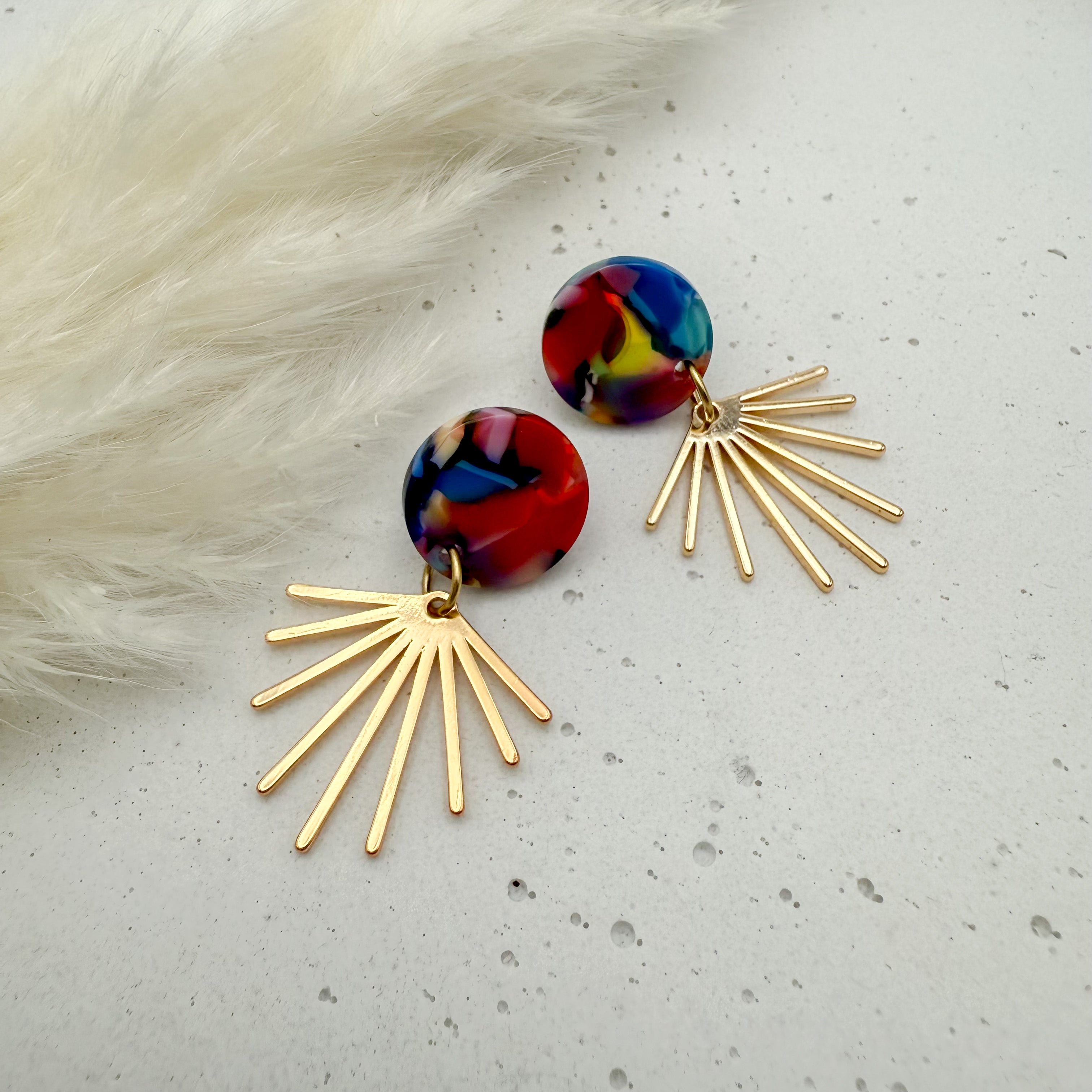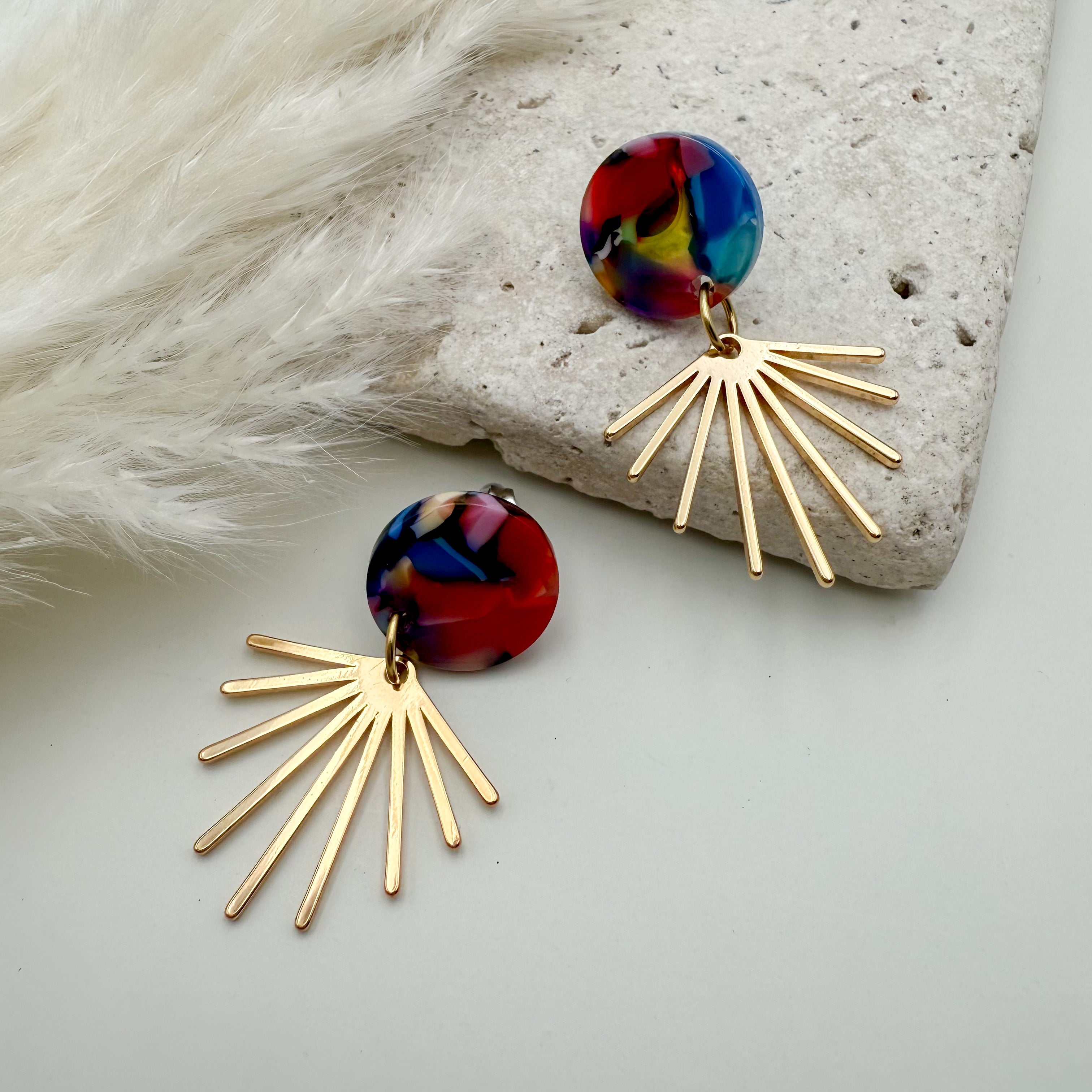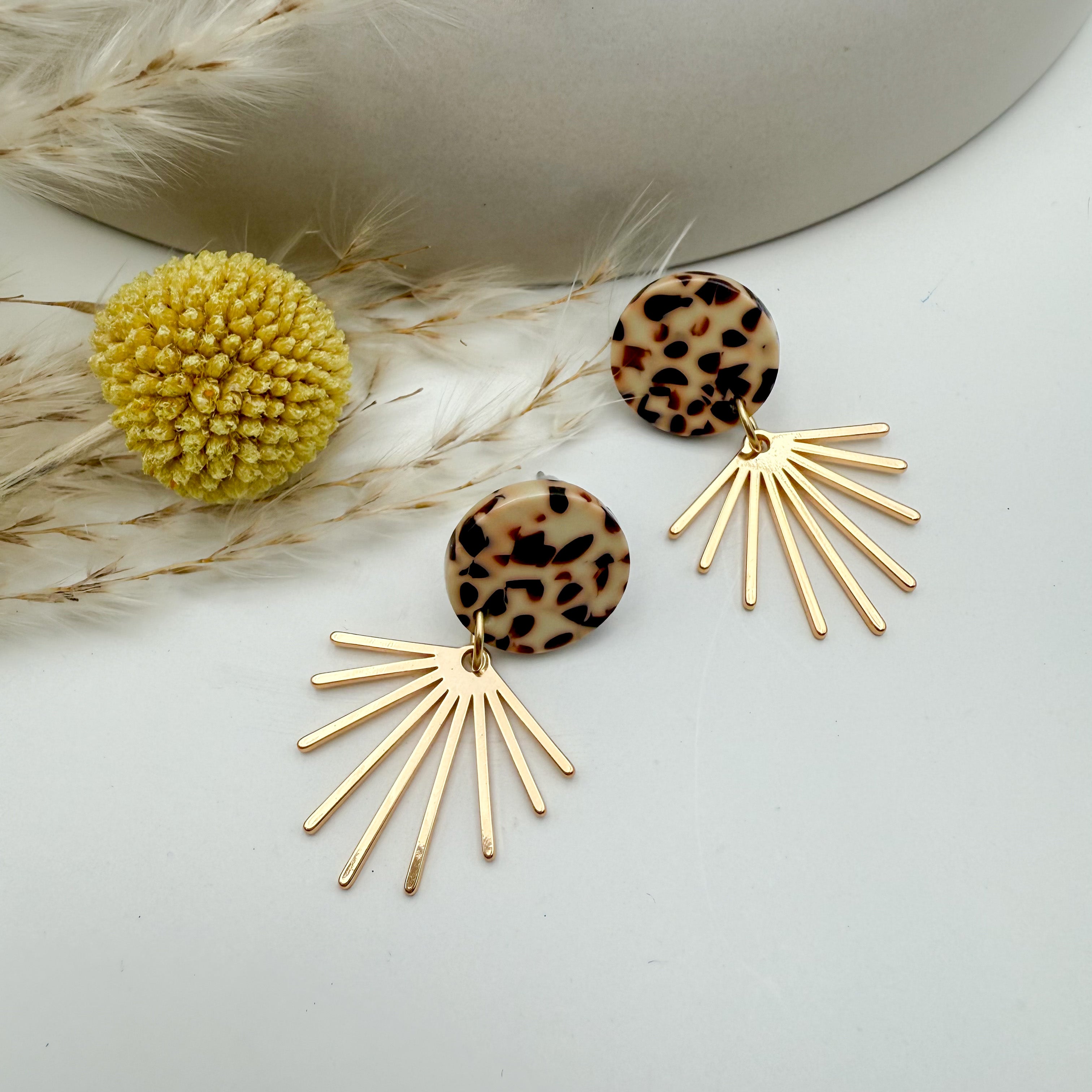 Stilvolle Ohrstecker Indi mit Kopfteil aus Acetat oder Polymer Clay & Anhänger aus vergoldetem Messing von Vagabundobjects.