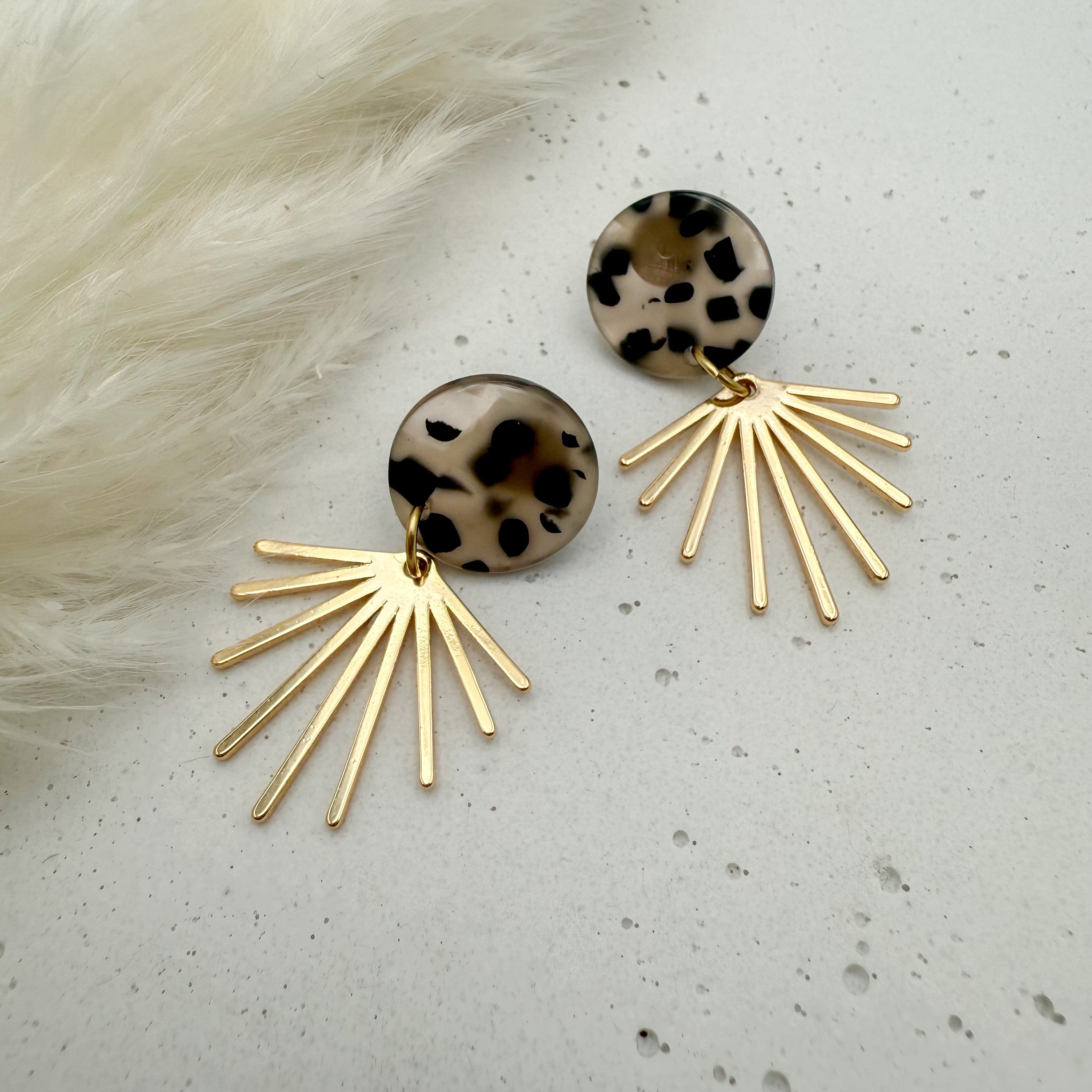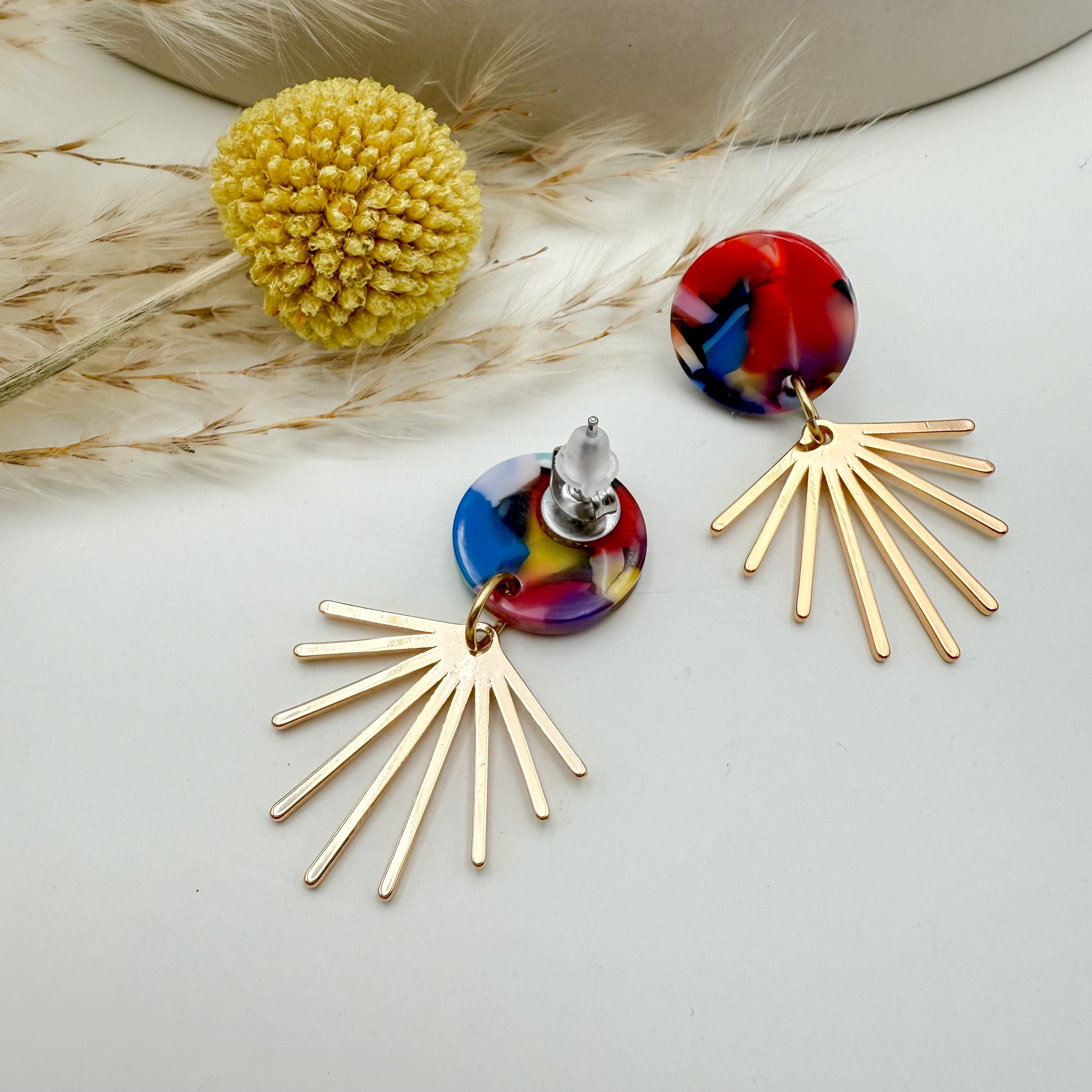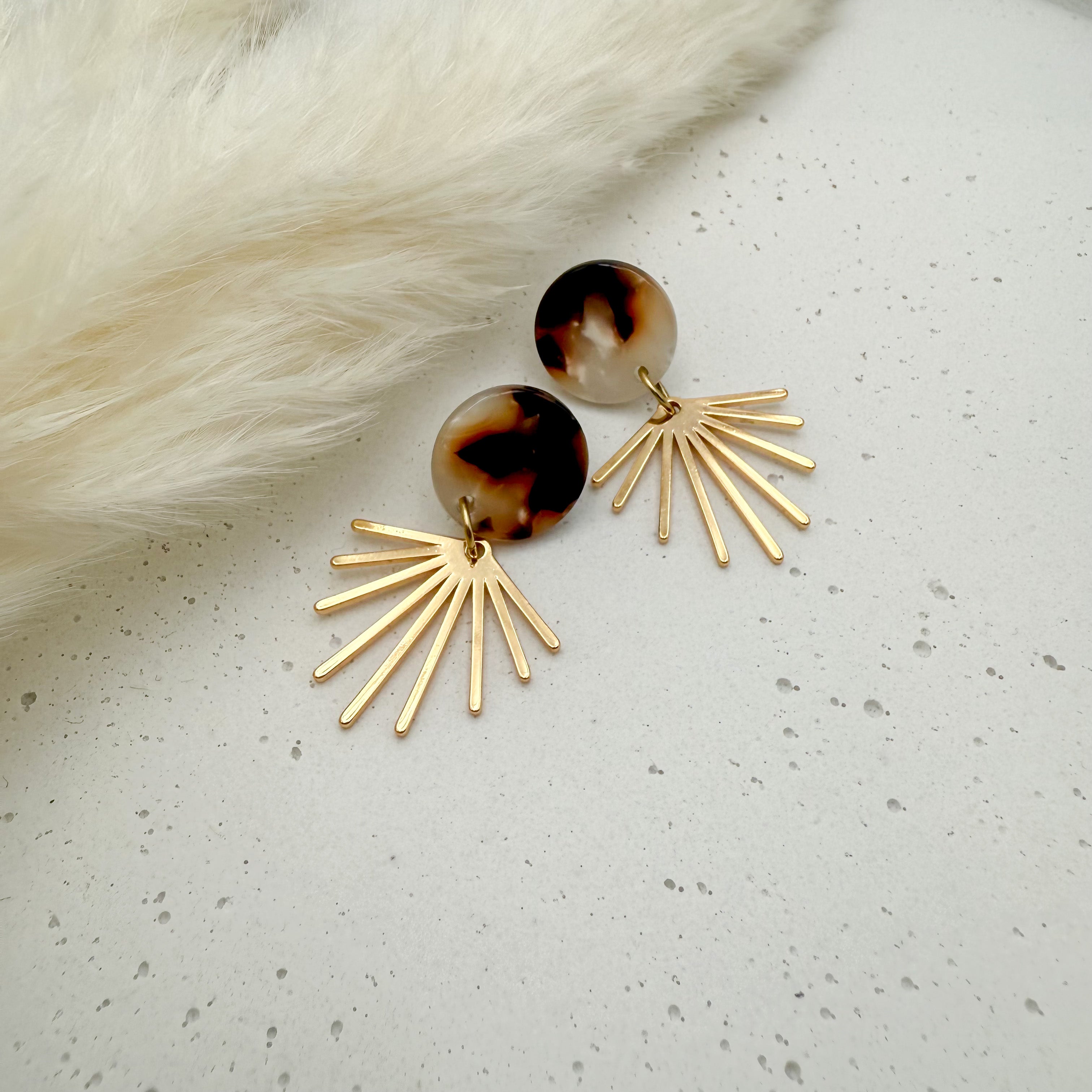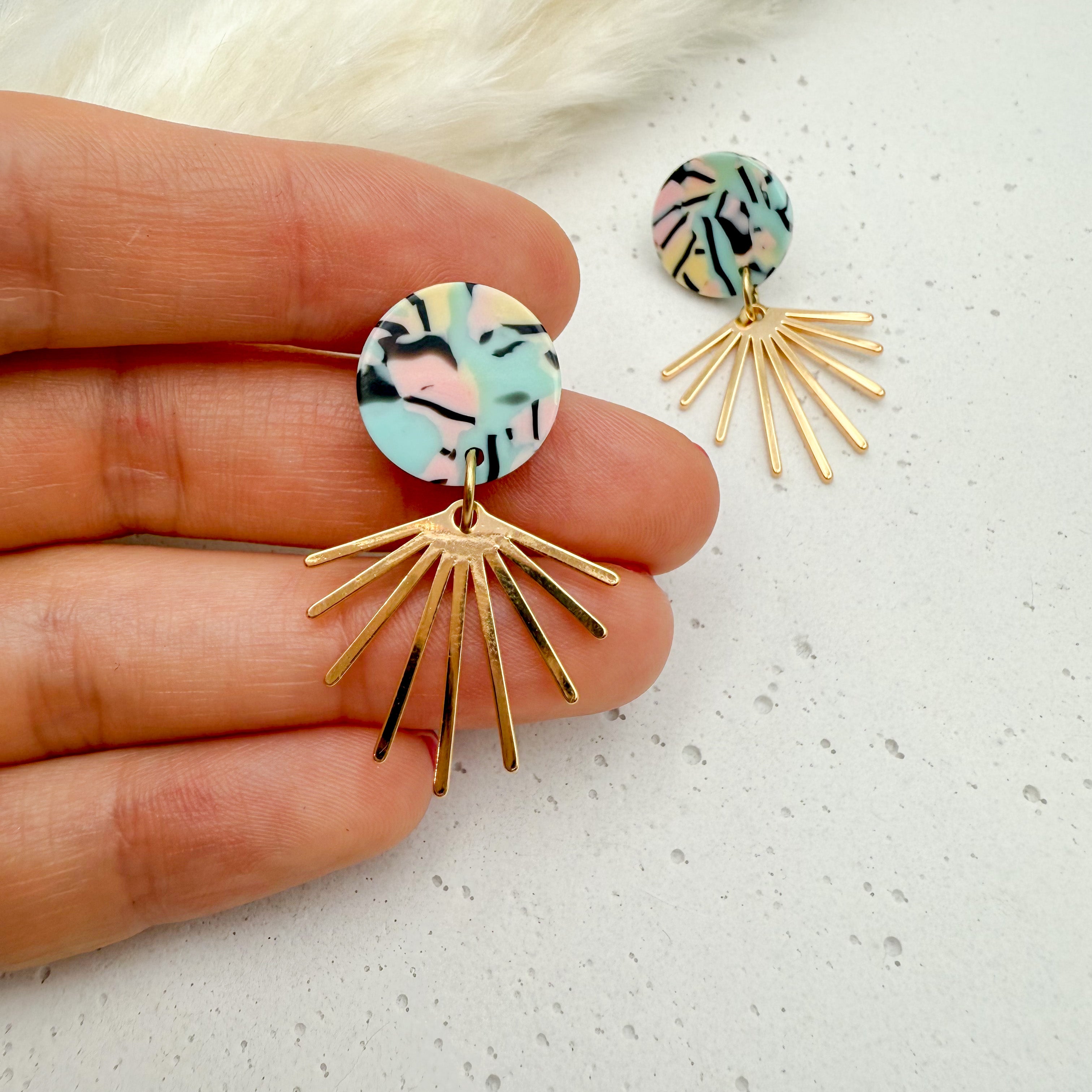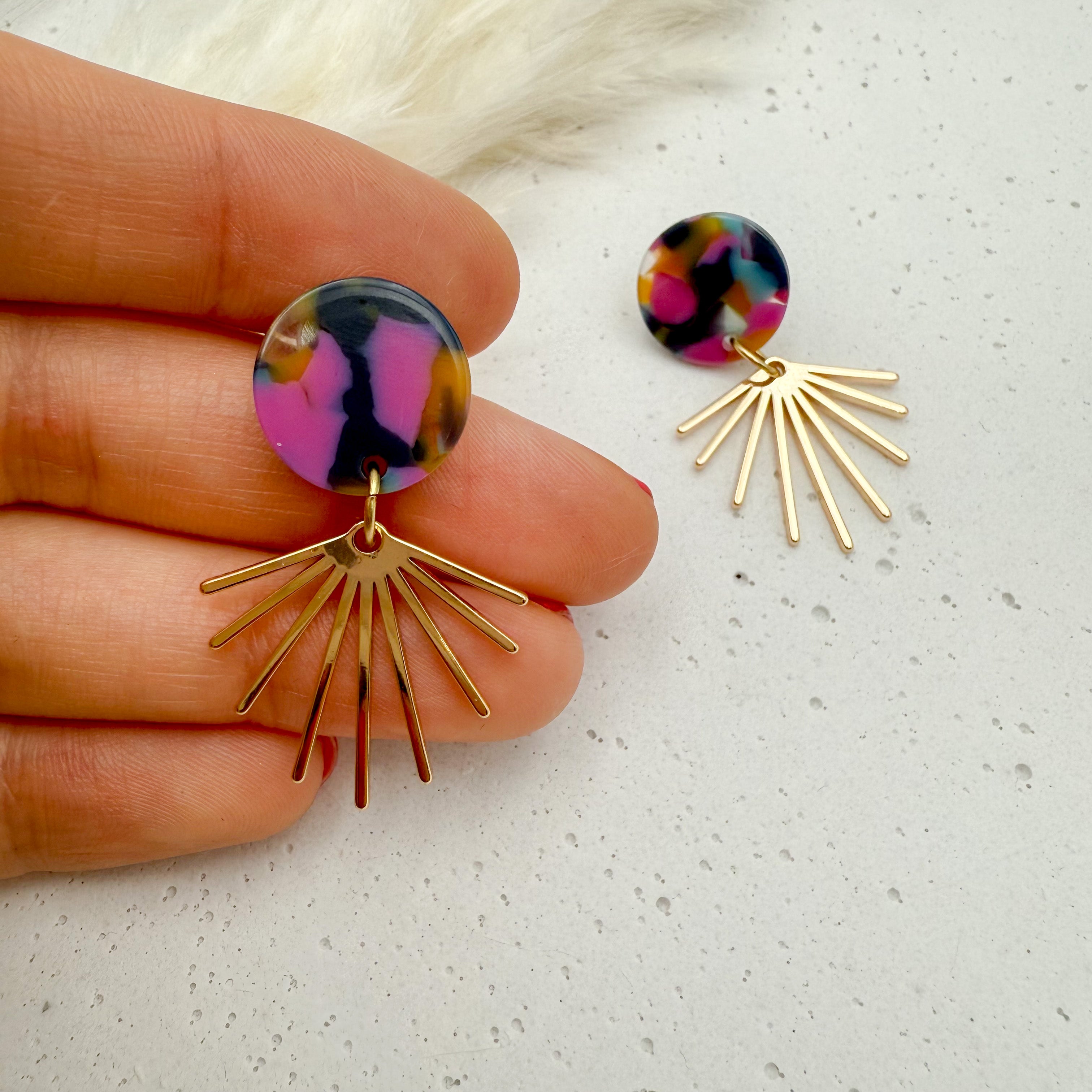 Stilvolle Ohrstecker Indi mit Kopfteil aus Acetat oder Polymer Clay & Anhänger aus vergoldetem Messing von Vagabundobjects.