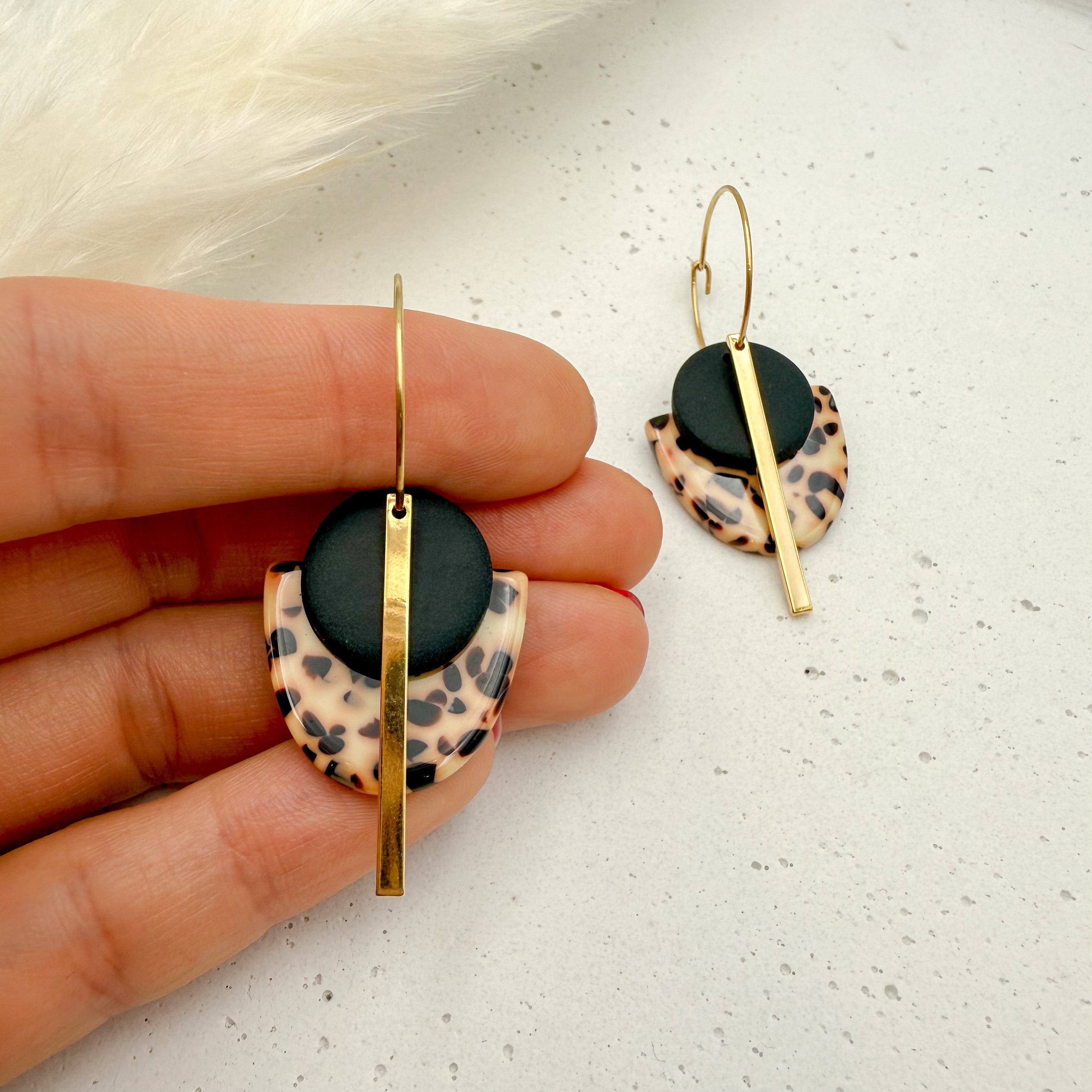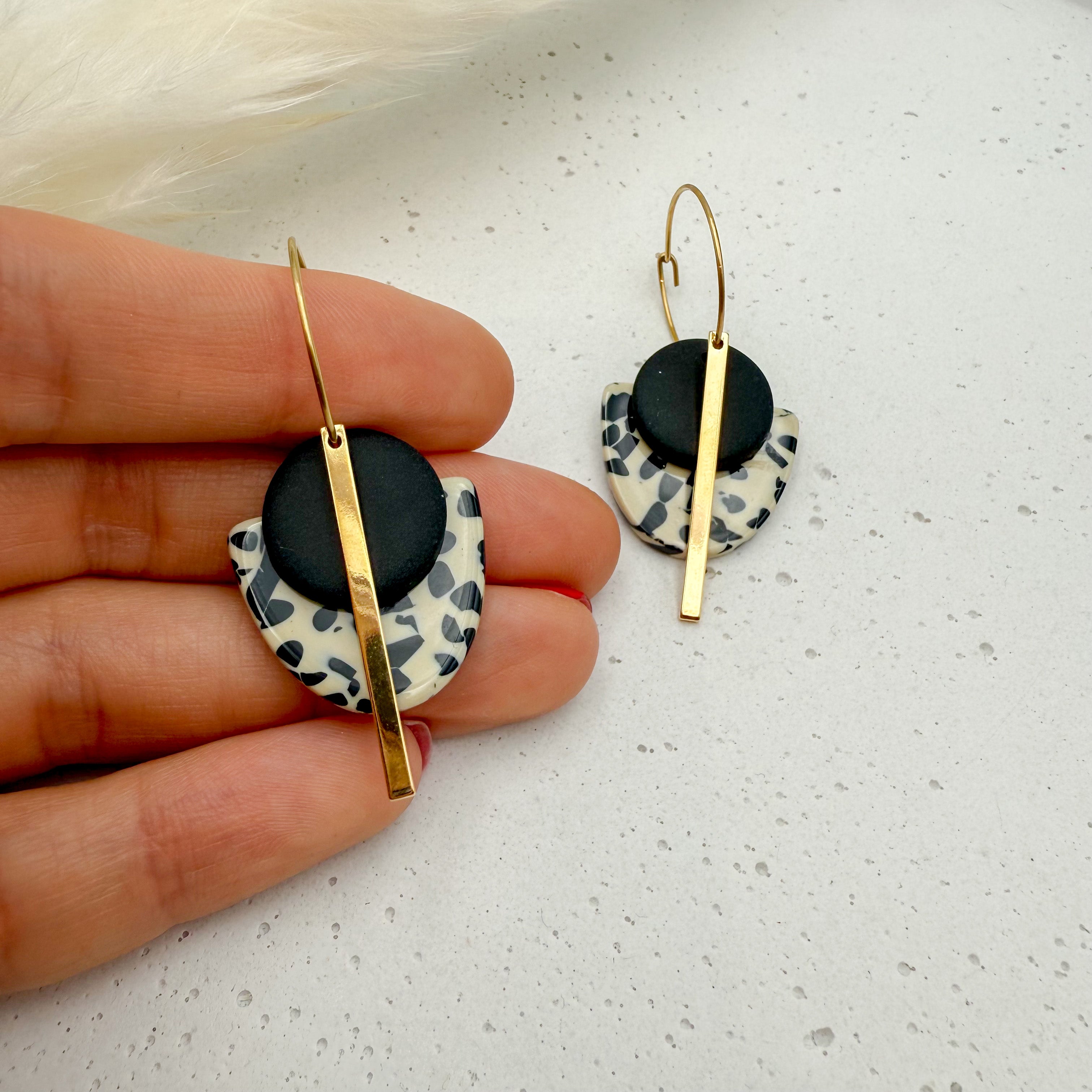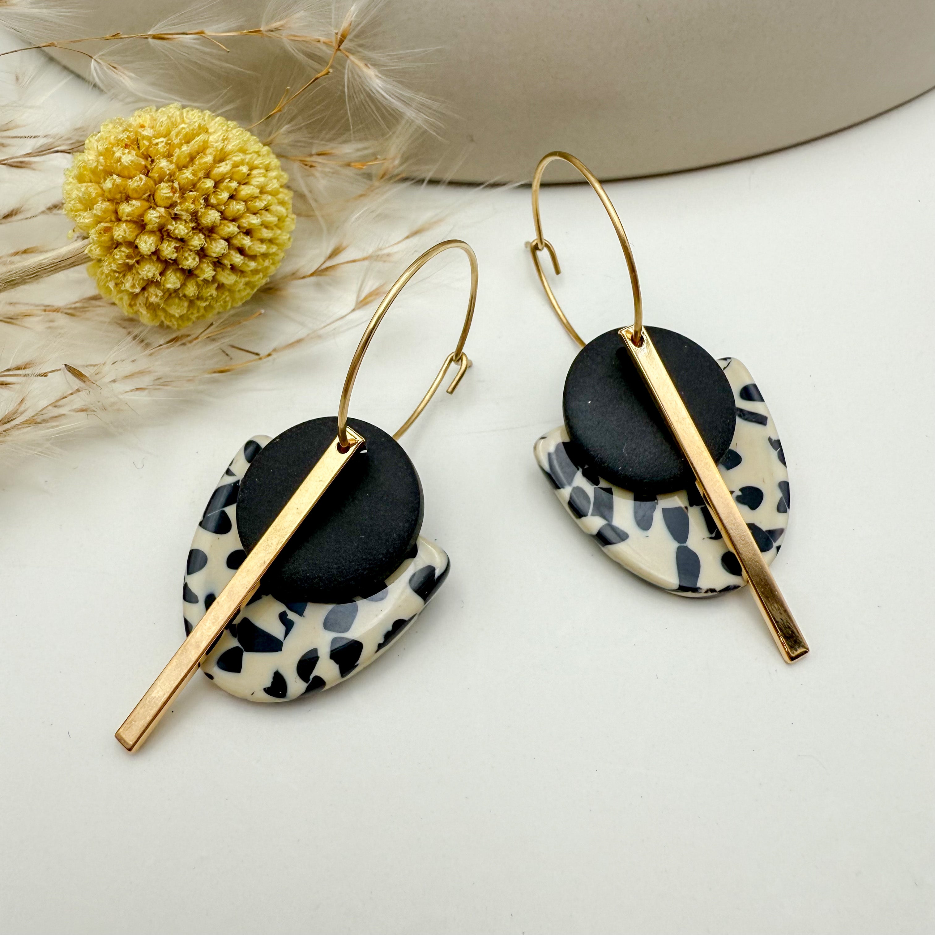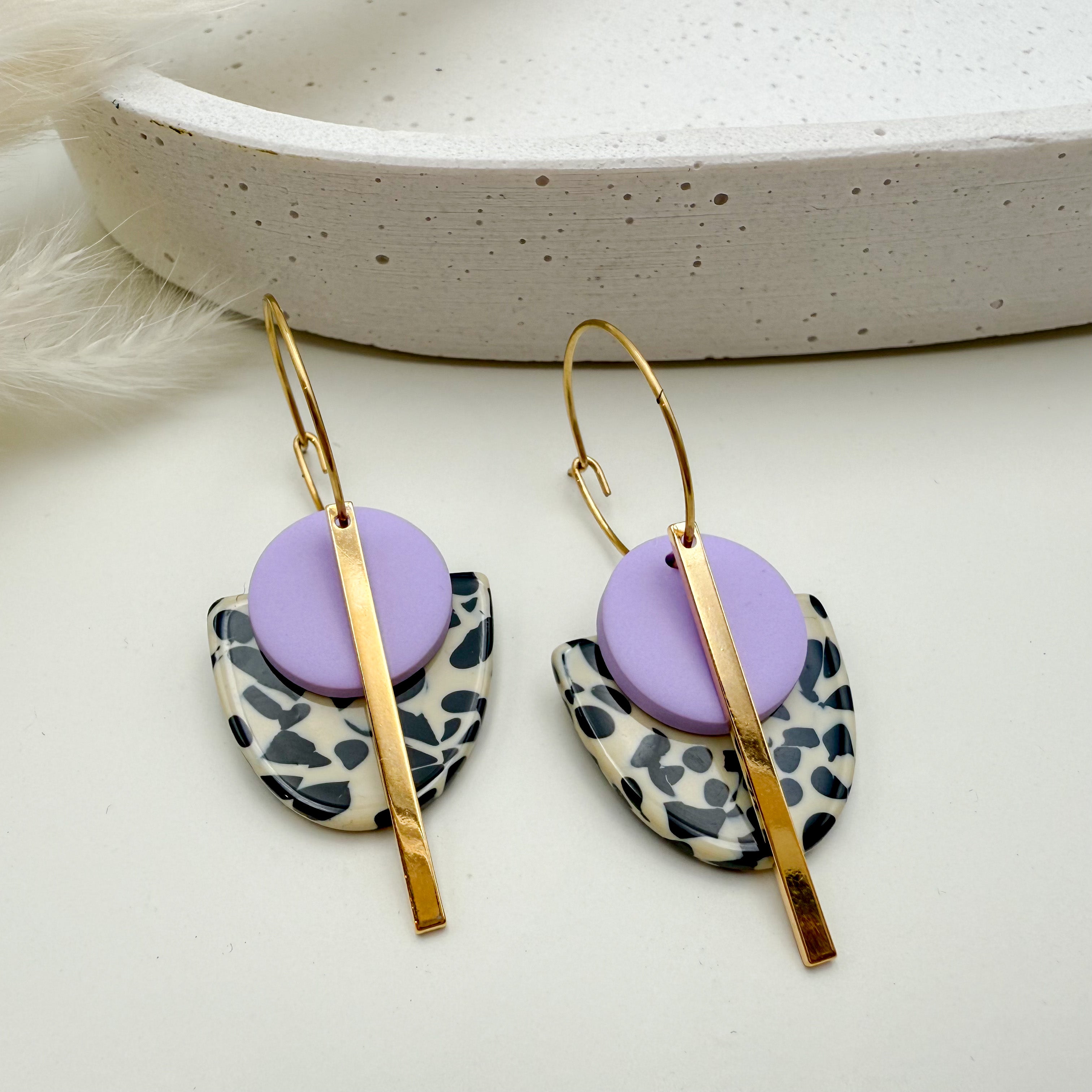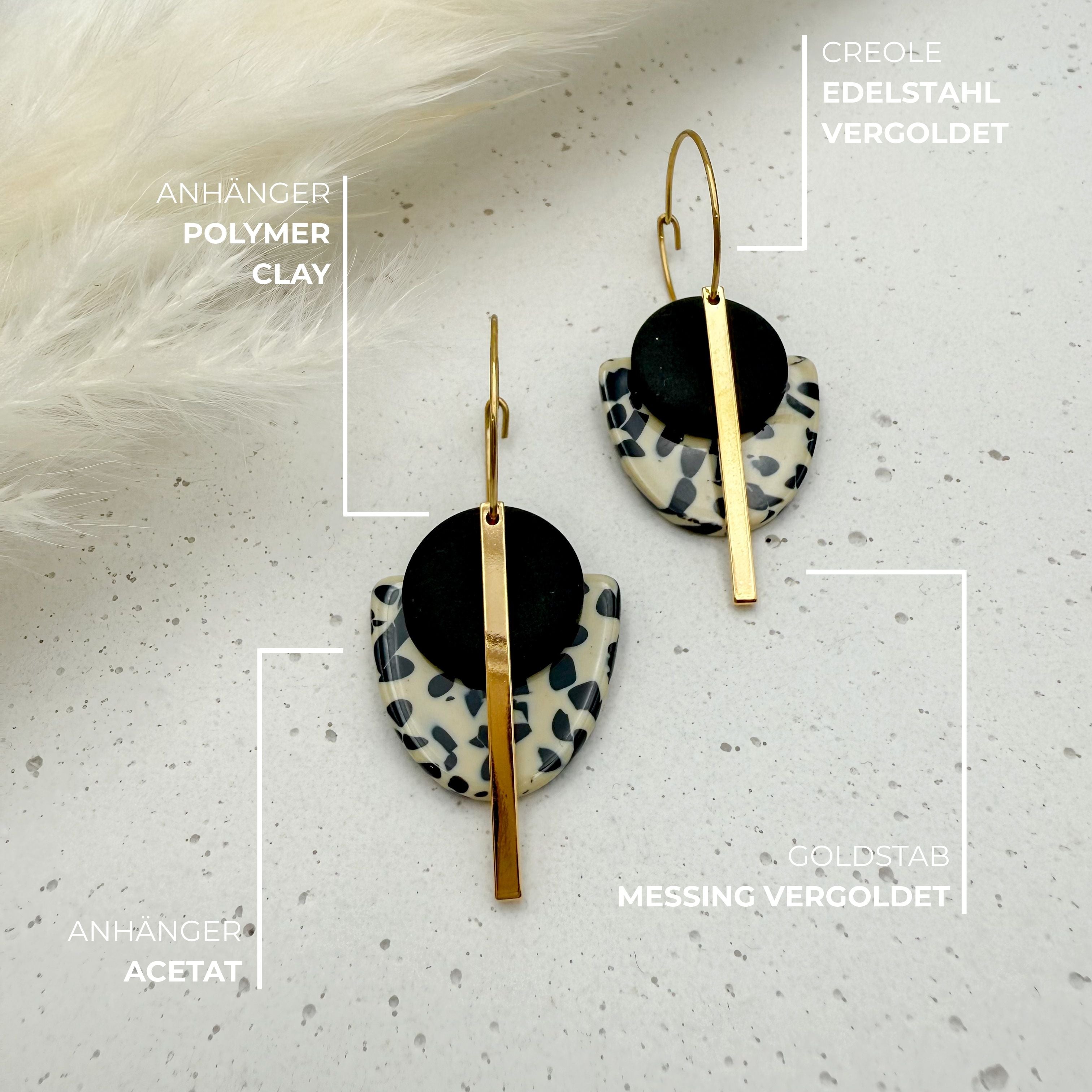 Stilvolle Creolen Tala mit Goldstab und Acetat & Polymer Clay Anhängern von Vagabundobjects.