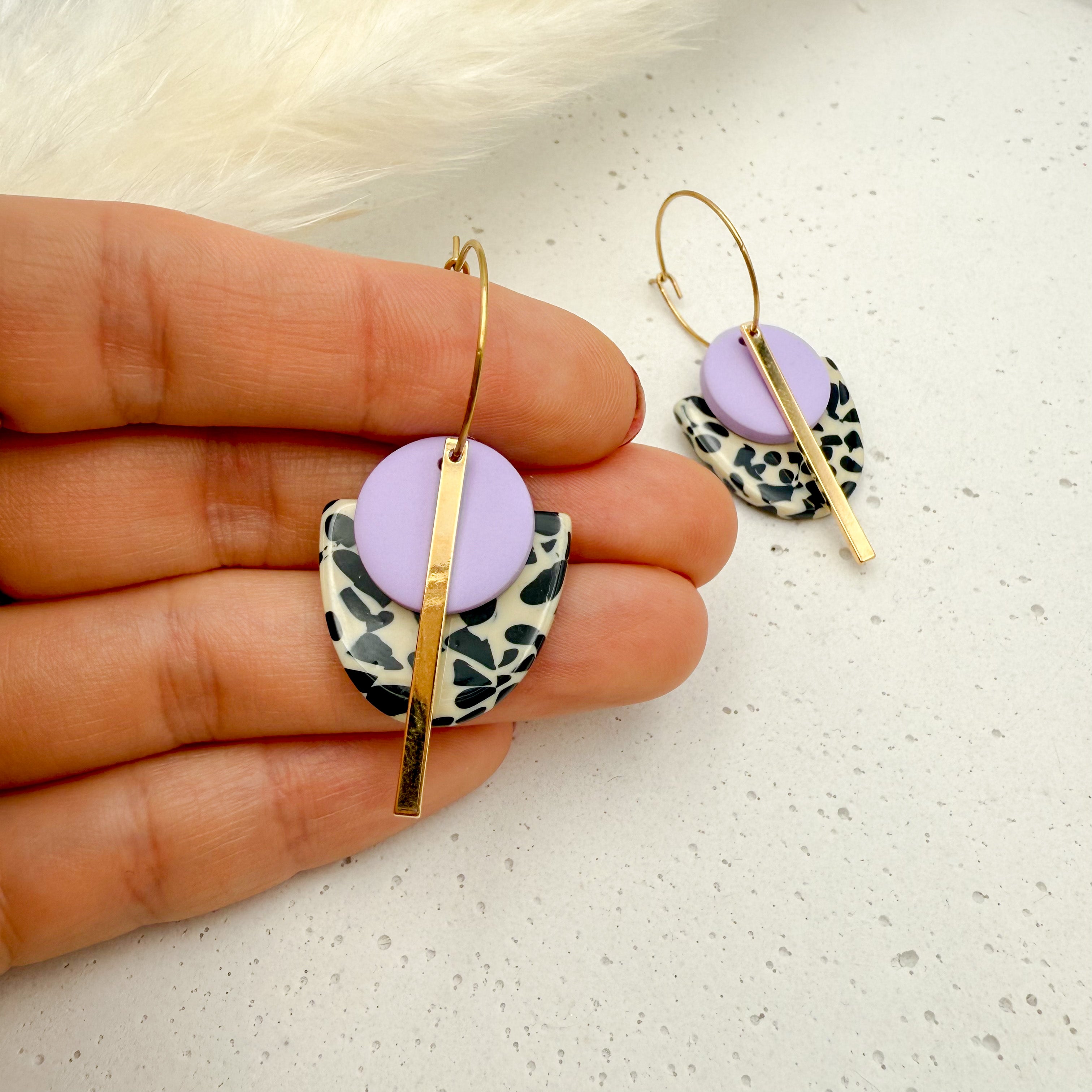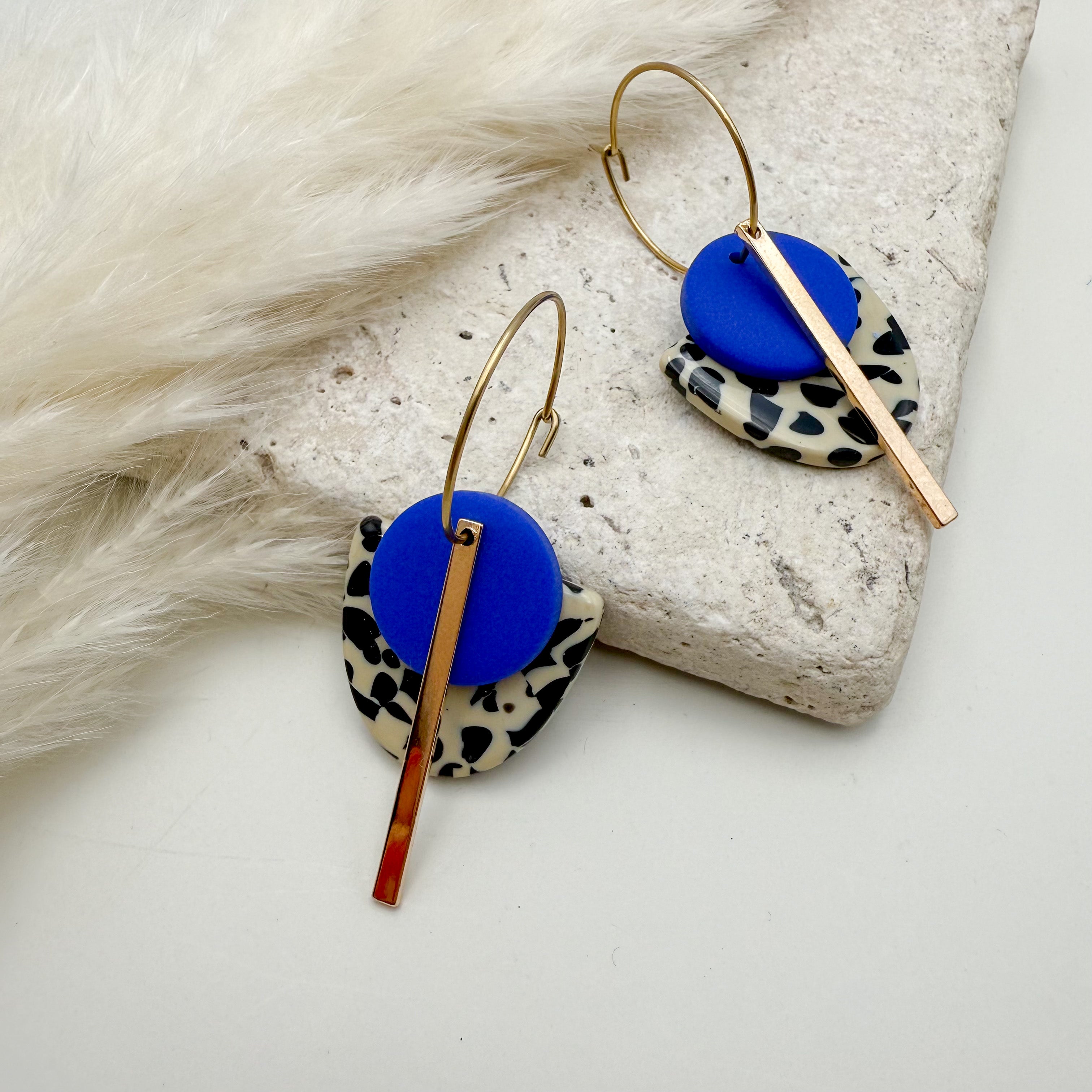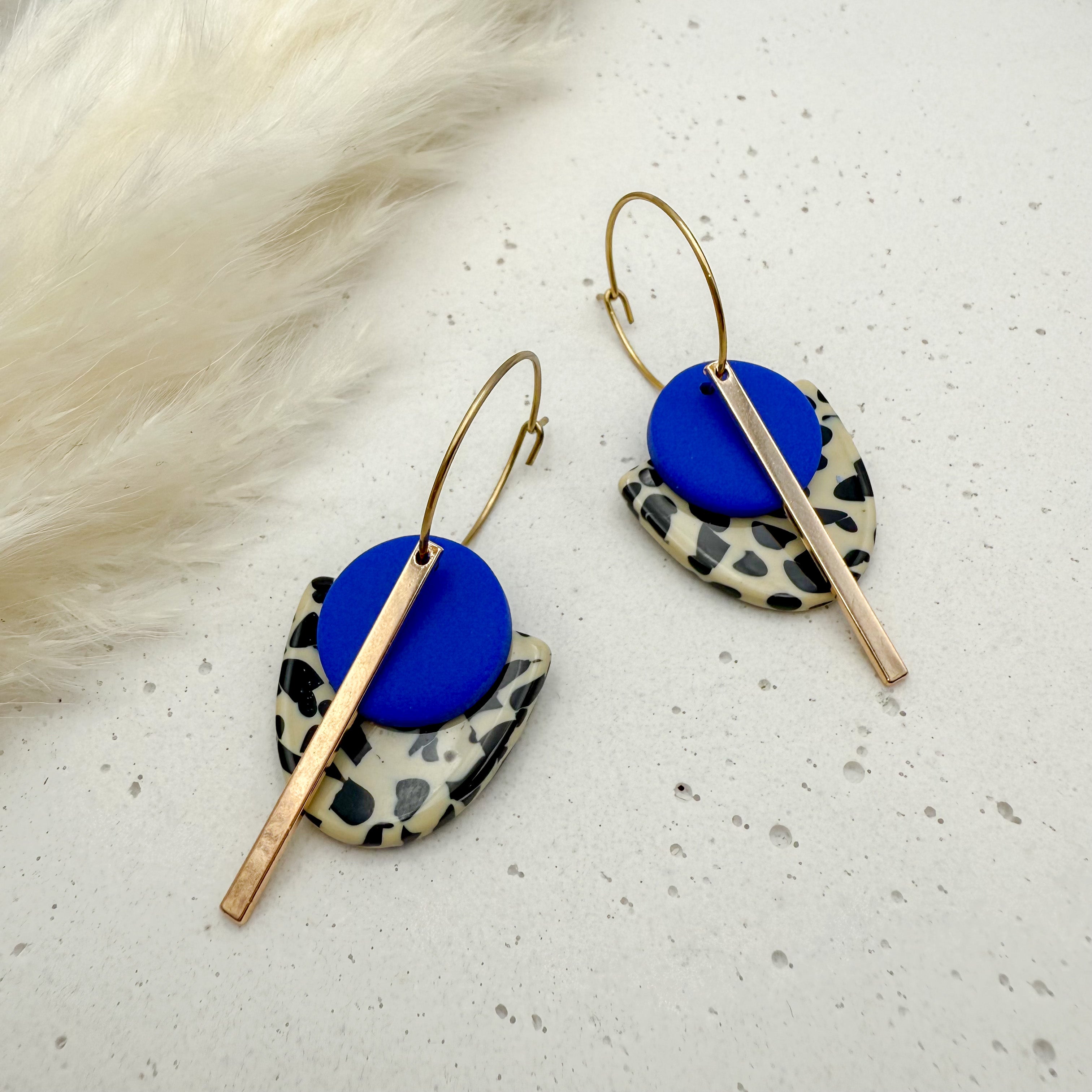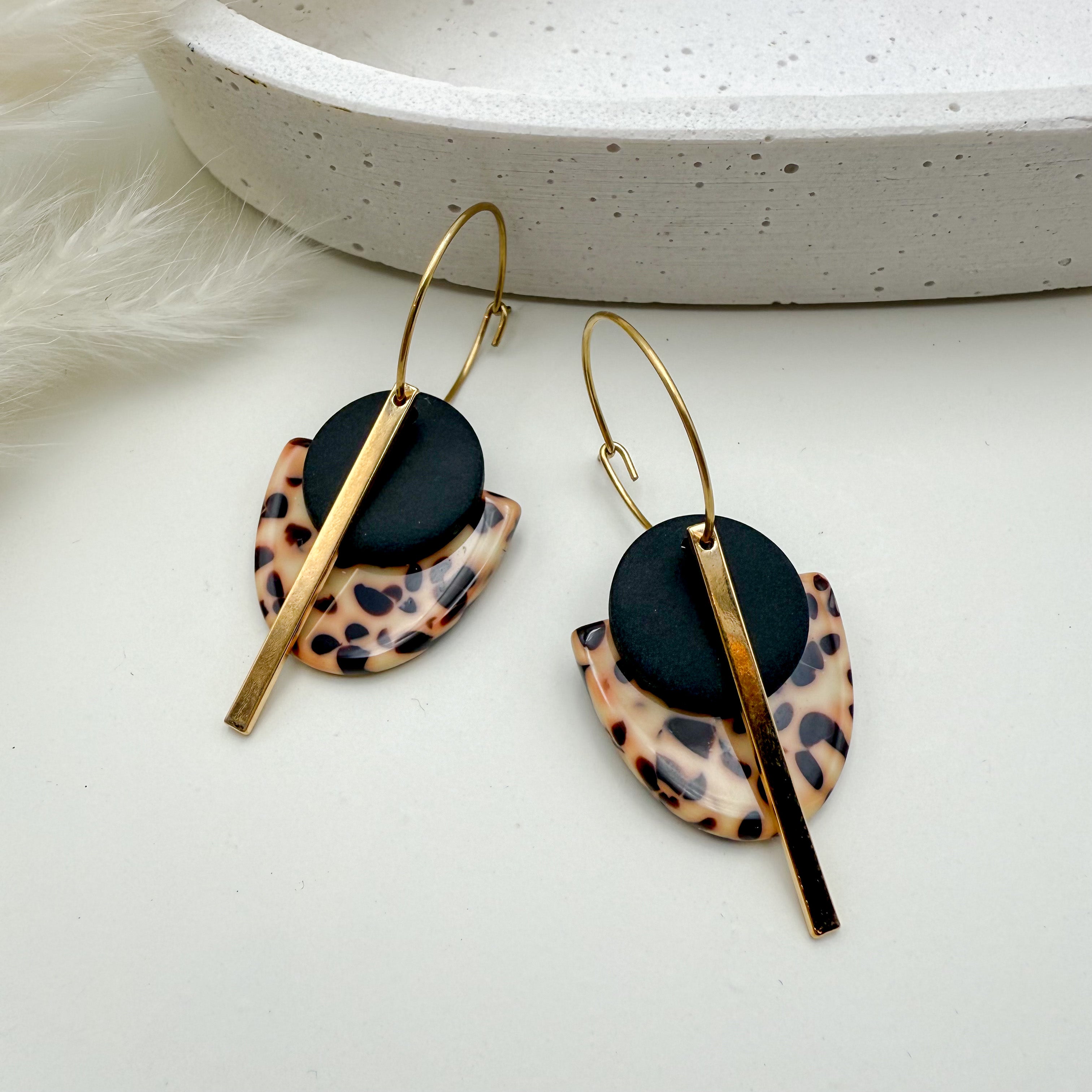 Stilvolle Creolen Tala mit Goldstab und Acetat & Polymer Clay Anhängern von Vagabundobjects.