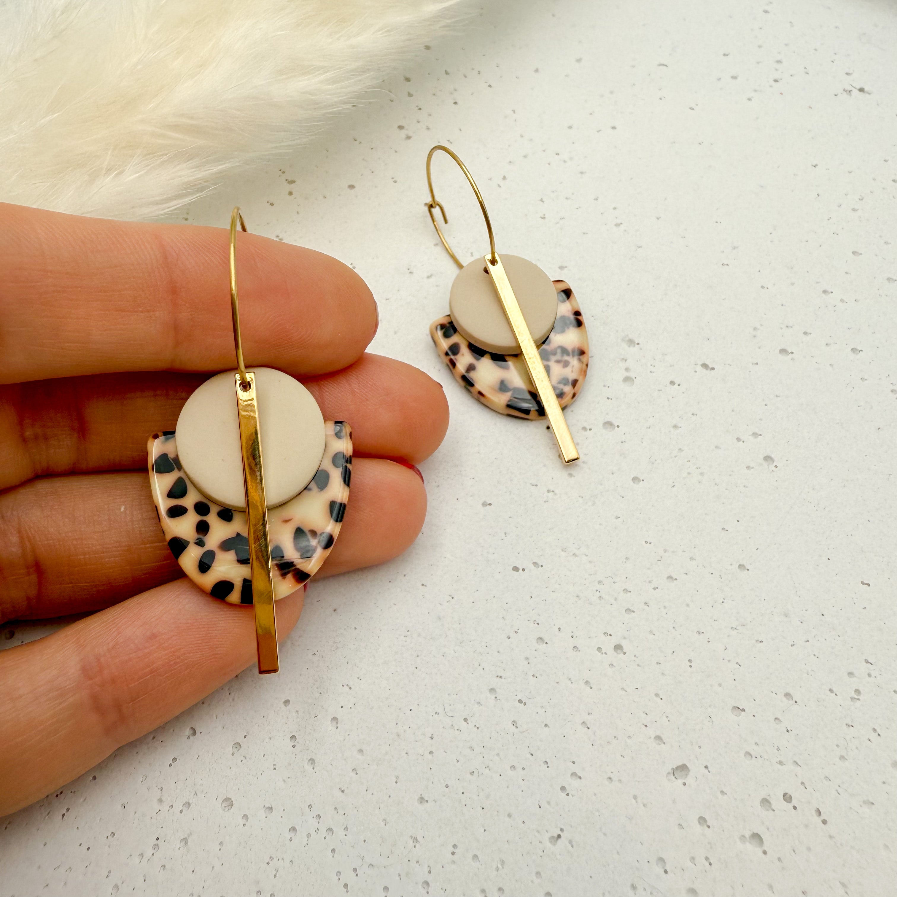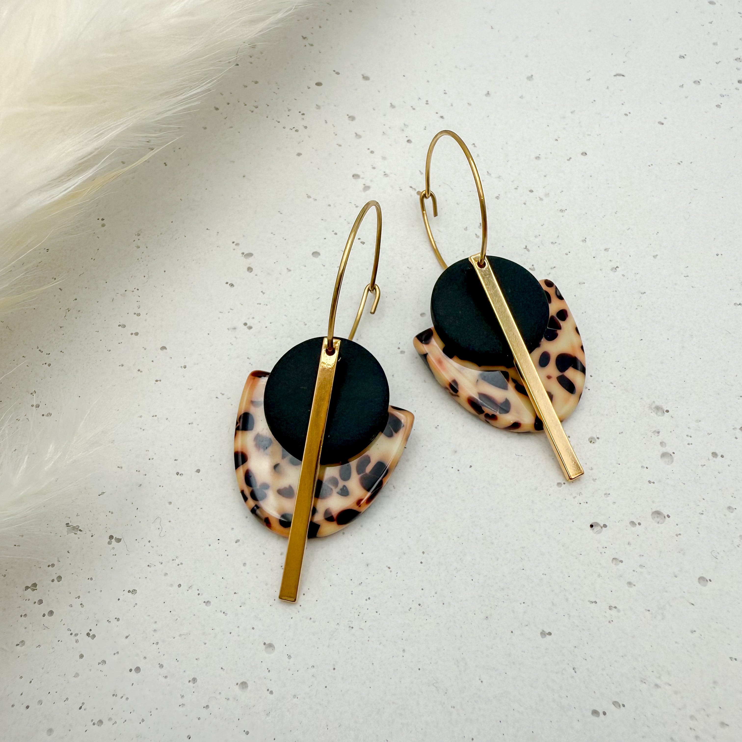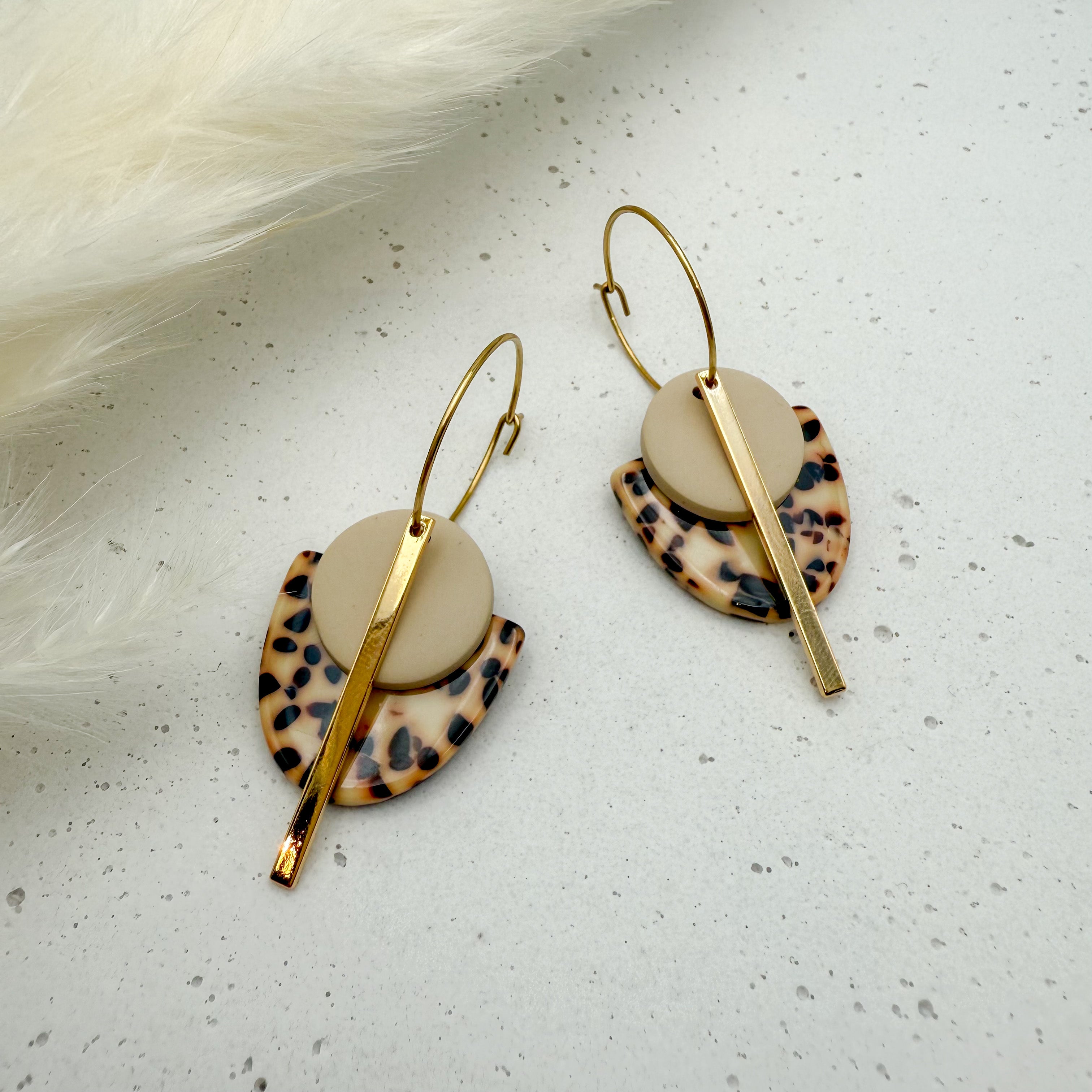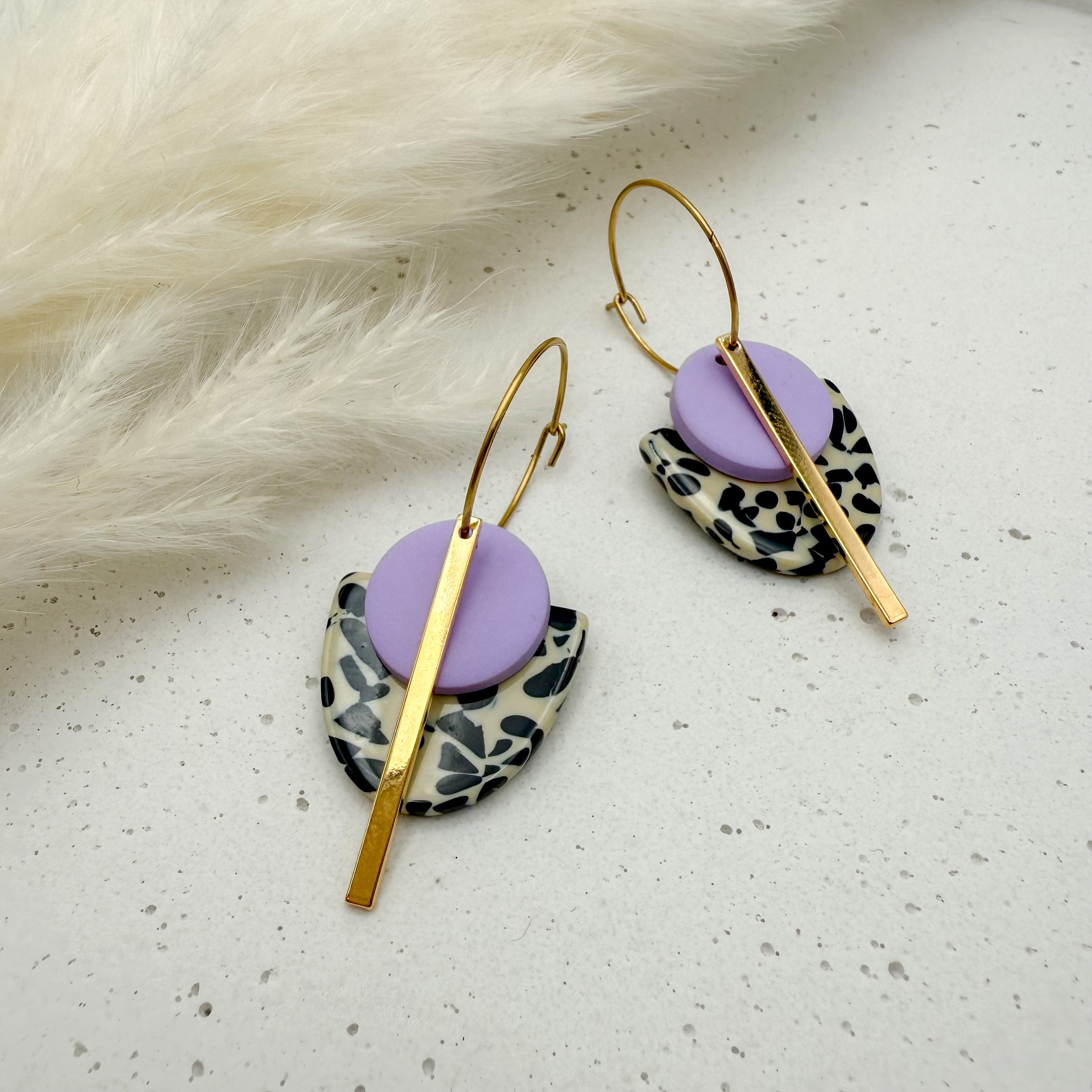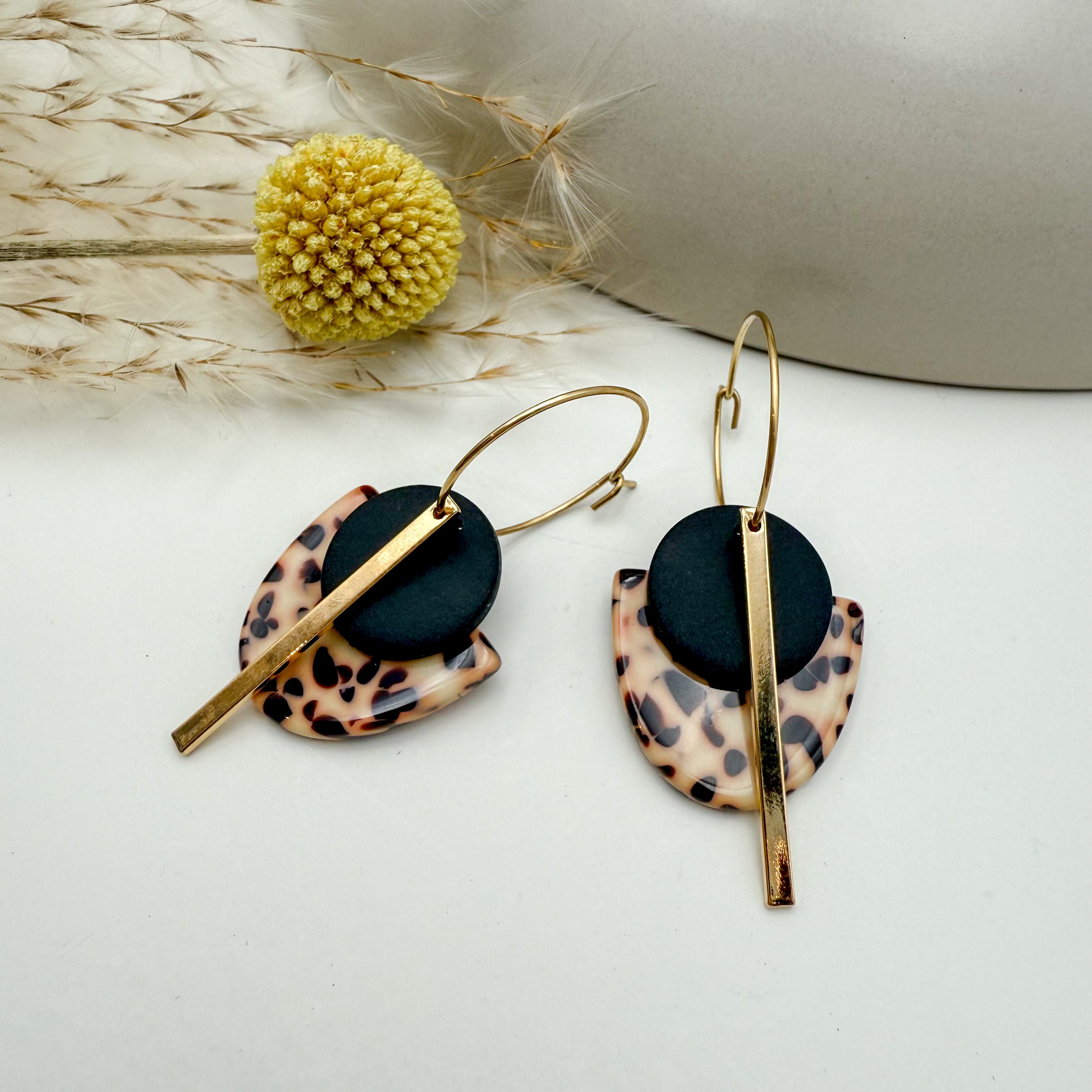 Stilvolle Creolen Tala mit Goldstab und Acetat & Polymer Clay Anhängern von Vagabundobjects.