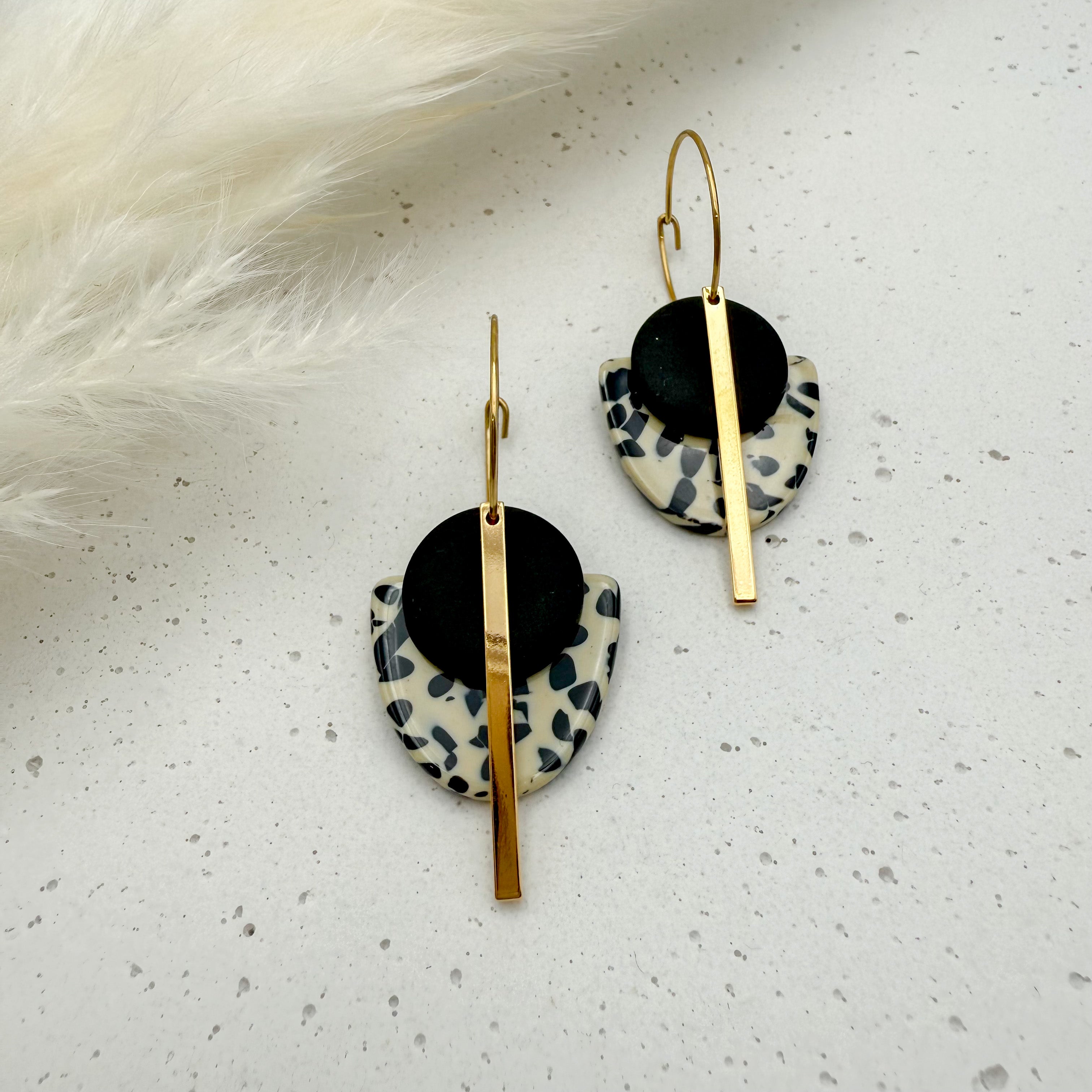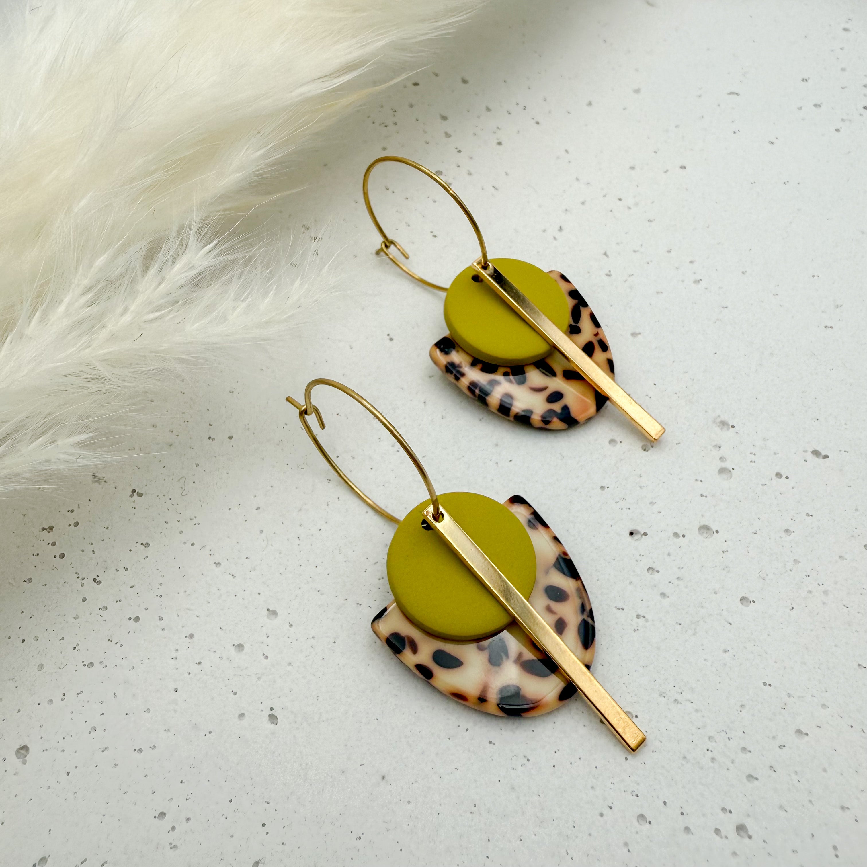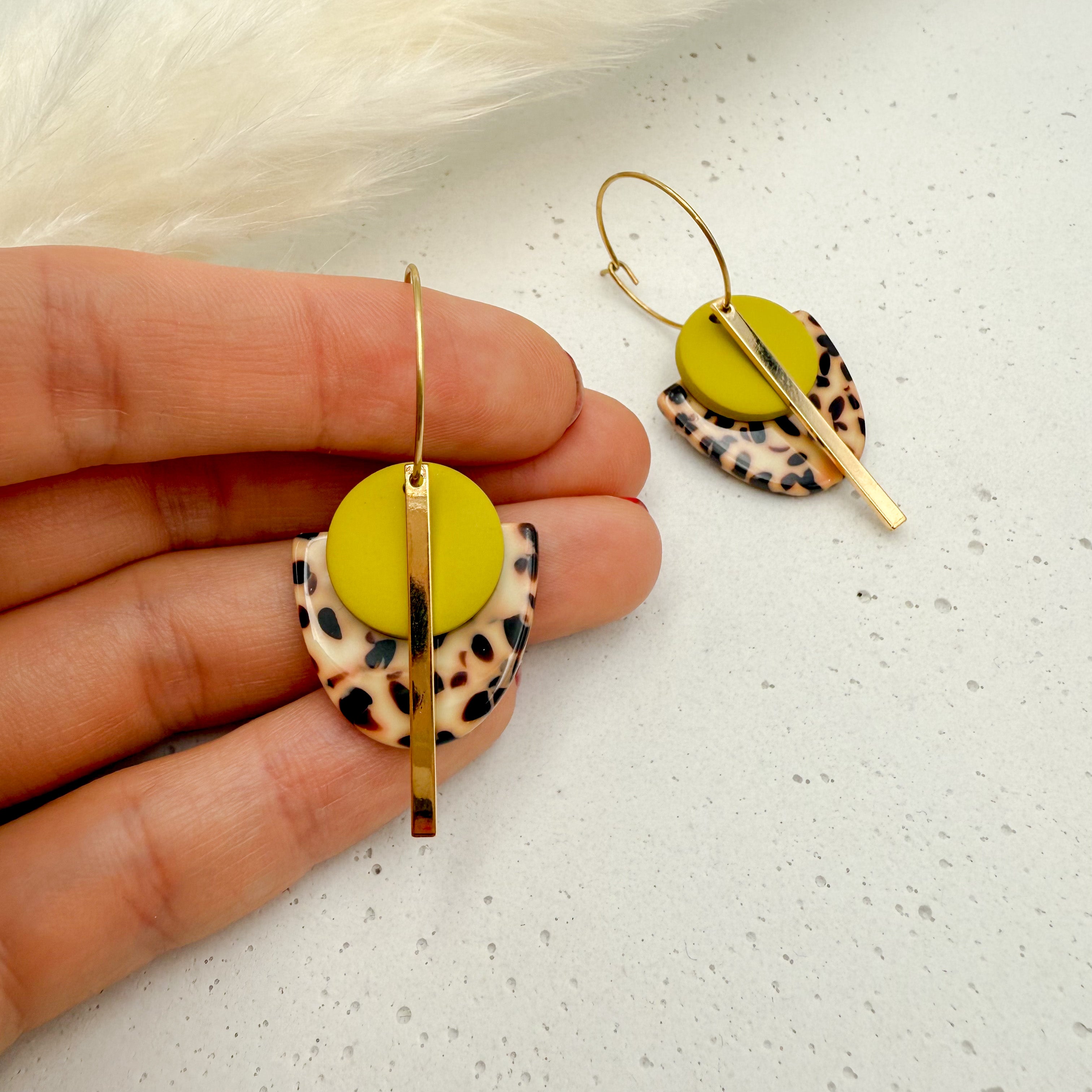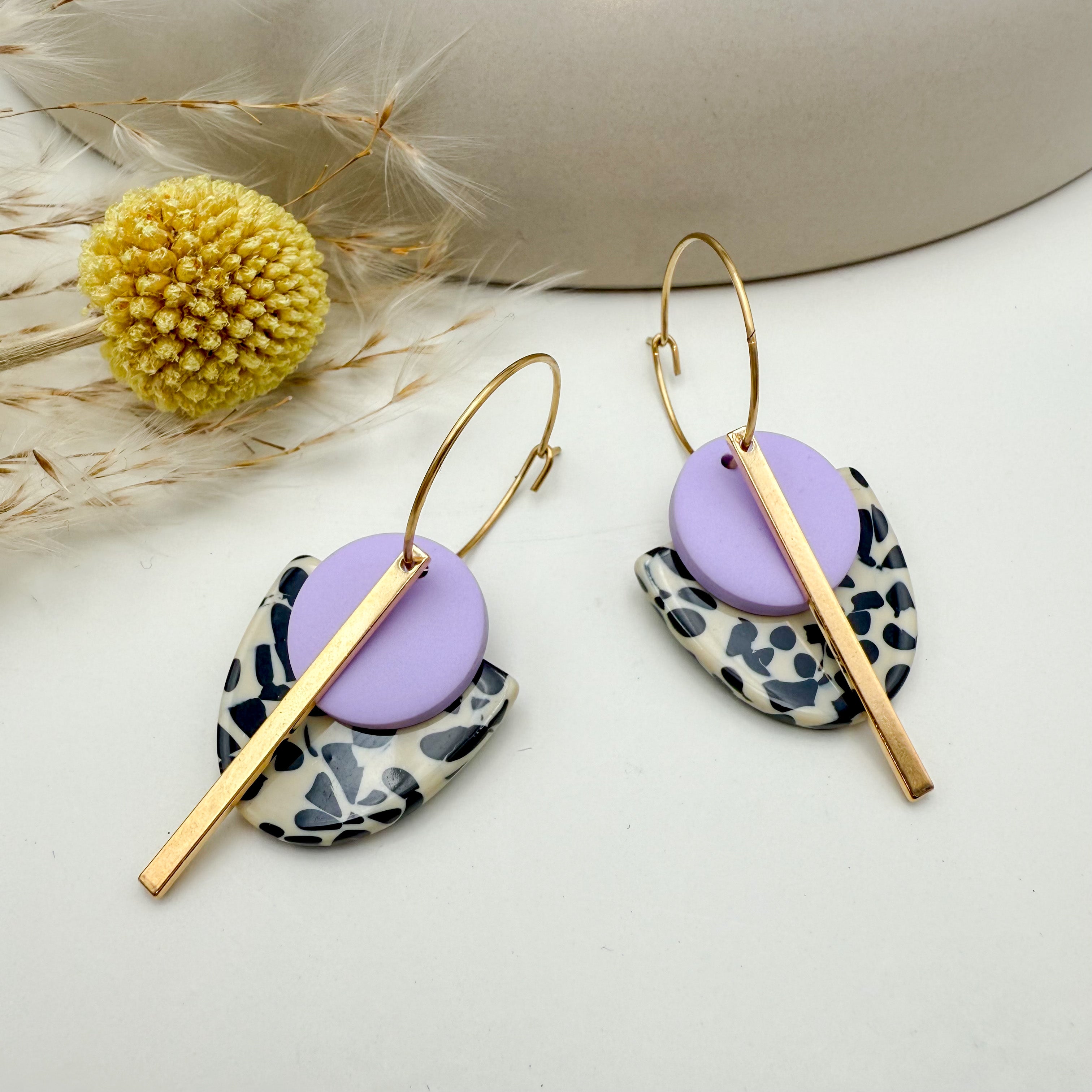 Stilvolle Creolen Tala mit Goldstab und Acetat & Polymer Clay Anhängern von Vagabundobjects.