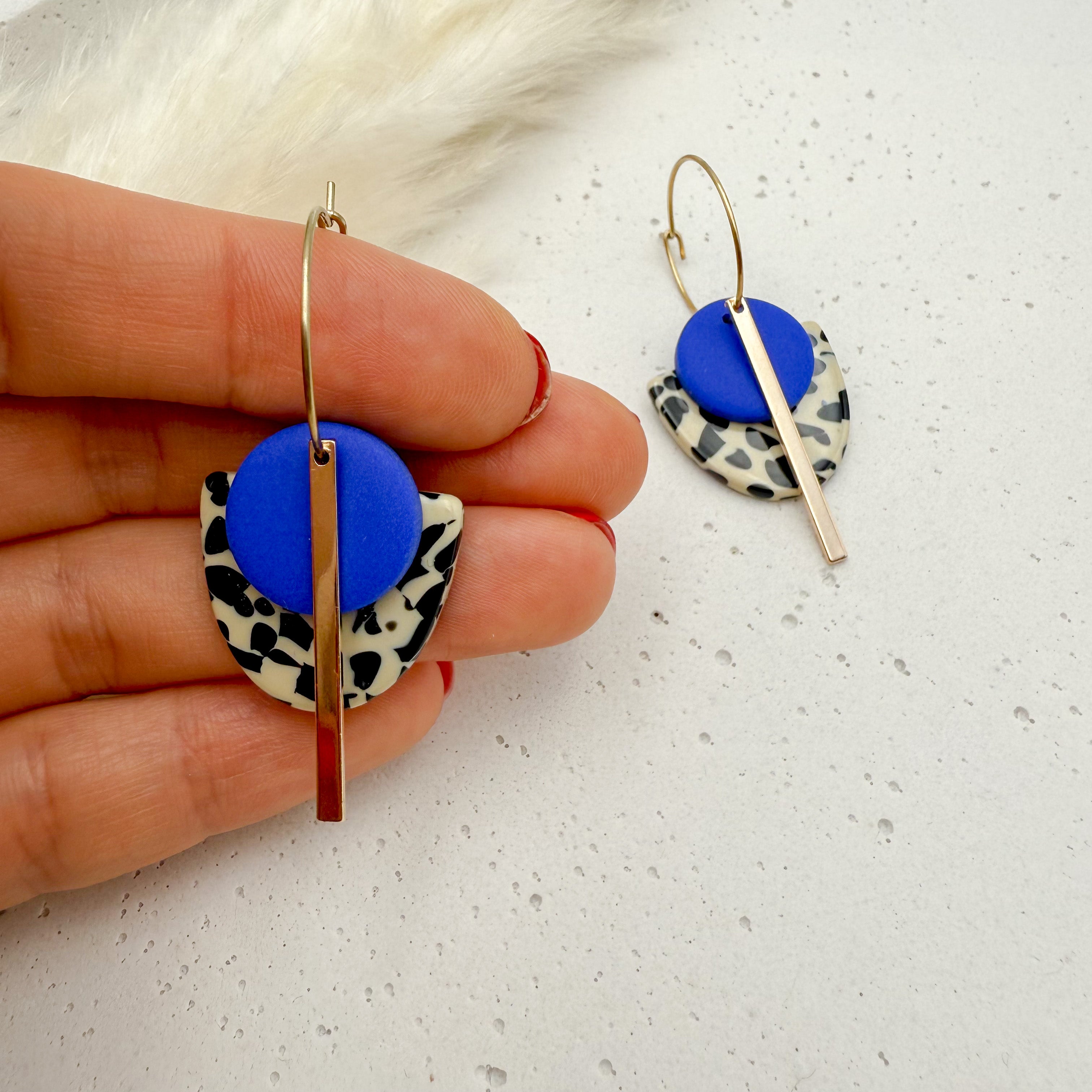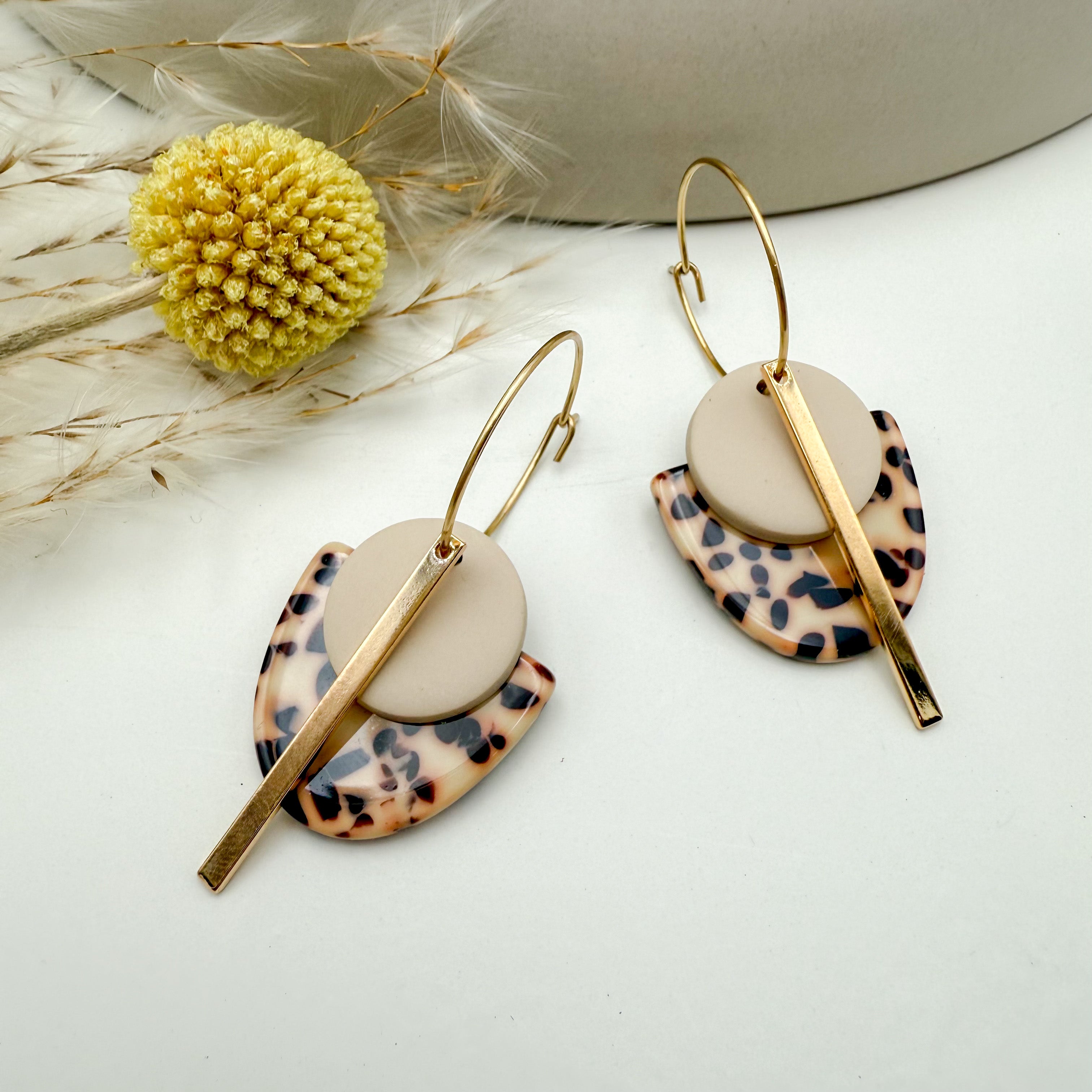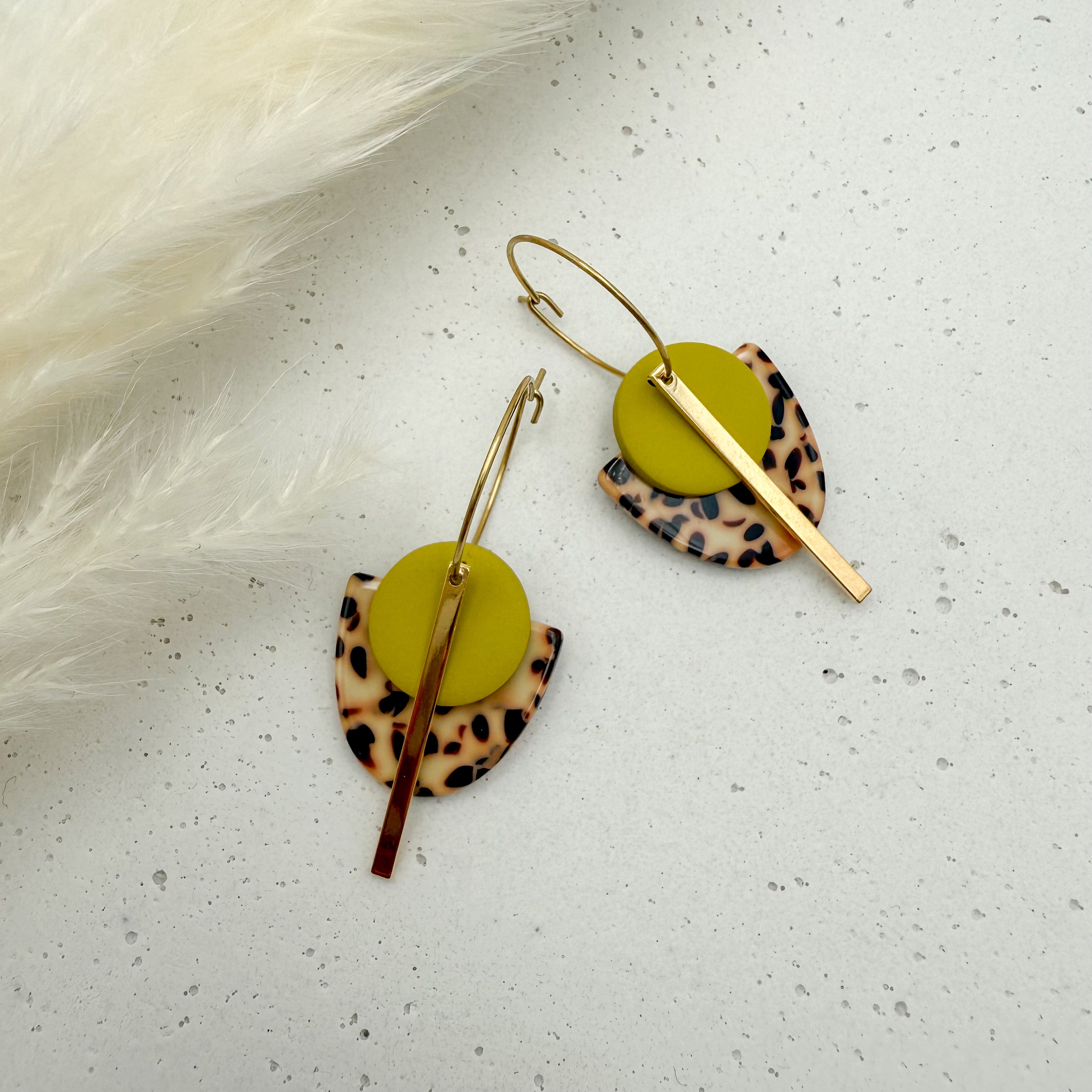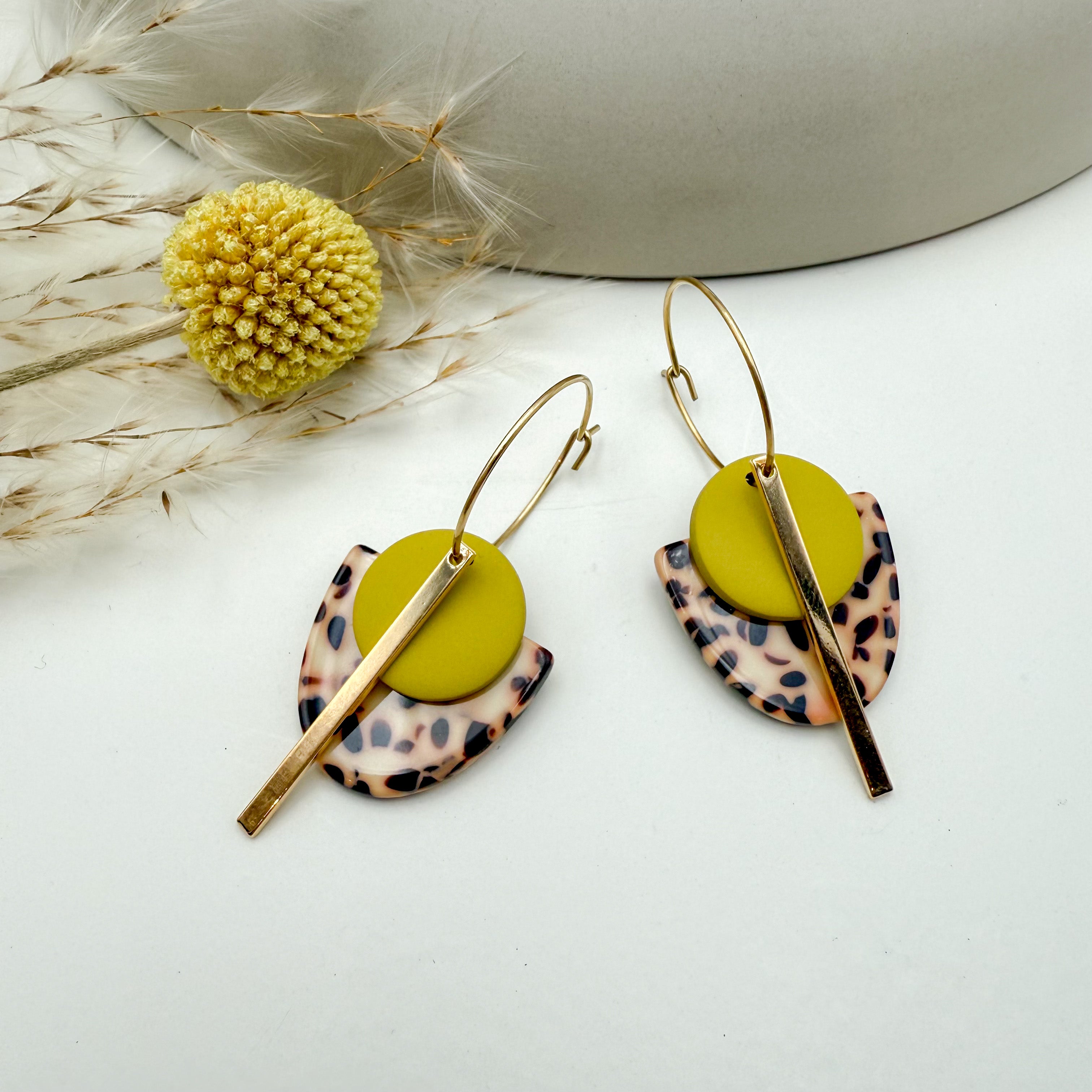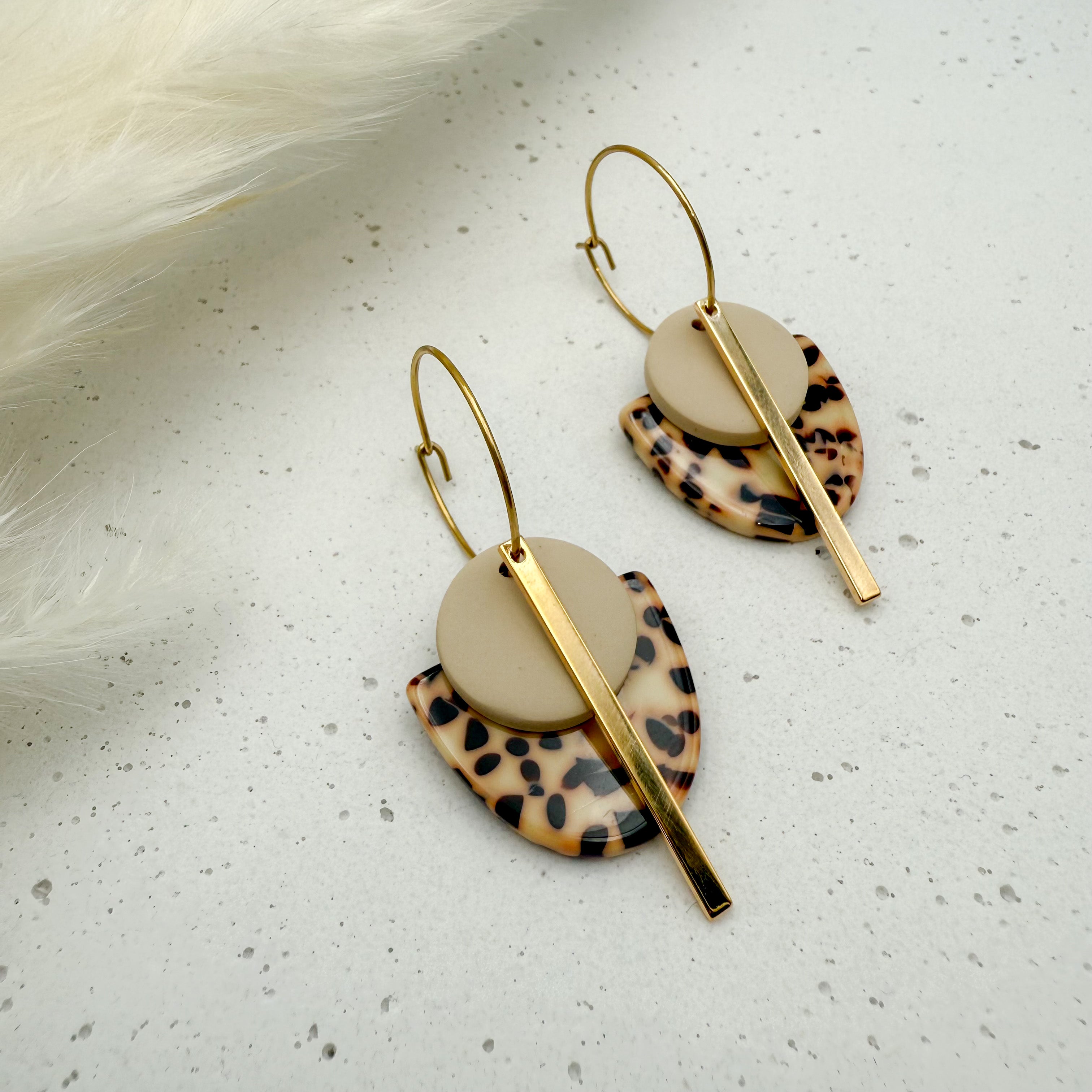 Stilvolle Creolen Tala mit Goldstab und Acetat & Polymer Clay Anhängern von Vagabundobjects.