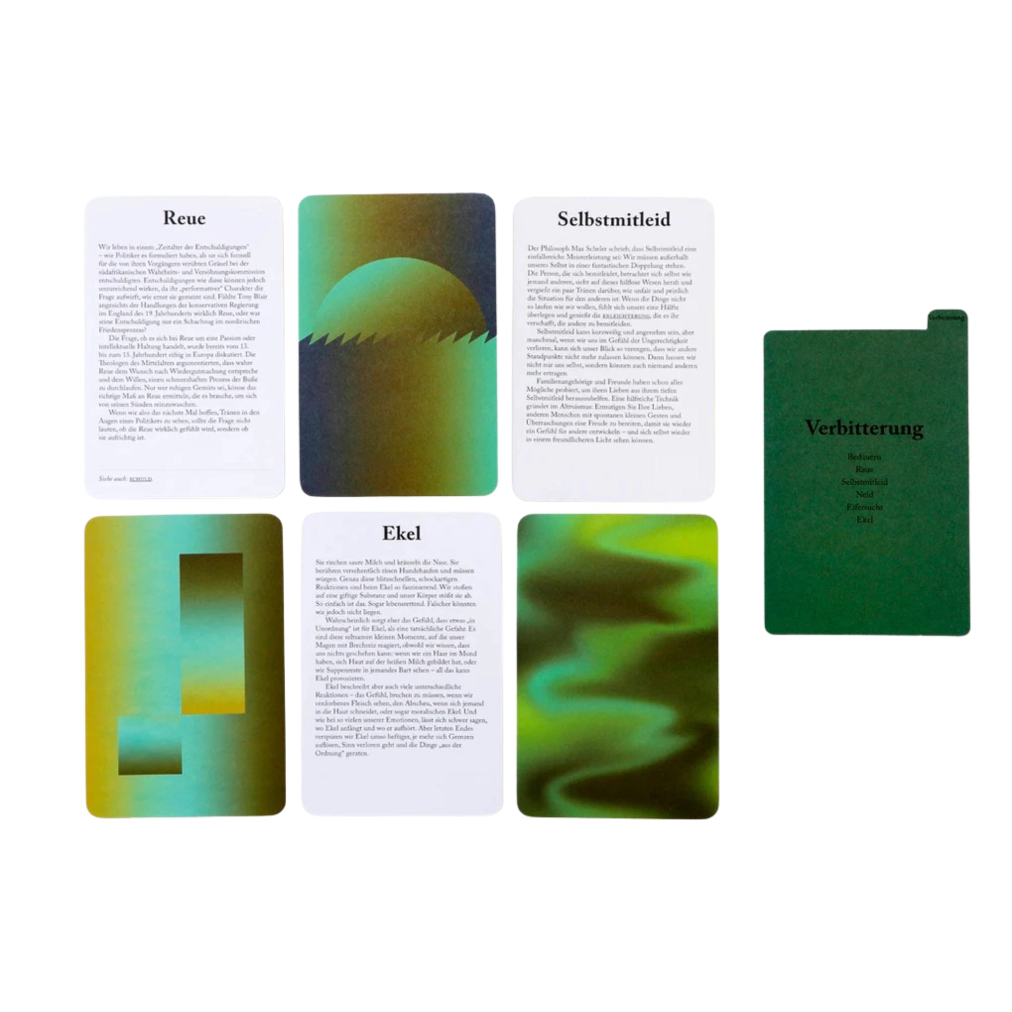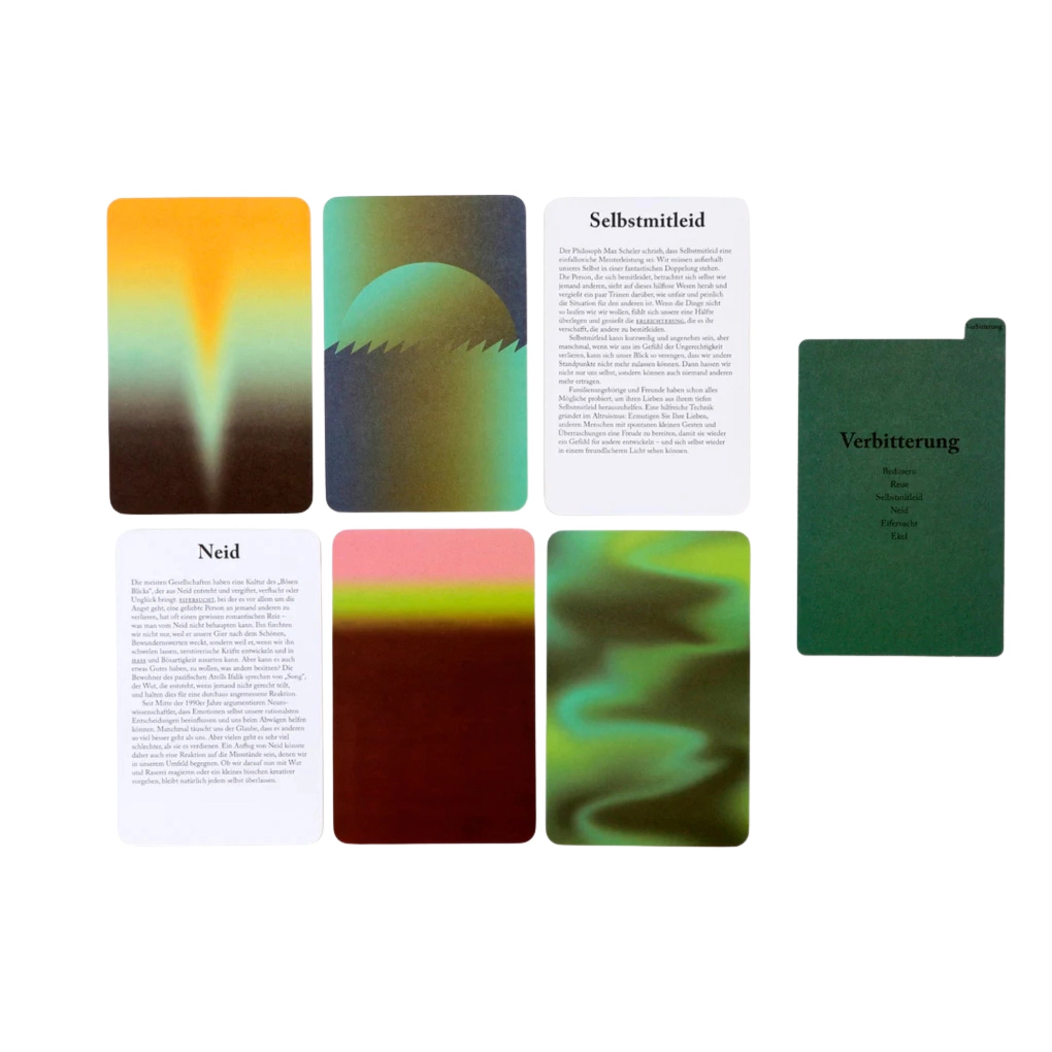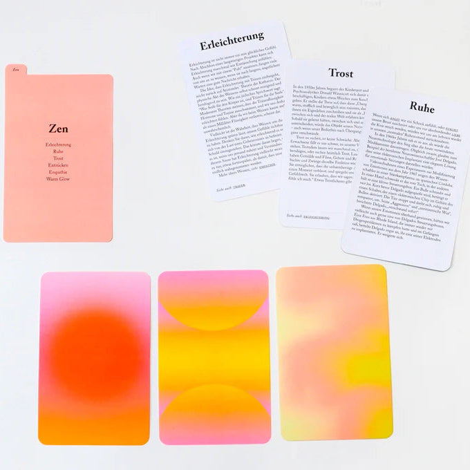 • Design: Jede Karte zeigt auf der einen Seite eine Emotion in Textform und auf der anderen einen Farbverlauf zur Visualisierung 🌈
