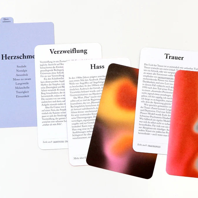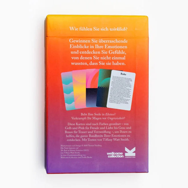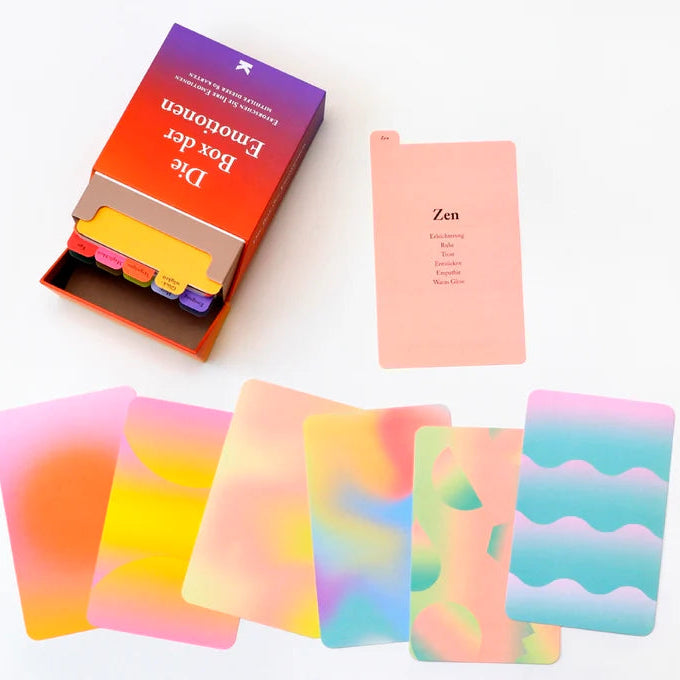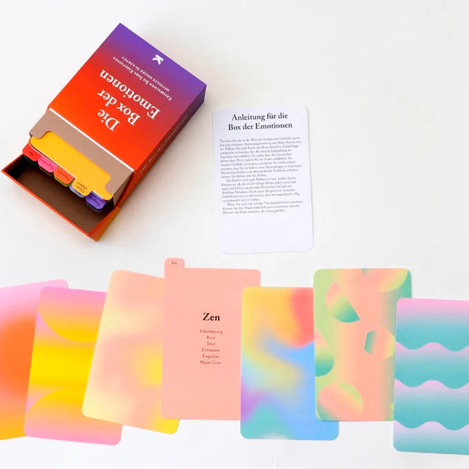 Mit Die Box der Emotionen findest du immer den passenden Ausdruck für deine aktuelle Stimmung und lernst Emotionen kennen, von denen du bisher vielleicht nichts wusstest. Jede Karte kombiniert Text und Farbe, um Gefühle erlebbar zu machen – von bekannten Emotionen wie Wut oder Mut bis hin zu kulturell einzigartigen Gefühlen wie Awumbuk, Fado oder Lítost.