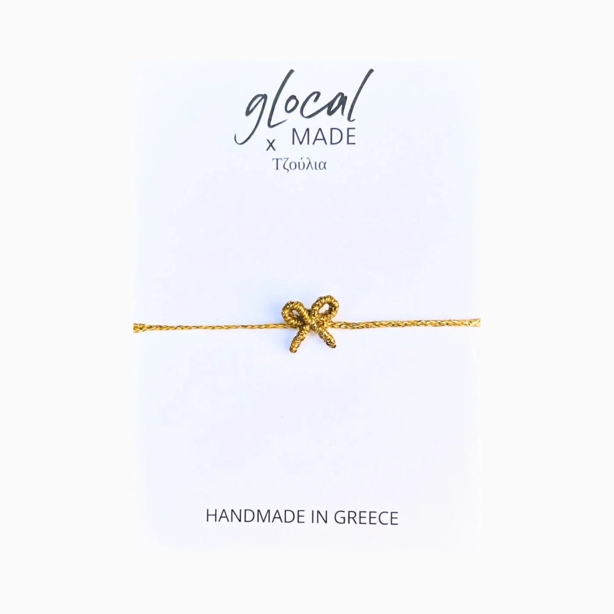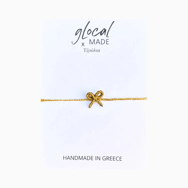 Setze ein stilvolles Statement mit dem Makramee-Armband „Schleife“ von glocal Made. Diese handgefertigte Schönheit aus Griechenland vereint Eleganz, Minimalismus und mediterranen Charme in einem filigranen Schmuckstück. Die goldene Schleife steht für Anmut, Freude und Zusammenhalt – ein Symbol, das kleine Momente des Alltags besonders macht.