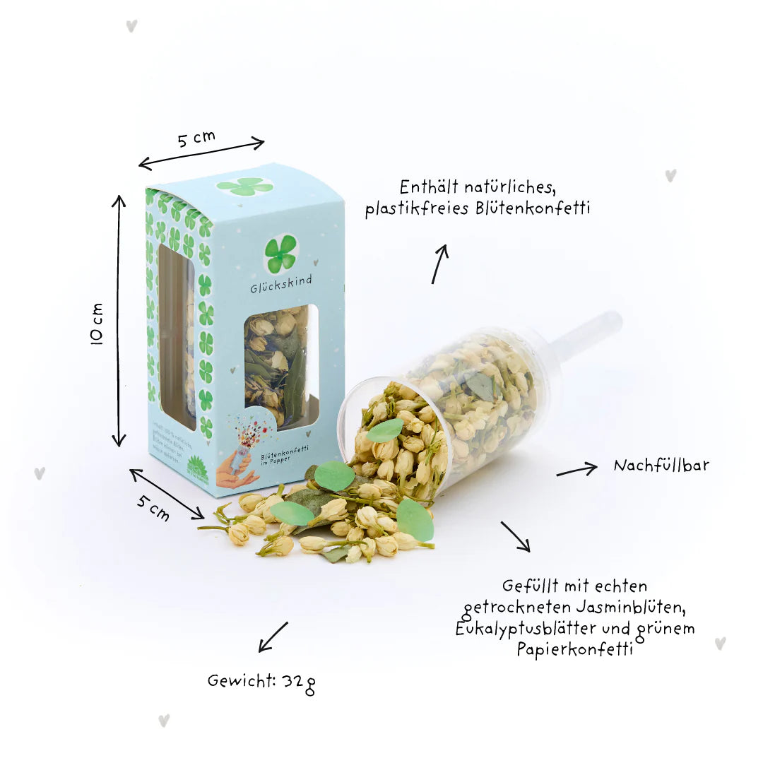 Einmal kräftig auf den Popper schlagen und schon regnet es Naturkonfetti. Kein Feuerwerk, kein Knall, sondern ein leises, liebevolles „Schau mal, das Leben darf gefeiert werden.“ Perfekt für Fotoshootings, kleine Botschaften oder als unerwarteter Glückskick im Alltag.