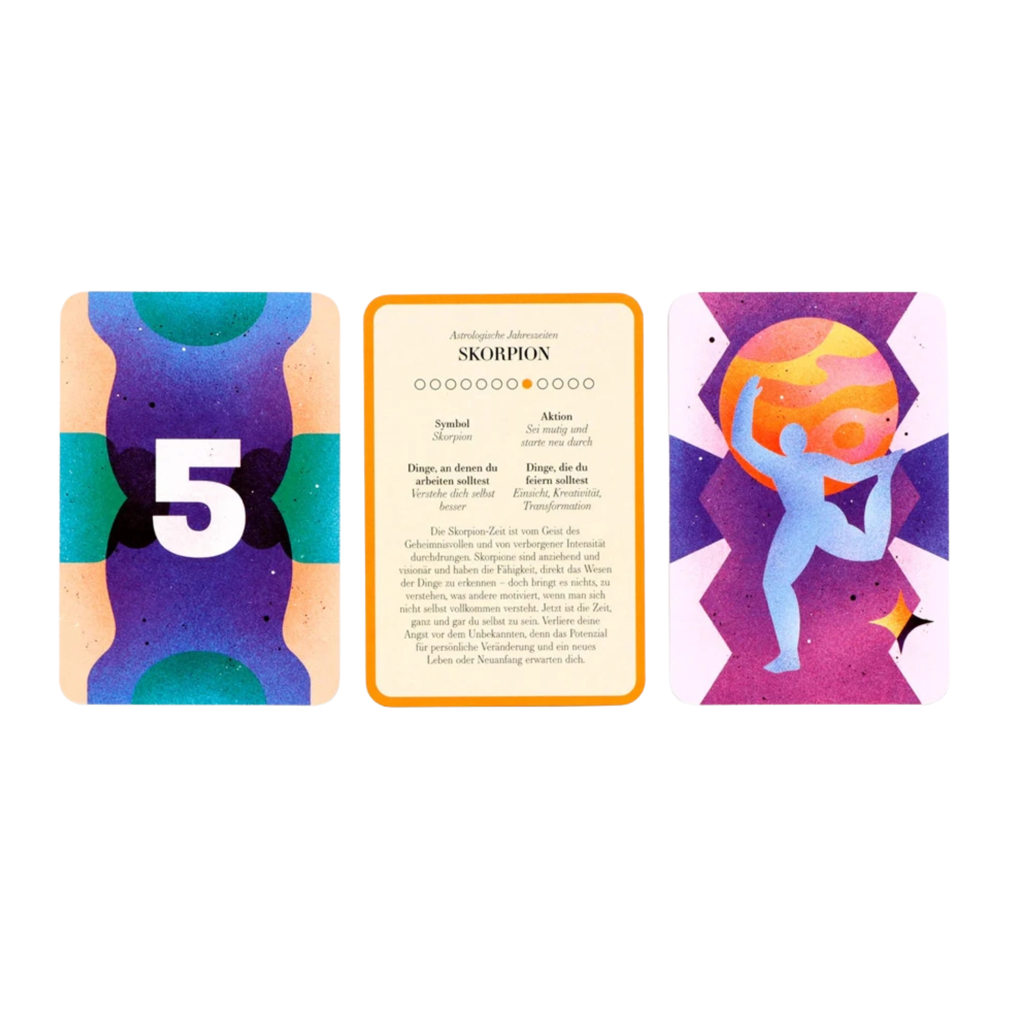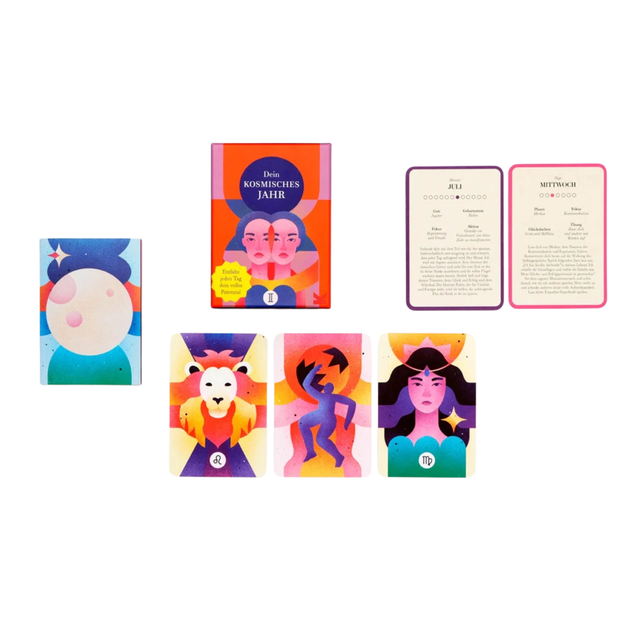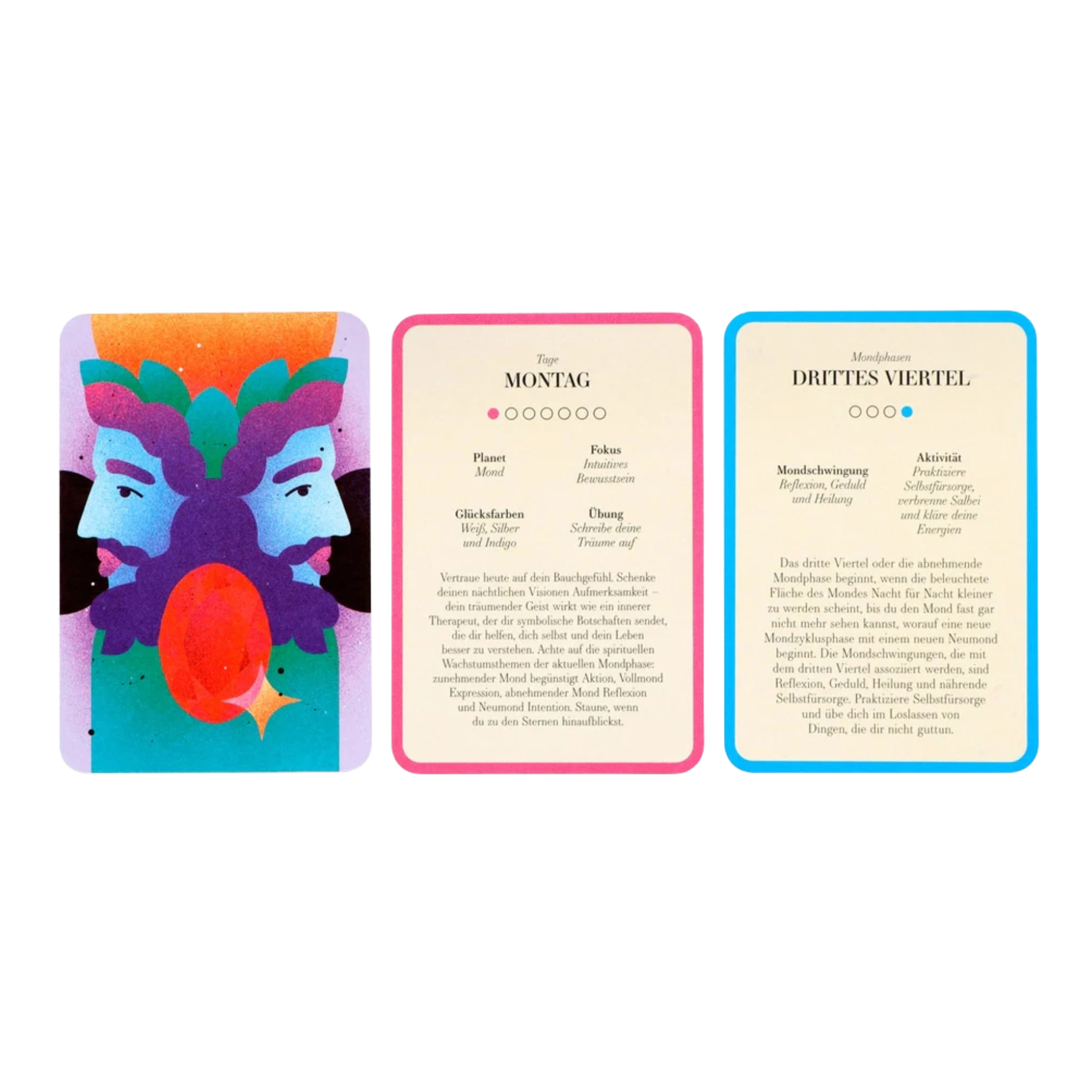 - Design: Jede Karte zeigt das Potenzial eines Tages, inklusive Astrologie, Mondphasen und Energiehinweisen 🔮