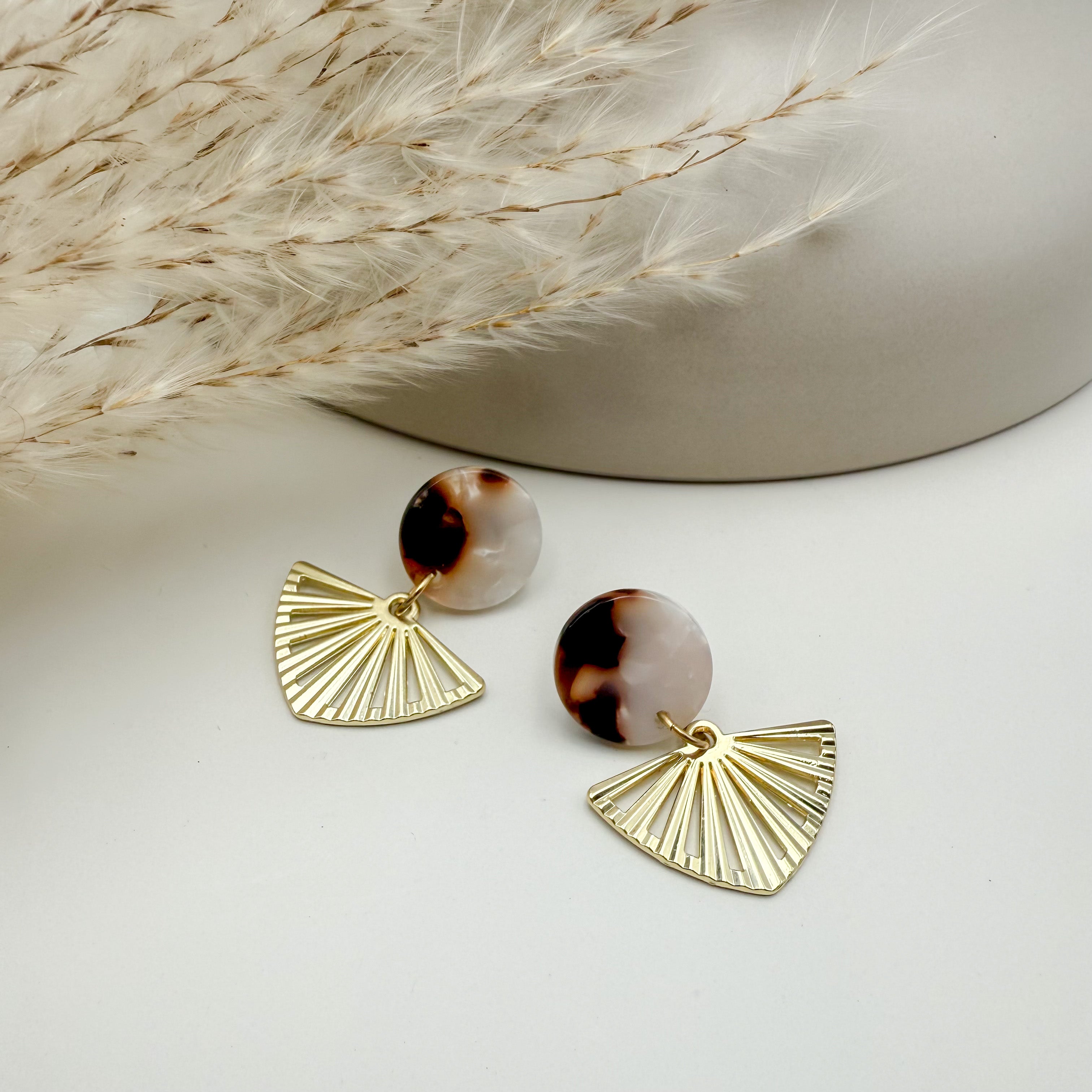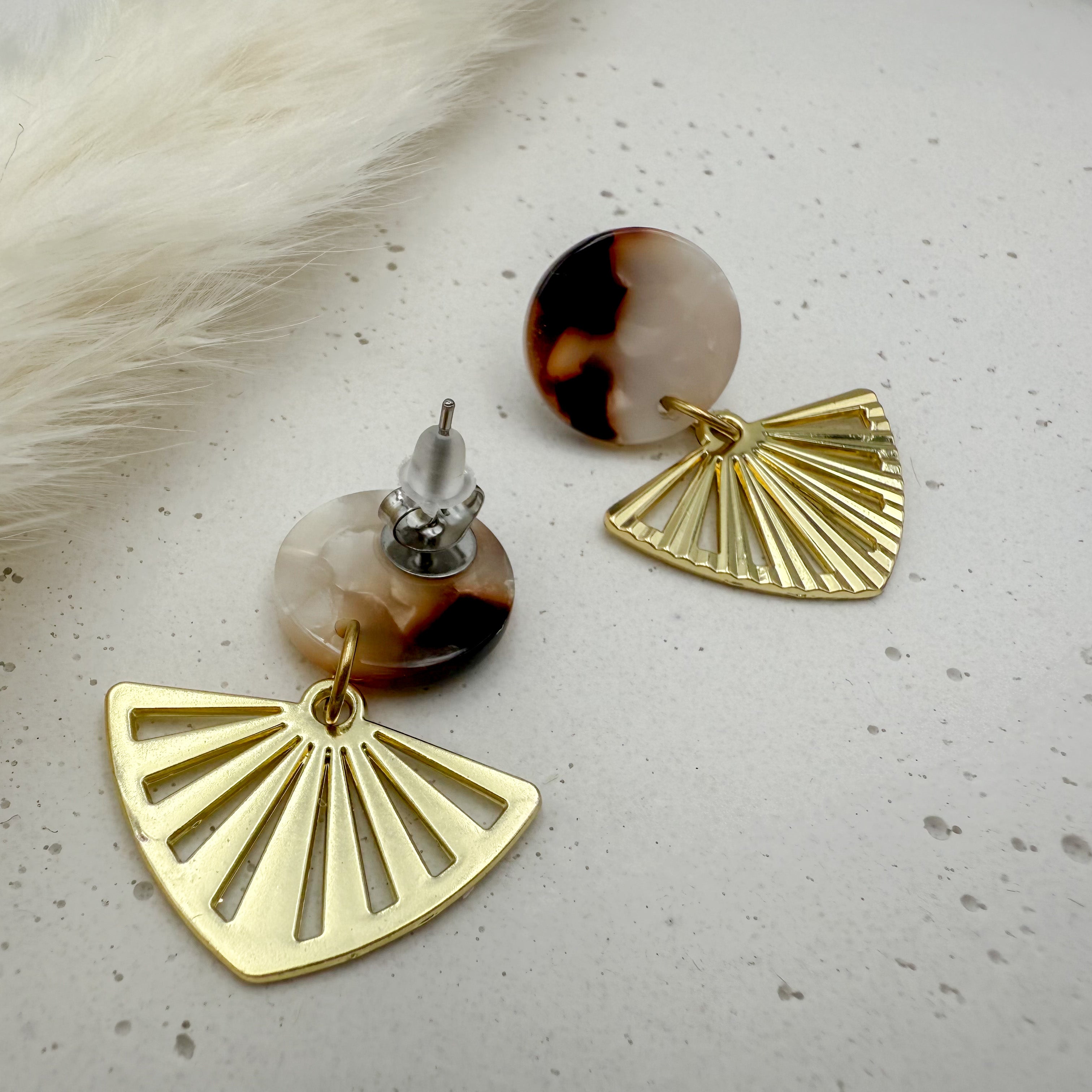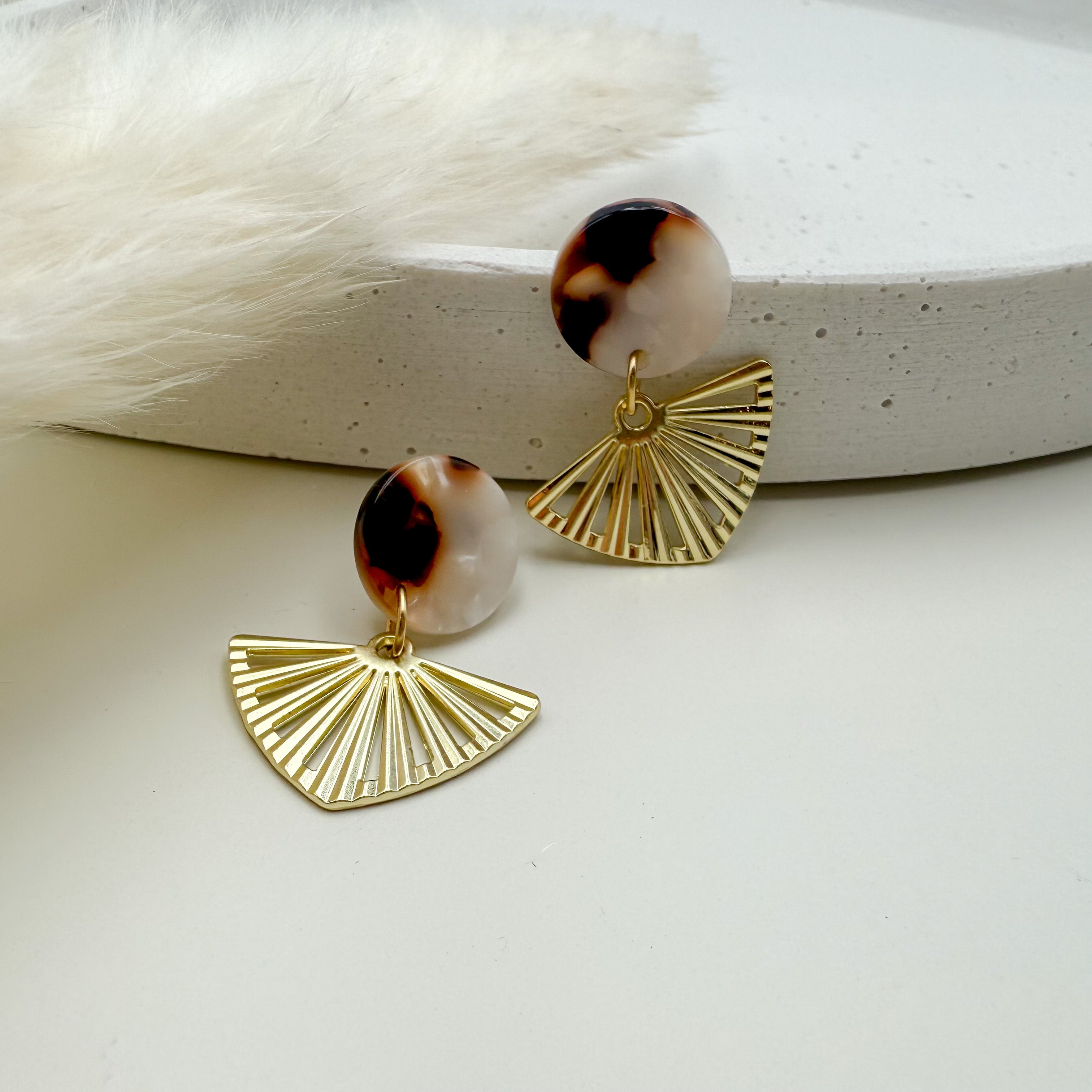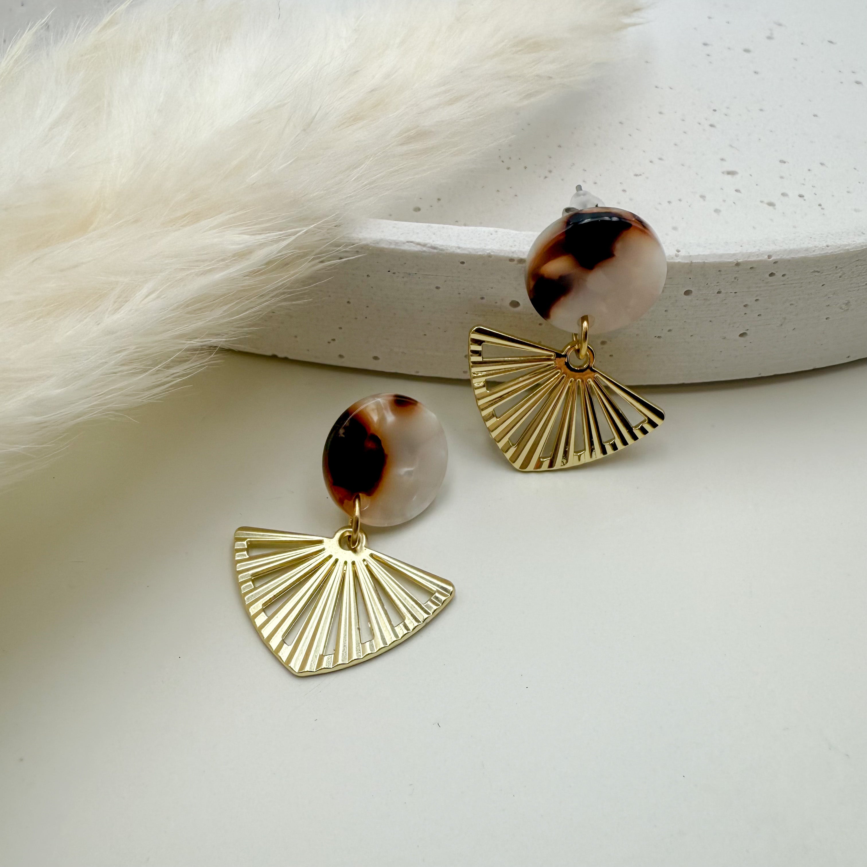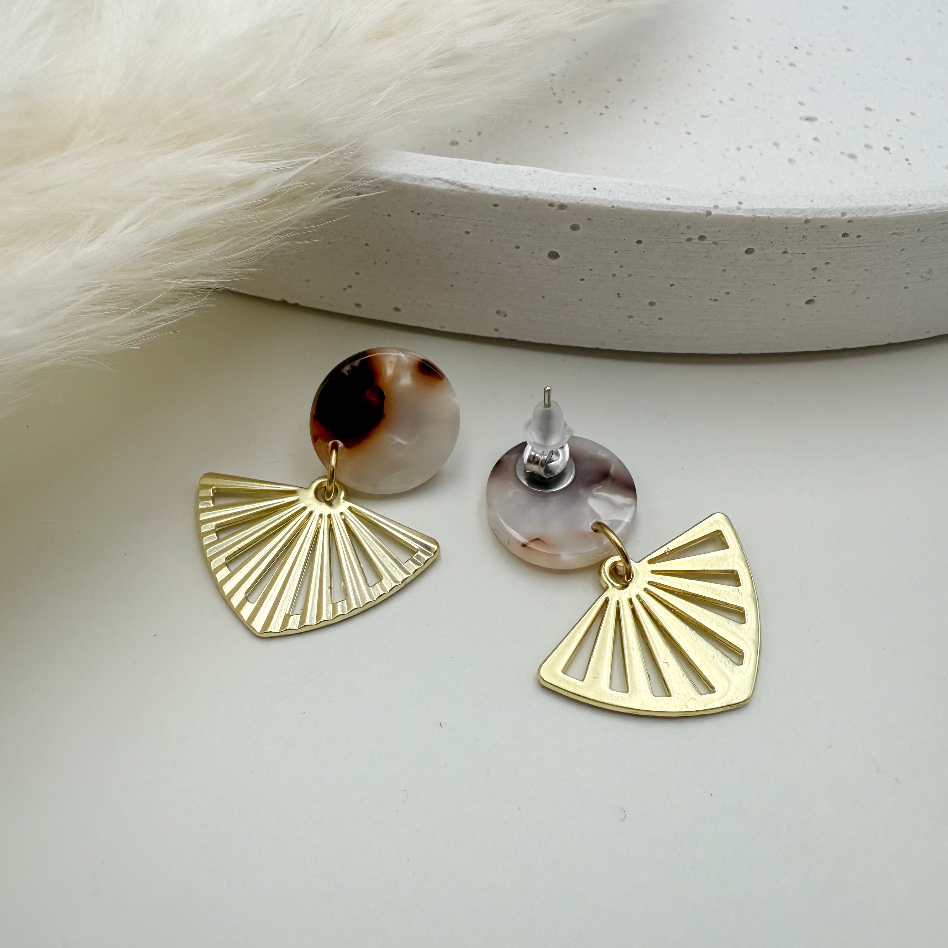 Stilvolle Ohrstecker Niva mit Kopfteil aus Acetat und Anhänger aus vergoldetem Messing von Vagabundobjects.