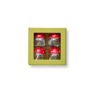 In dieser liebevoll gestalteten Pralinenschachtel verbergen sich vier klassische Glückspilze aus feiner Vollmilchschokolade – sauber aufgereiht, mit silbernem Füßchen und roter Kappe. Ein zeitloses Symbol für Glück, Freude und gute Wünsche.